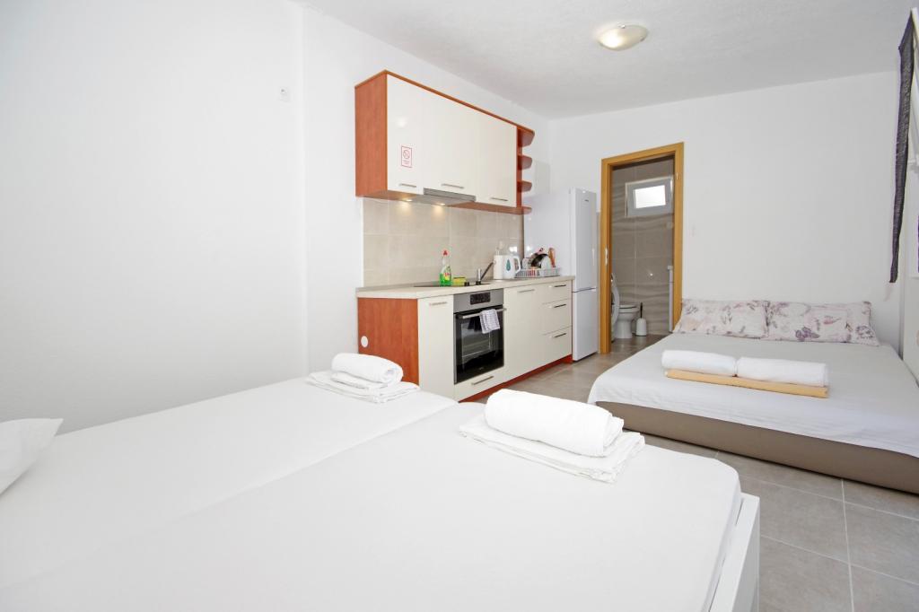 Studio apartment for rent 4 persons 24 square meters (prefabricated low energy house) in Živogošće-Blato MAKARSKA RIVIERA on the beach 10 meters from the sea the studio is newly decorated with a large kitchen large double bed also has the possibility of a sofa bed so it is suitable for more one younger person up to 15 years or two less up to 12 years. The studio is rented from 1. 6-30. 9. Živogošće-Blato is a beautiful small place with large sandy beaches and pine shade, ideal for family tourism for families with small children, the place has a rich tourist content Marina-Lučica for the berth of smaller boats and speedboats boats and canoes in the place can be rented the same speedboats boats and canoes, there are organized trips to the islands of Hvar, Korcula tourist wooden boat, etc. Within 70 meters from the Studio Apartments there are 4 restaurants 3 cafes and a grocery store