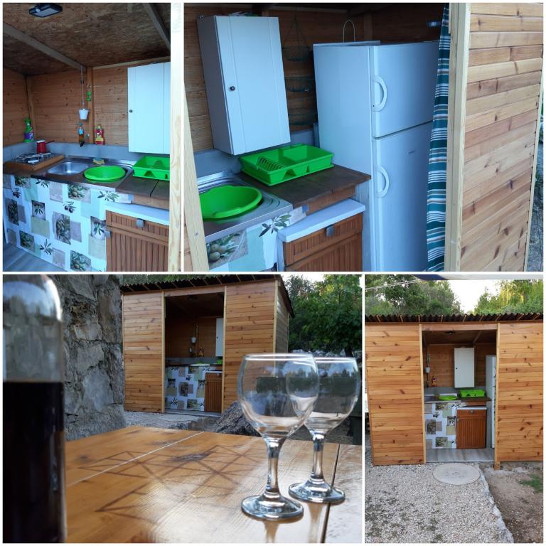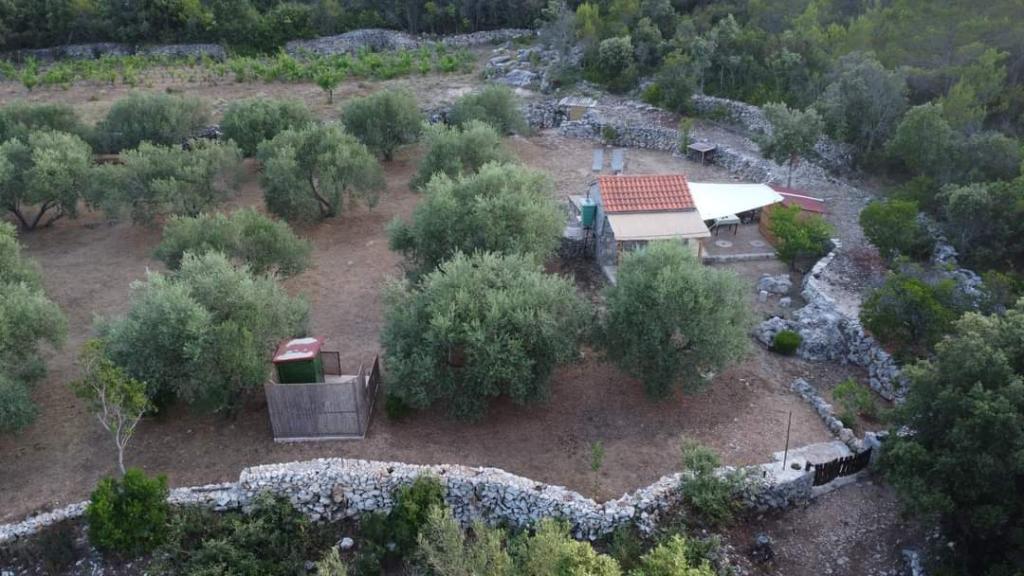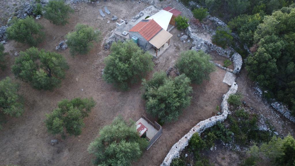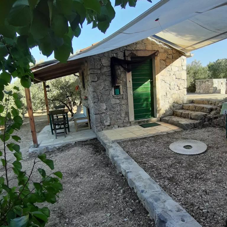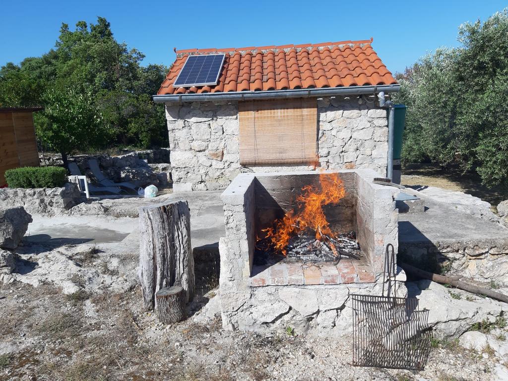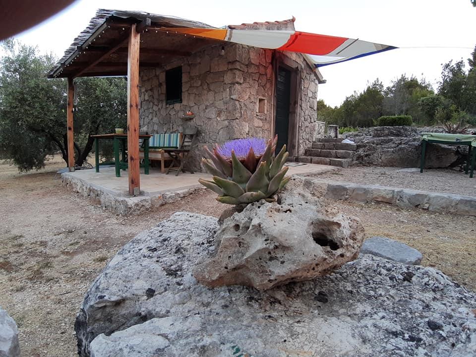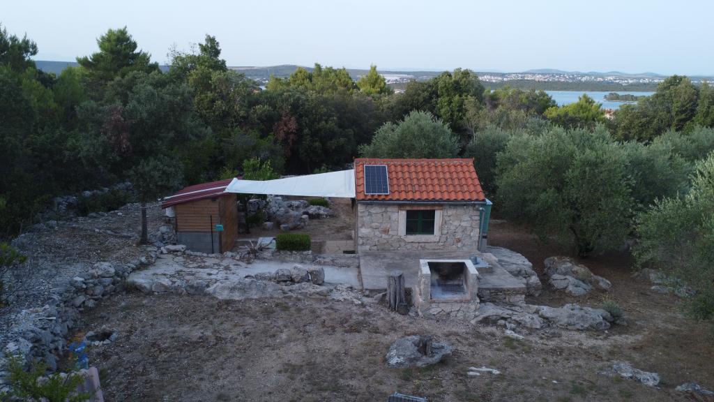 The house is located on the northern side of the island of Pašman, near the town of Pašman. From the main road where you can leave your car, there is a 300m easy ascent hiking trail to the house. House with one room of 8m2 equipped with minimal furniture. On the north side there is a covered terrace for protection from the sun and rain, while on the south side it is open for sunbathing. The plot of 3300m2 is a landscaped olive grove and vineyard with several fruit trees. Electricity from the solar system is 220v only for lighting and charging mobile phones. The use of large consumers such as toasters, kettles, hair dryers, etc. is prohibited. The kitchen is a separate unit from the house, equipped with a gas stove and a gas refrigerator/freezer, dishes and a sink with running water heated by the sun, the tank must be refilled from the cistern. when used up. There is a wood-burning grill next to the kitchen. The toilet is 15m away from the house, next to which there is an outdoor shower, the water for the same needs to be refilled from the cistern after it is used up (be sparing with water).