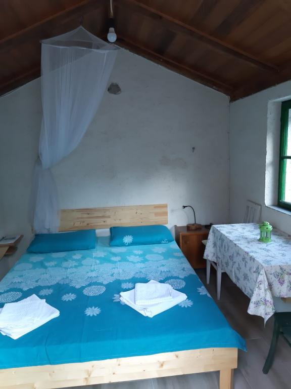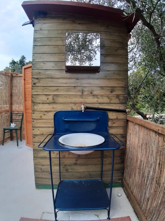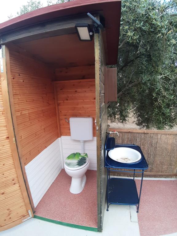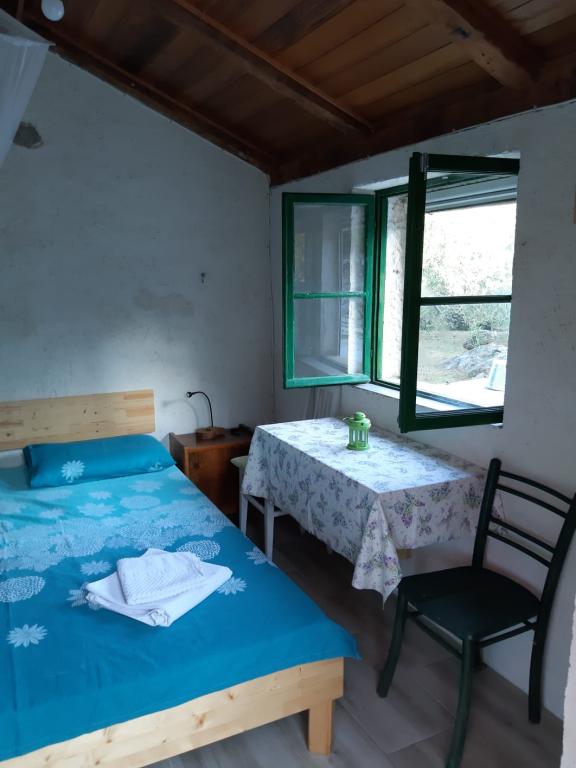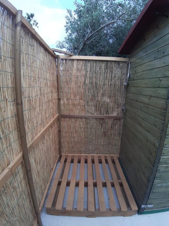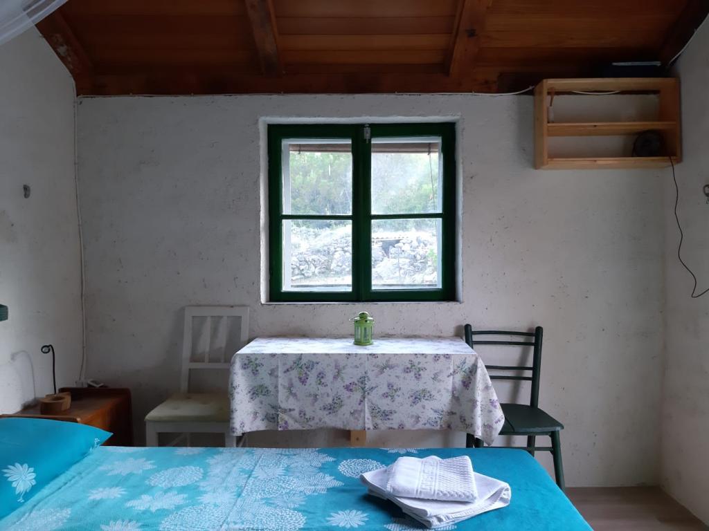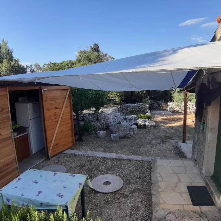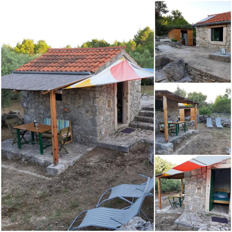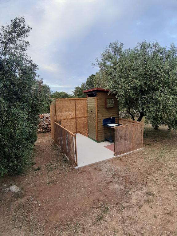 The house is located on the northern side of the island of Pašman, near the town of Pašman. From the main road where you can leave your car, there is a 300m easy ascent hiking trail to the house. House with one room of 8m2 equipped with minimal furniture. On the north side there is a covered terrace for protection from the sun and rain, while on the south side it is open for sunbathing. The plot of 3300m2 is a landscaped olive grove and vineyard with several fruit trees. Electricity from the solar system is 220v only for lighting and charging mobile phones. The use of large consumers such as toasters, kettles, hair dryers, etc. is prohibited. The kitchen is a separate unit from the house, equipped with a gas stove and a gas refrigerator/freezer, dishes and a sink with running water heated by the sun, the tank must be refilled from the cistern. when used up. There is a wood-burning grill next to the kitchen. The toilet is 15m away from the house, next to which there is an outdoor shower, the water for the same needs to be refilled from the cistern after it is used up (be sparing with water).