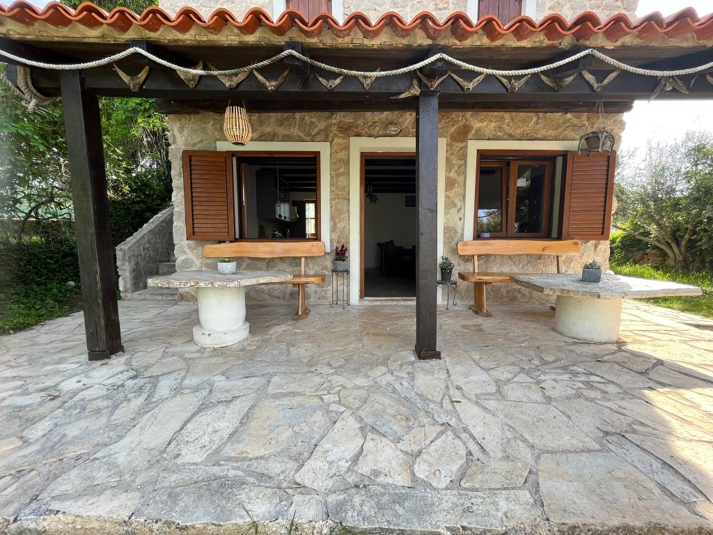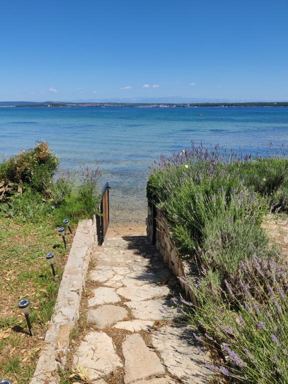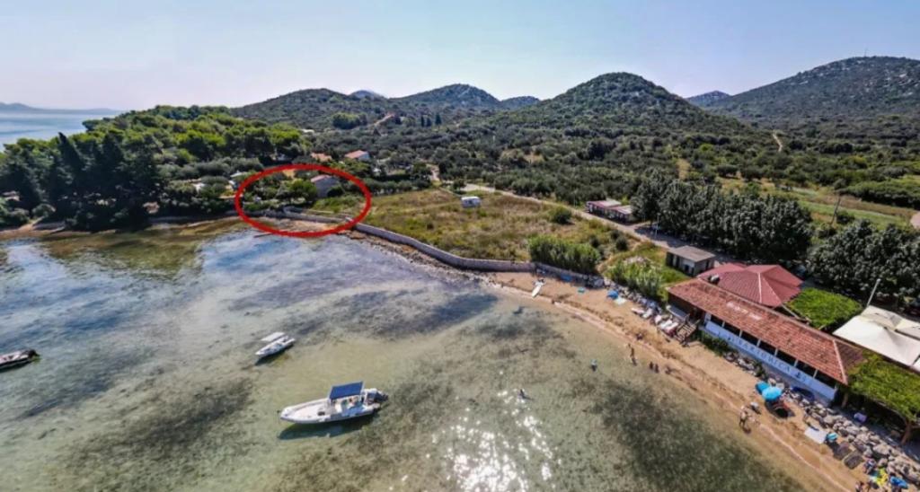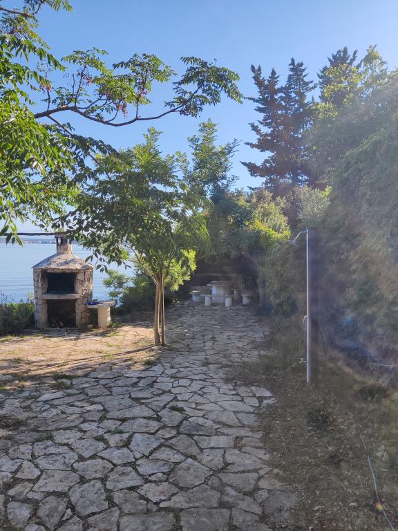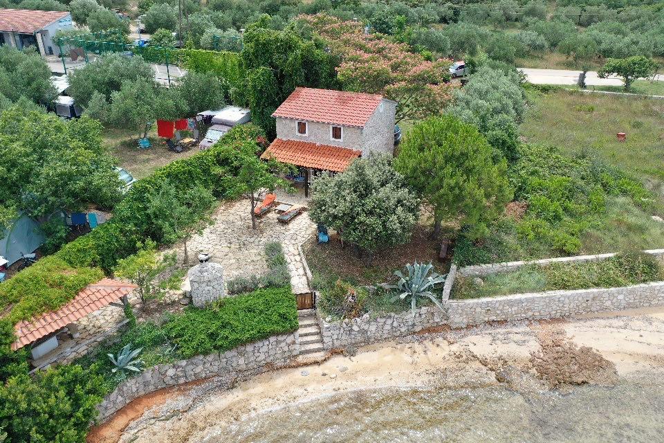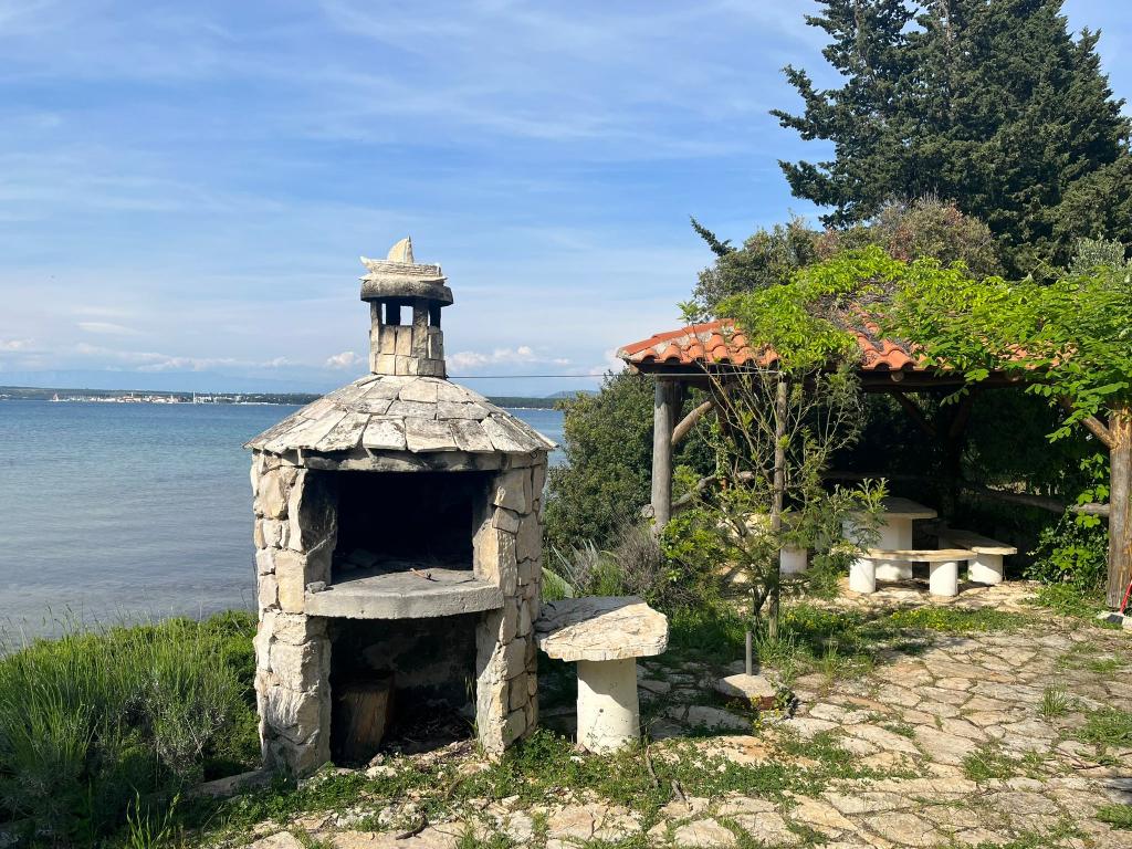 The house is located south of the center of Tkon on the island of Pašman, right next to the road. You can drive through the gate and park your car right next to the house. Next to the house is a nudist camp that is hidden from view by climbing plants. The first building on the other side is 50m away. The house is located 10m from the sea and sandy beach. The sea is about half a meter deep with a sandy bottom, which is ideal for children. In front of the house is a covered wooden terrace with a table and benches where you can enjoy the shade and have lunch, and right next to it is a stone grill. There is also a canopy right in front of the house that provides shade. There is an outdoor shower on the terrace.