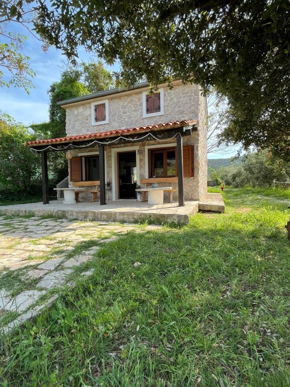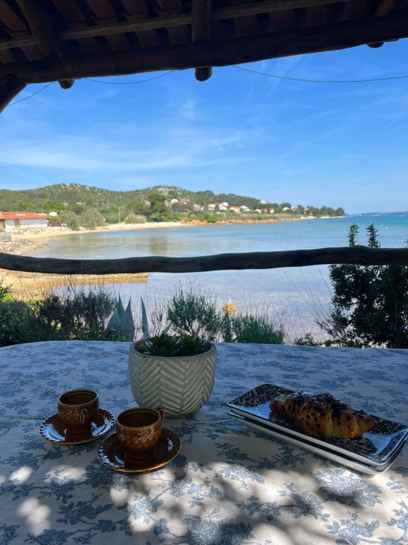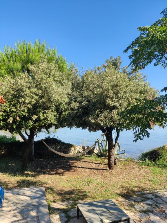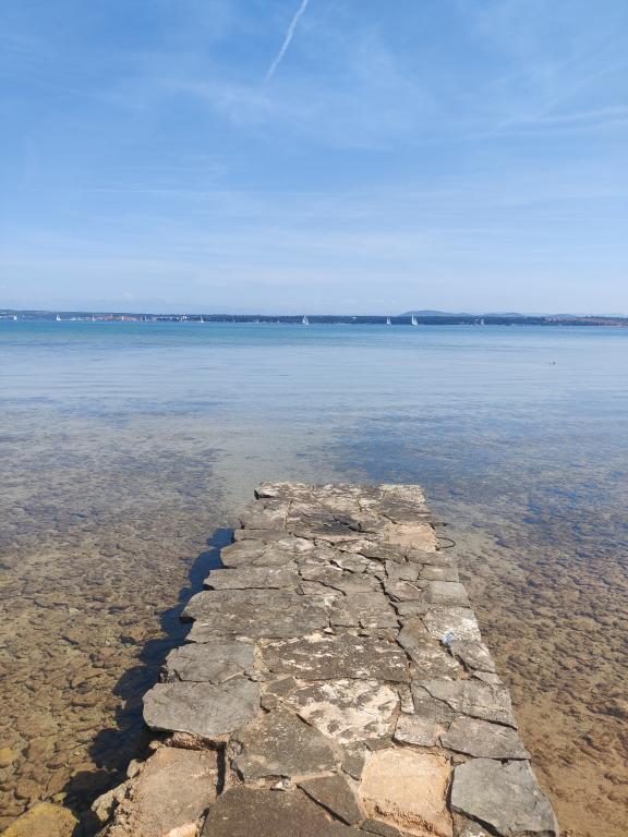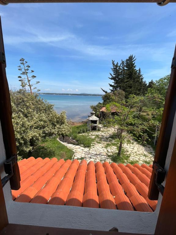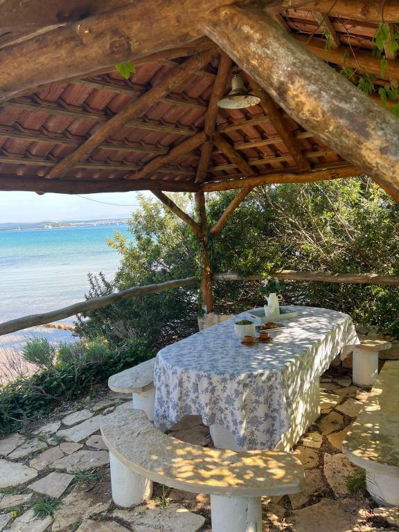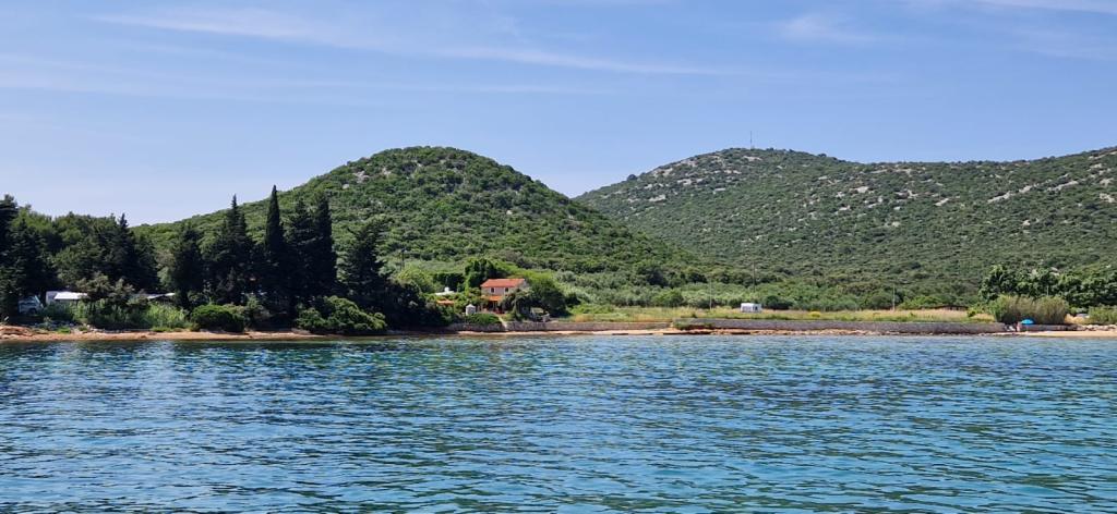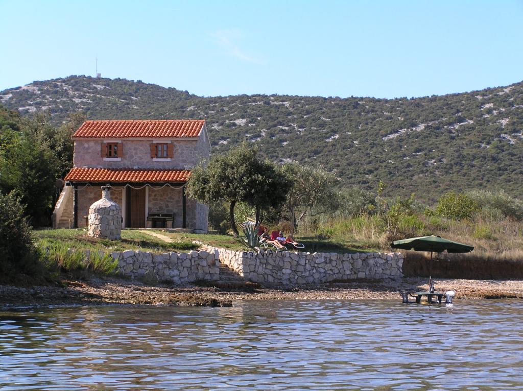 The house is located south of the center of Tkon on the island of Pašman, right next to the road. You can drive through the gate and park your car right next to the house. Next to the house is a nudist camp that is hidden from view by climbing plants. The first building on the other side is 50m away. The house is located 10m from the sea and sandy beach. The sea is about half a meter deep with a sandy bottom, which is ideal for children. In front of the house is a covered wooden terrace with a table and benches where you can enjoy the shade and have lunch, and right next to it is a stone grill. There is also a canopy right in front of the house that provides shade. There is an outdoor shower on the terrace.