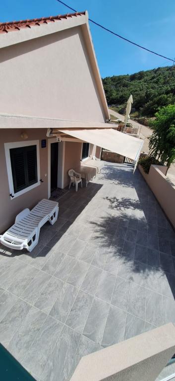 OSKORUŠICA is a beautiful little bay in the central northern part of the island of Hvar, with a view towards Bol on the island of Brač. The house consists of 2 apartments, one for max 5 people, and the other for max 2 people. Both apartments have electricity, water and air conditioning. They are 10 m from the sea and a beautiful pebble beach. The apartment for 5 people consists of a room with a main bed for 2 people, a living room with a sofa bed for 2 people, and a folding bed for a child up to 12 years old. The apartment has a kitchen with a stove, a microwave, and all the necessary utensils for eating and cooking. , fridge (with freezer compartment), TV, air conditioning and a large terrace in front of the apartment, fireplace. It has a bathroom with a shower and a washing machine. Apartment for 2 people consists of one room with a bed for 2 people. The apartment has a mini kitchen with a stove, all the necessary utensils for eating and cooking, a fridge (with a freezer section), TV, air conditioning, terrace, bathroom with shower.