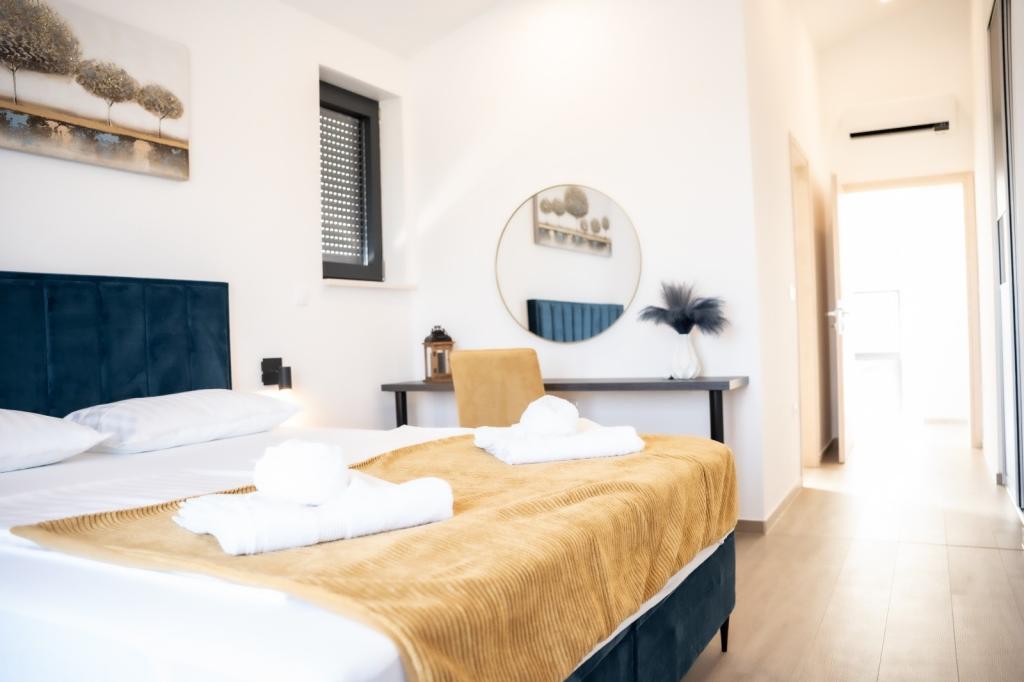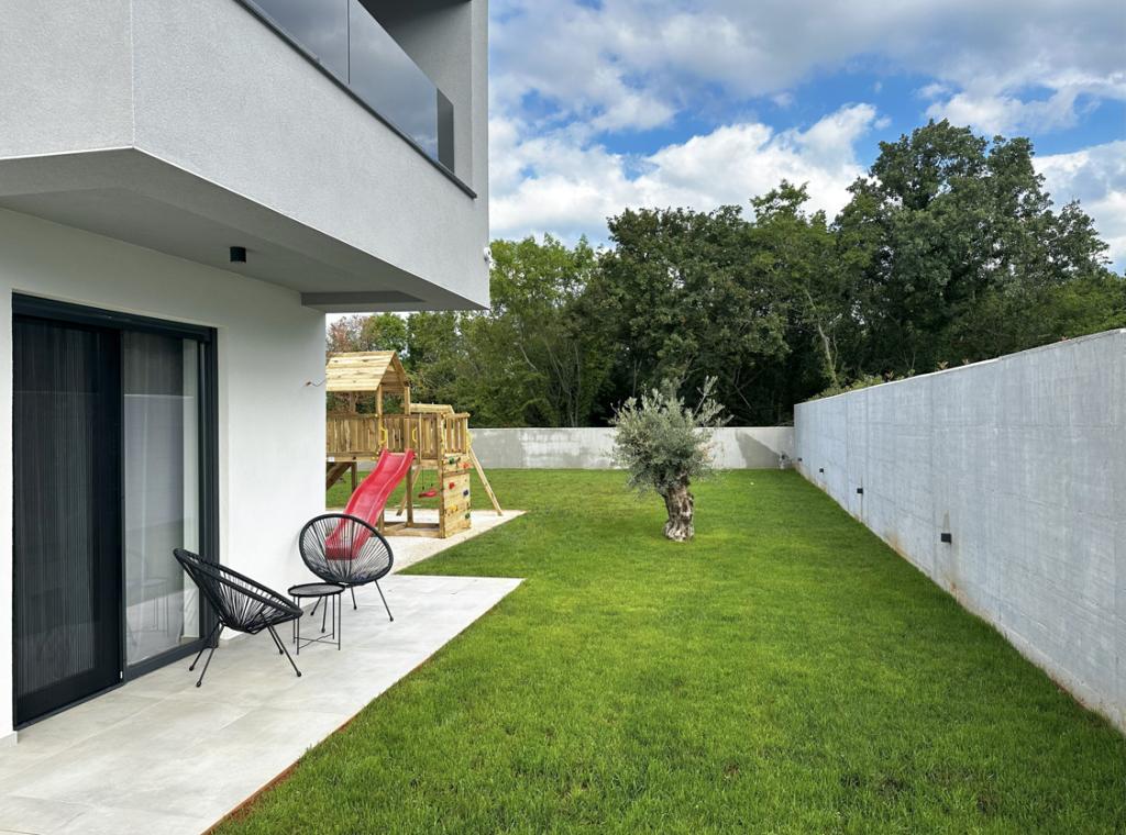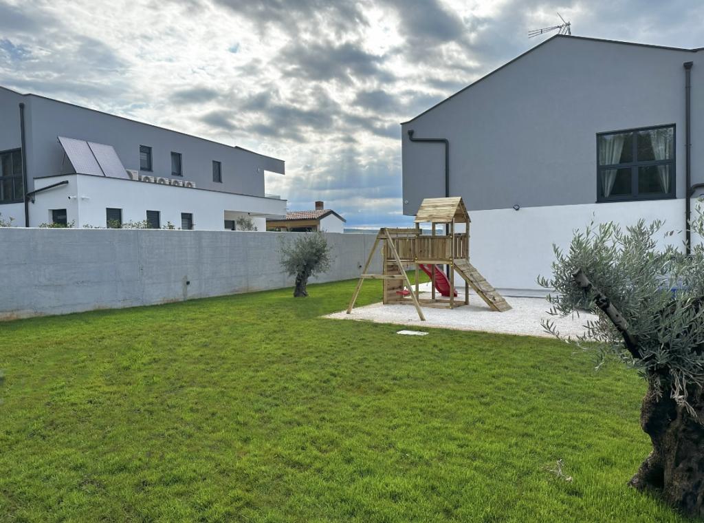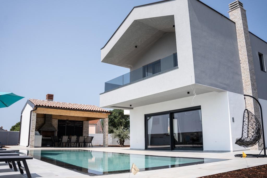 This beautiful villa is located in a very quiet place Rebići, Barban, only 2.5 km from the sea, surrounded by natural beauty and greenery, and as such serves for a carefree and perfect vacation, far from city crowds, noise and traffic. On clear days, you can see the sea from the balcony on the first floor of the house. Each room has its own terrace for moments of privacy and peace when needed. The villa is decorated in a very modern way, giving you the atmosphere and warmth of home, it was built in 2023 in a very modern style and it also contains an outdoor facility with an outdoor kitchen, a fridge and two grills, gas and wood-burning. The environment is specially arranged in a combination of a modern beach around an infinity pool measuring 10 x 3.8 meters and a beautiful lawn decorated with old olive trees and other various plants, creating an oasis for relaxation. in the yard there are deckchairs, umbrellas and additional facilities such as table tennis, table football.
