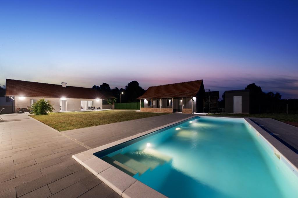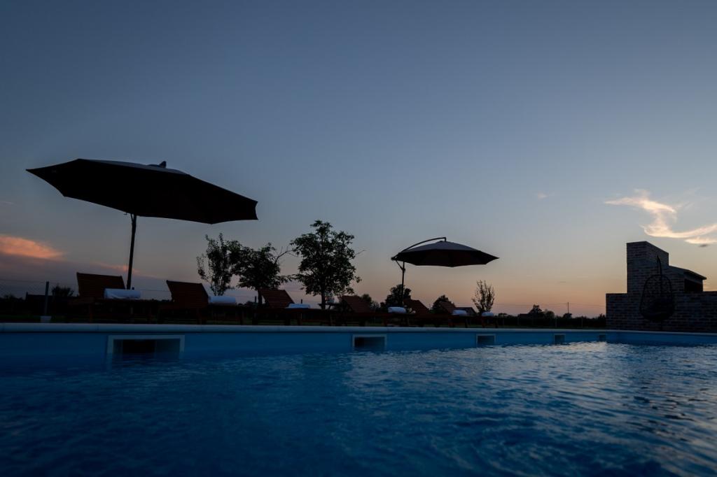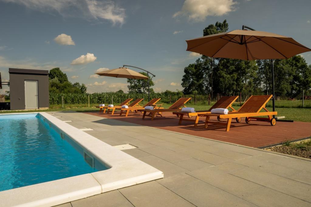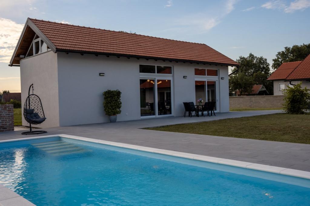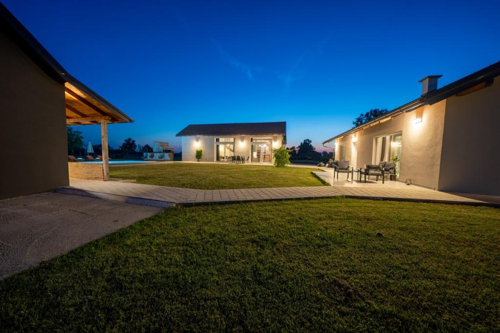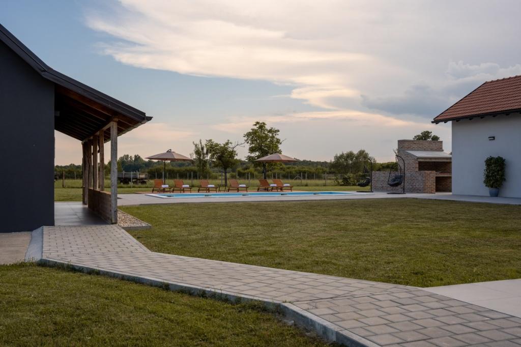 Zelena Oaza is a modernly decorated property with a swimming pool with 3 houses - 2 holiday houses and 1 party house, ideal for a family vacation or a get-together with friends. The maximum number of beds is 8+2. The 4* house consists of 4 double bedrooms, 3 bathrooms, 2 kitchens with all appliances, an outdoor gazebo of 50 m2 with a fishing rod and barbecue equipment and a children's playground. 4 TVs, 6 air conditioners, free parking for 10 cars.