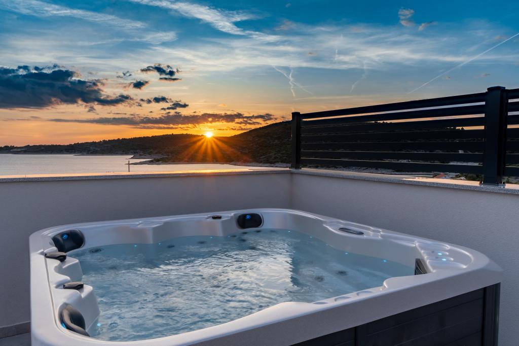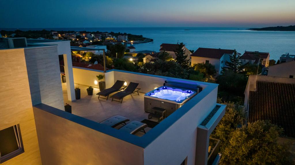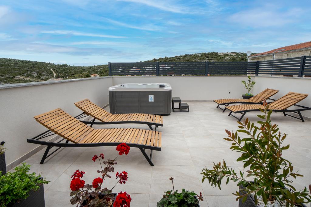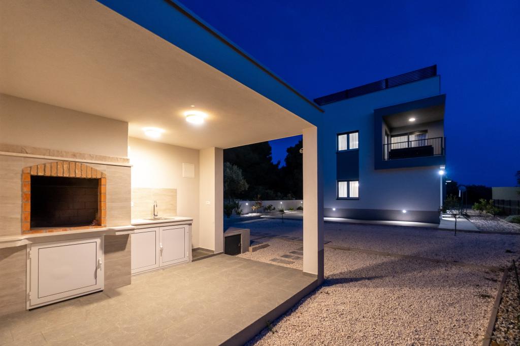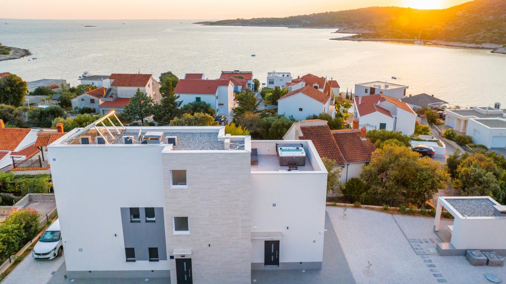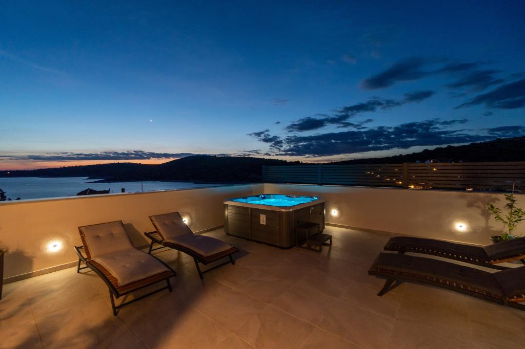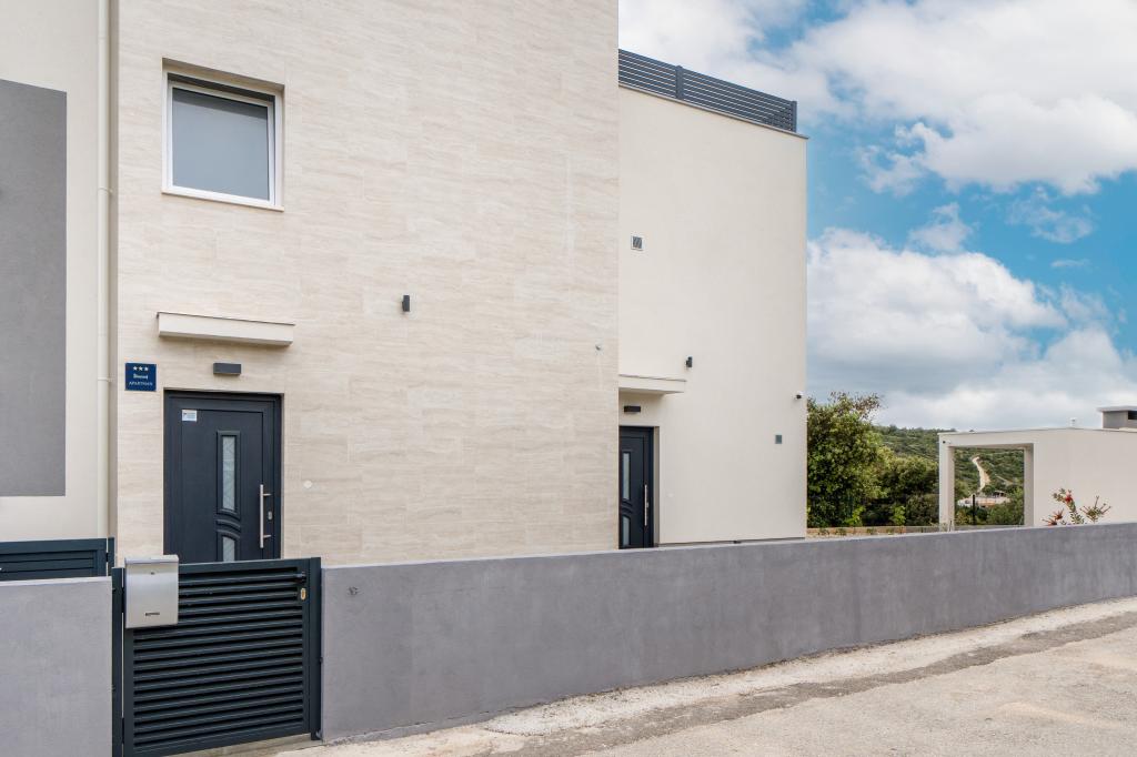 New facility. Enjoy with your family in this modern accommodation with beautiful sunsets and sea view. Quiet neighborhood. Two apartments that are rented as a whole. On the ground floor there is a studio apartment consisting of a kitchen, a bathroom and a room with a double bed, there is also an extra bed in the living room. On the first floor there is a large apartment consisting of a kitchen, a living room, a balcony with garden furniture ideal for morning coffee, two rooms with a double bed and one room with two separate beds that can be connected if necessary. This apartment has two bathrooms, one of which is part of the room and one toilet. On the second floor of the building, there is a large terrace with a view of the entire place and a hydromassage tub for 5 people, deckchairs for sunbathing, barbecue, summer kitchen and table and chairs. There is also a smaller covered facility outside with a barbecue and a table and benches.