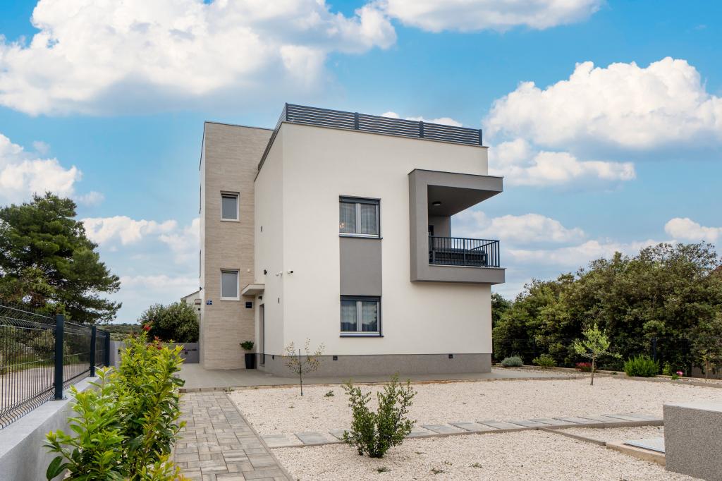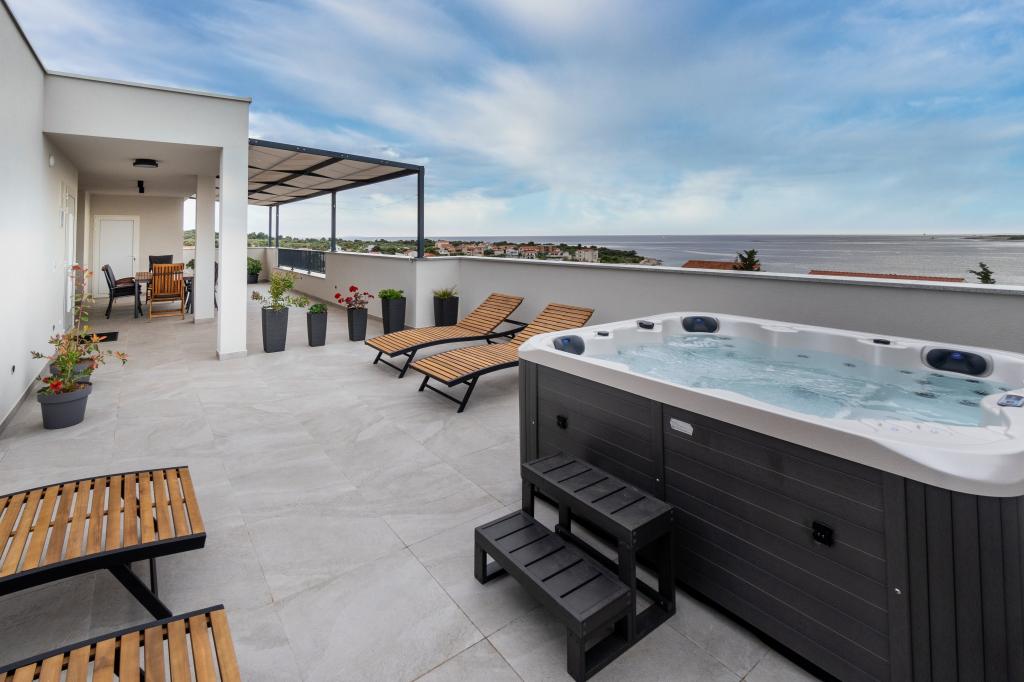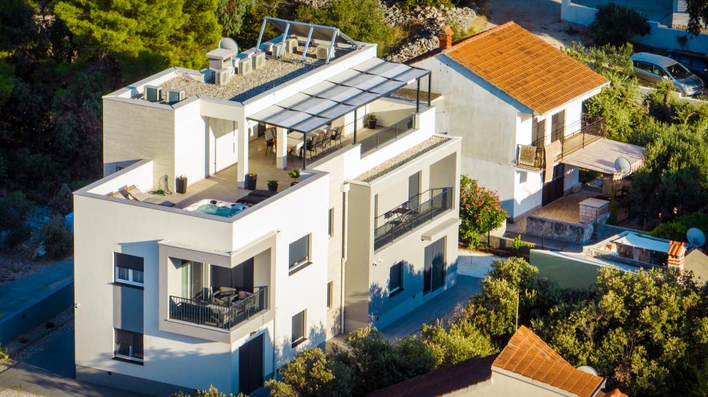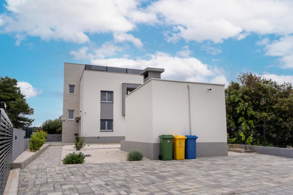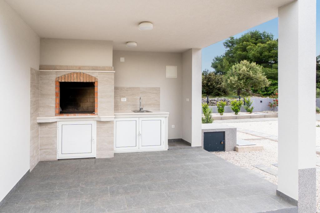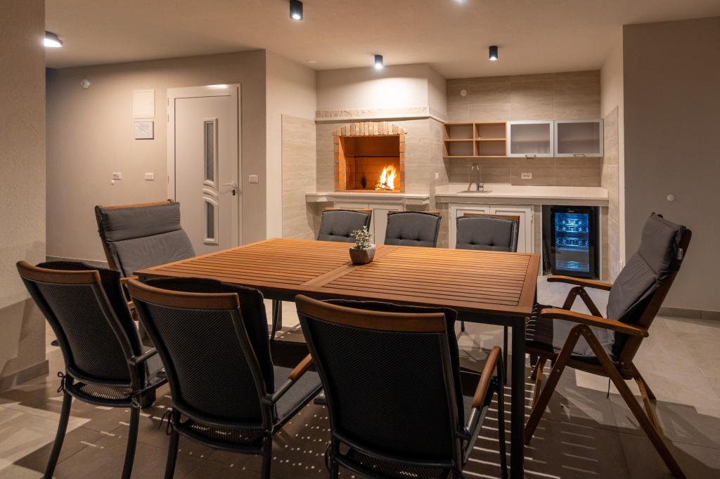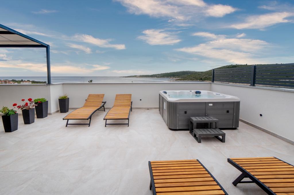 New facility. Enjoy with your family in this modern accommodation with beautiful sunsets and sea view. Quiet neighborhood. Two apartments that are rented as a whole. On the ground floor there is a studio apartment consisting of a kitchen, a bathroom and a room with a double bed, there is also an extra bed in the living room. On the first floor there is a large apartment consisting of a kitchen, a living room, a balcony with garden furniture ideal for morning coffee, two rooms with a double bed and one room with two separate beds that can be connected if necessary. This apartment has two bathrooms, one of which is part of the room and one toilet. On the second floor of the building, there is a large terrace with a view of the entire place and a hydromassage tub for 5 people, deckchairs for sunbathing, barbecue, summer kitchen and table and chairs. There is also a smaller covered facility outside with a barbecue and a table and benches.