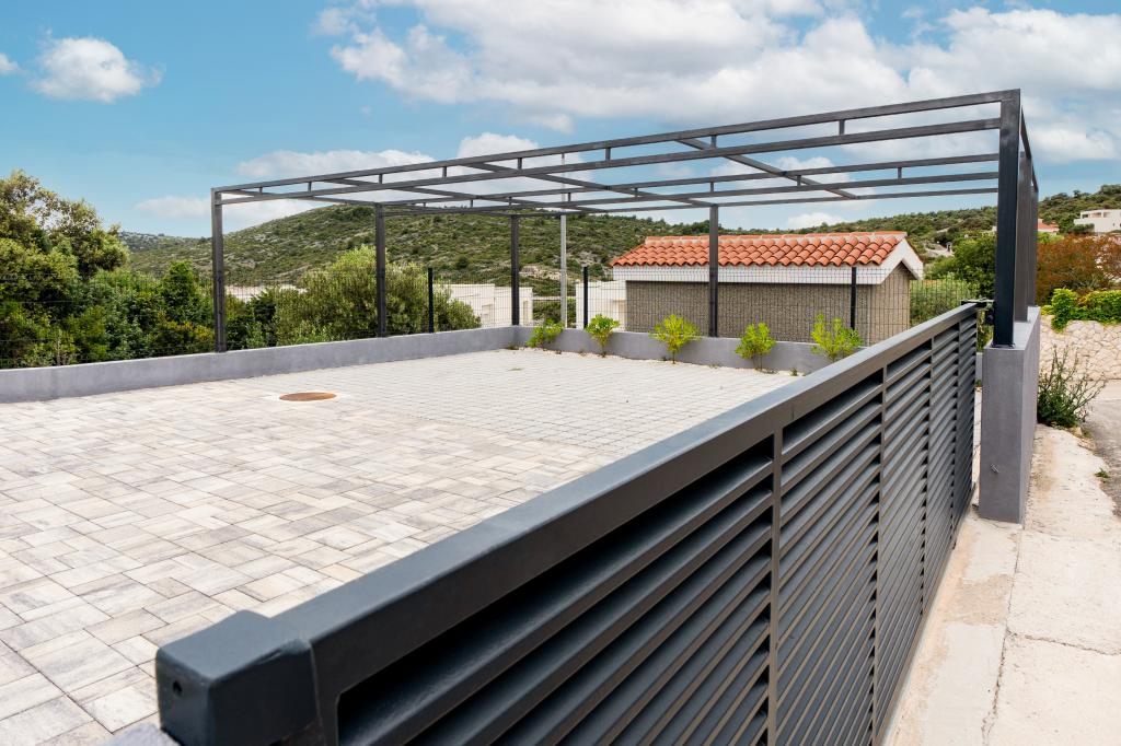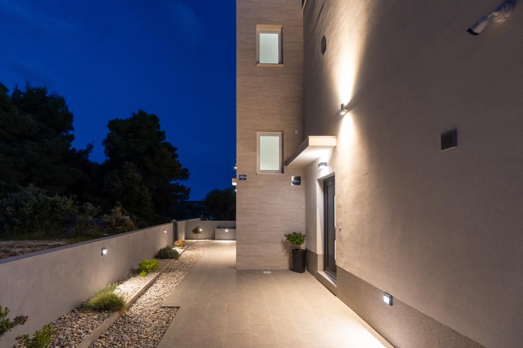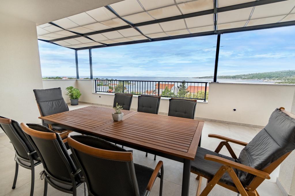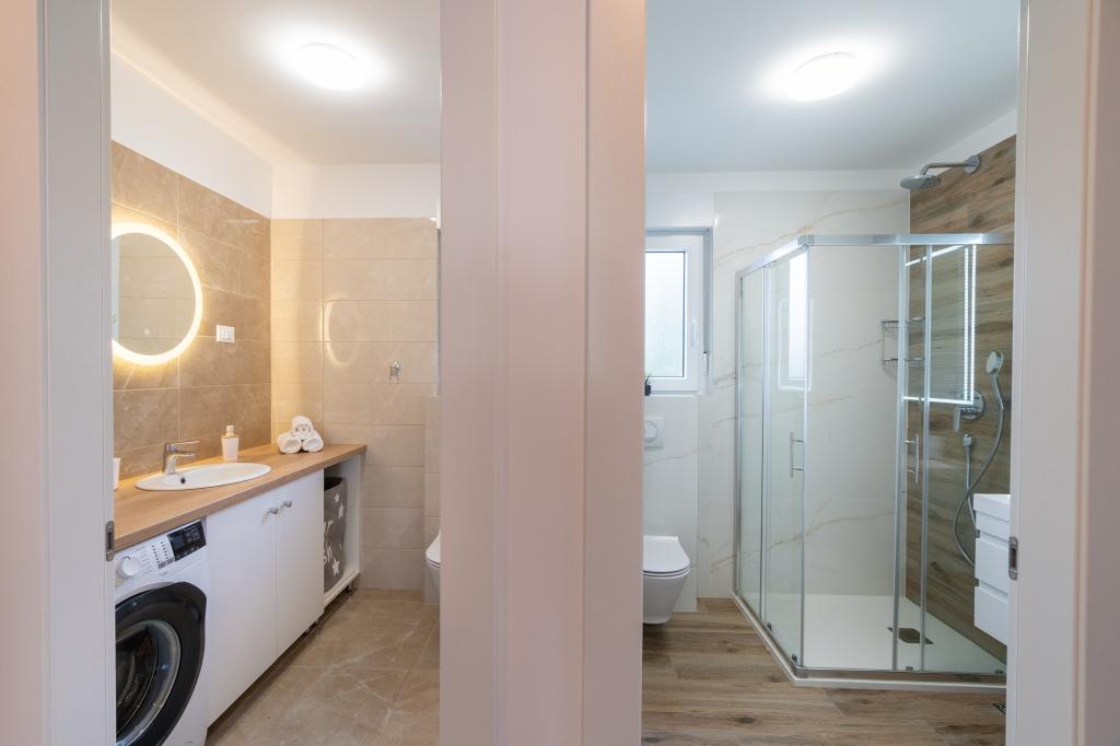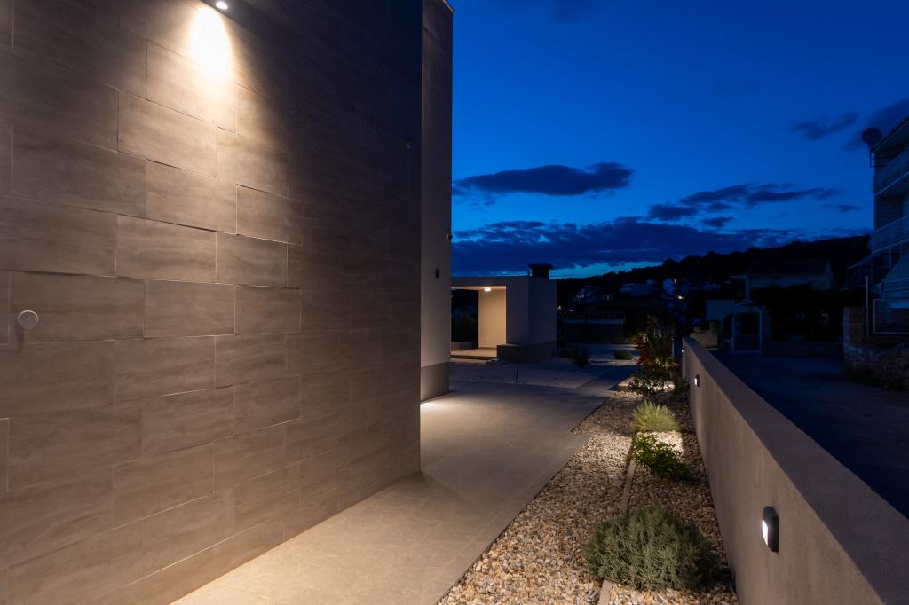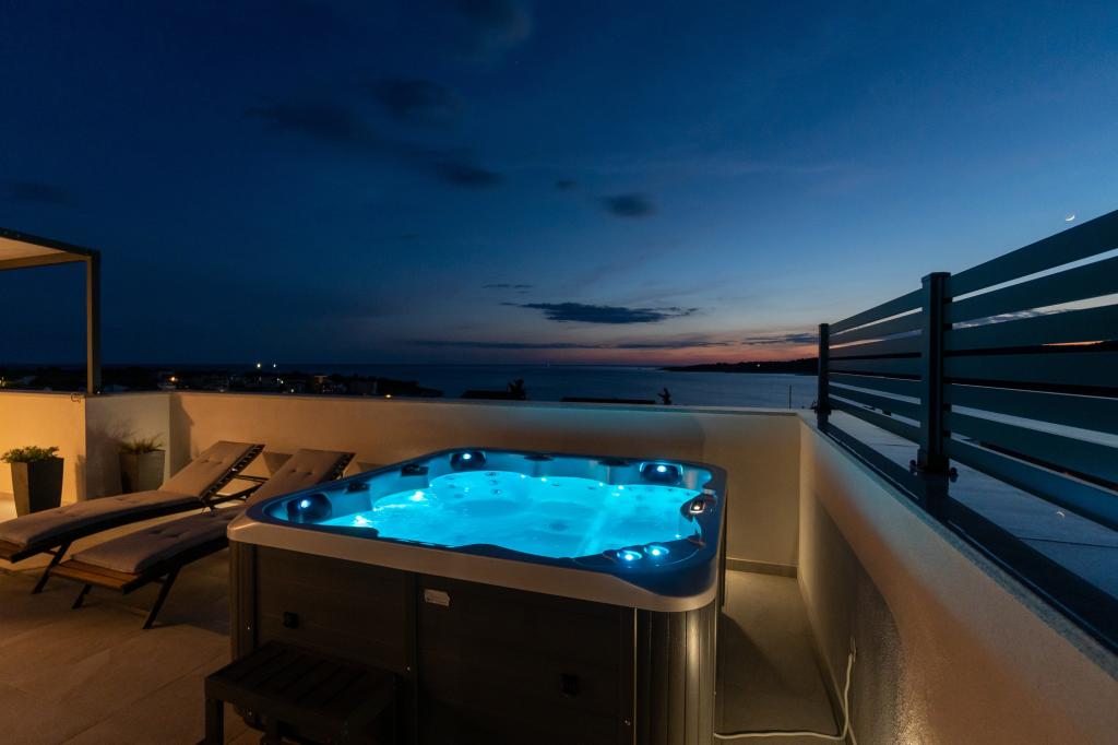 New facility. Enjoy with your family in this modern accommodation with beautiful sunsets and sea view. Quiet neighborhood. Two apartments that are rented as a whole. On the ground floor there is a studio apartment consisting of a kitchen, a bathroom and a room with a double bed, there is also an extra bed in the living room. On the first floor there is a large apartment consisting of a kitchen, a living room, a balcony with garden furniture ideal for morning coffee, two rooms with a double bed and one room with two separate beds that can be connected if necessary. This apartment has two bathrooms, one of which is part of the room and one toilet. On the second floor of the building, there is a large terrace with a view of the entire place and a hydromassage tub for 5 people, deckchairs for sunbathing, barbecue, summer kitchen and table and chairs. There is also a smaller covered facility outside with a barbecue and a table and benches.