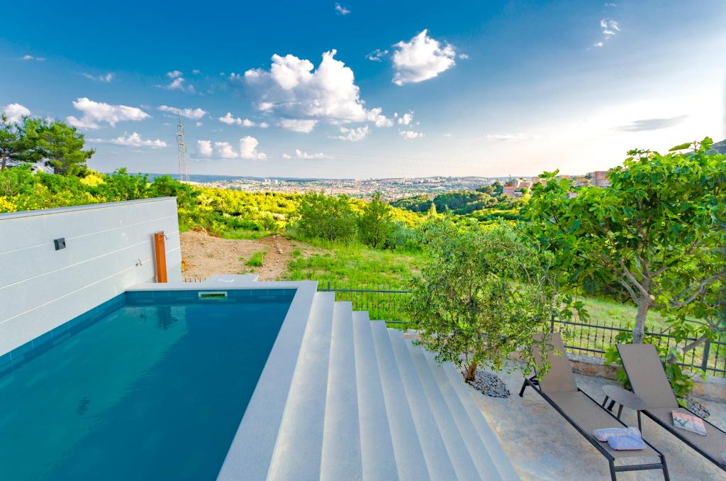 The villa extends over two floors with a total area of 180 square meters. The ground floor of this beauty consists of a fully equipped kitchen with a dining room and a comfortable living room. In the kitchen you will find everything you need to prepare and serve food, and the dining room is equipped for 8 people. During the day, the living room will be a place to relax with the TV, and during the night you can rest on the couch that can be used as an extra bed. From the living room, stairs lead you to the upper floor where there are 3 bedrooms and one shared bathroom. All three bedrooms have access to a balcony with a beautiful panoramic view of the garden or the surrounding area. Two bedrooms have double beds, while the remaining two have two single beds. The house is surrounded by a meticulously arranged Mediterranean garden. On the south side there is a heated swimming pool with deckchairs for enjoying the sun. For moments of complete relaxation, you will find a jacuzzi in the back of the house and a grill next to the balcony.