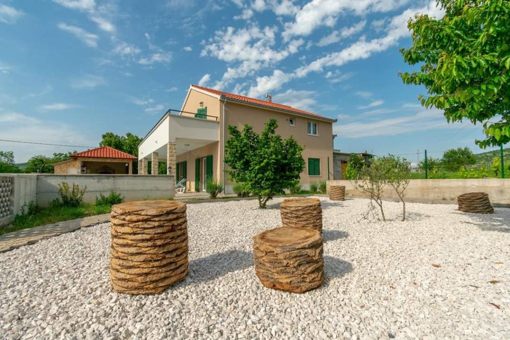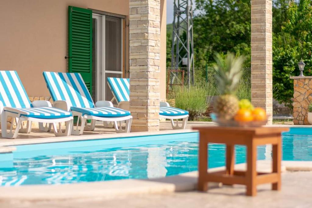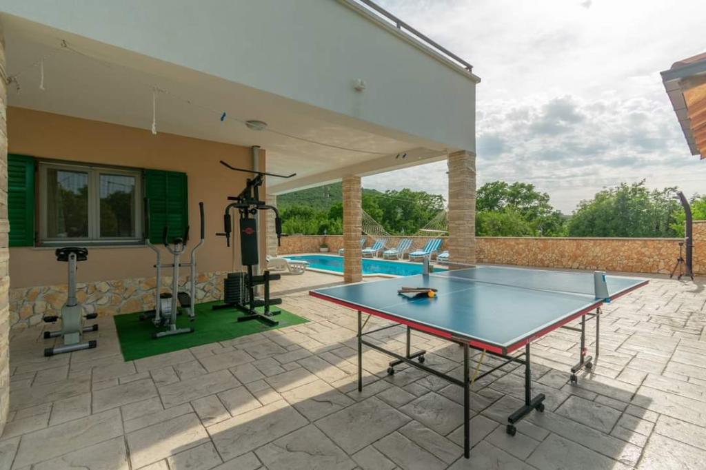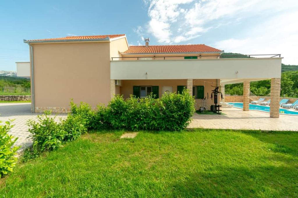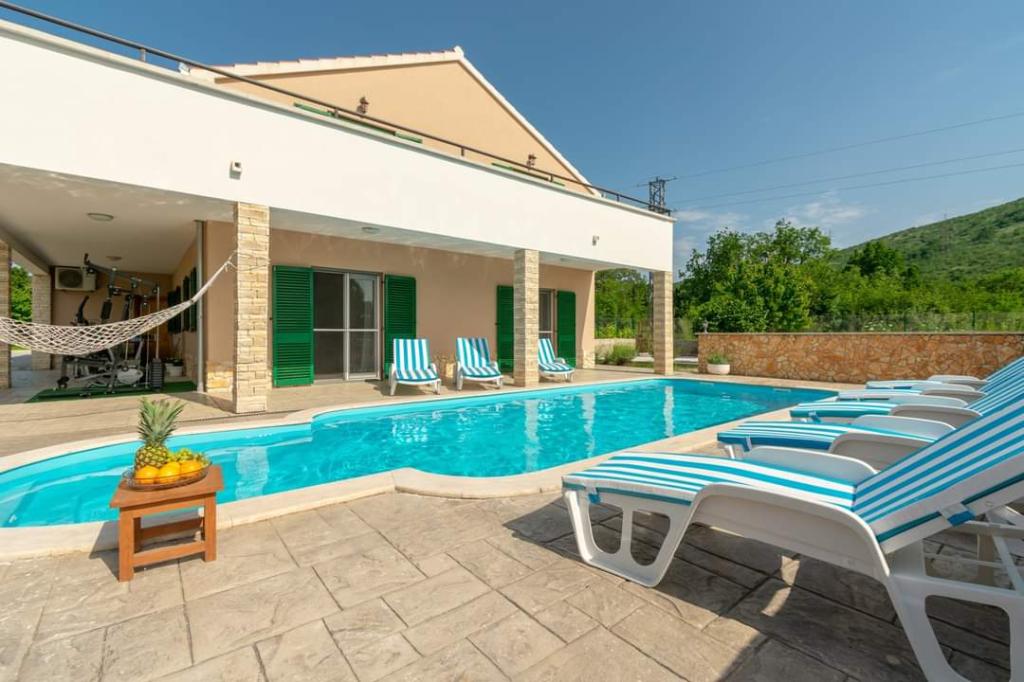 The holiday house Villa Renato is located in the beautiful small town of Konjsko, 15 km from Split. The villa is located on an estate of 1800 m2 with a swimming pool, barbecue, ballot box, table tennis and exercise equipment, and a covered terrace for enjoyment. The house itself is suitable for 8 people. It has 4 bedrooms for 2 people + a sofa bed for possibly another 2 people. The house has 3 bathrooms and one outdoor toilet, as part of the gazebo and pool. The nearest shop, cafe bar and bus stop are only 400m away. The distance from the nearest city beach is about 15 km. Get to know the city of Split, Trogir, Solin, our beautiful islands and the sea, National Parks, all in a one-day trip around the area. Split airport is 30 km away. In the Villa, enjoy privacy, peace and a relaxing atmosphere...