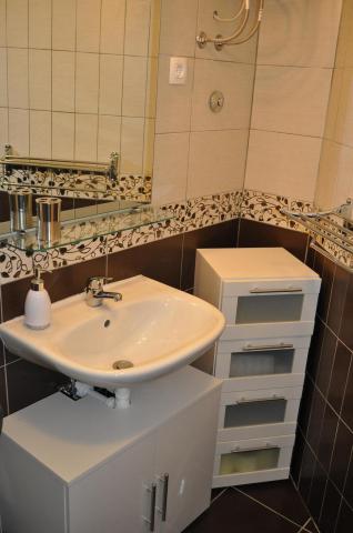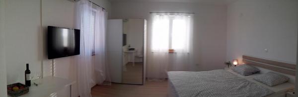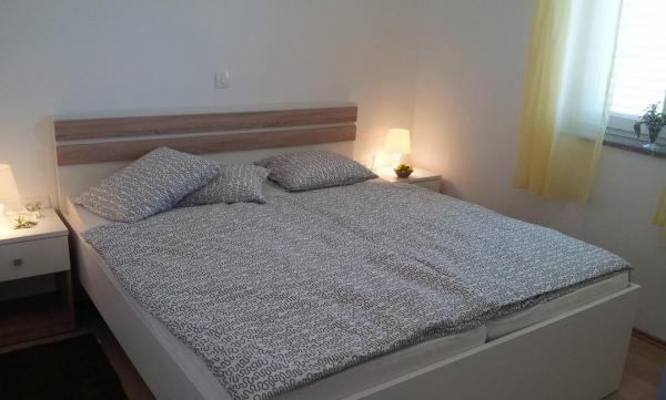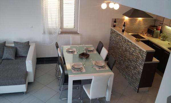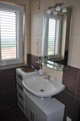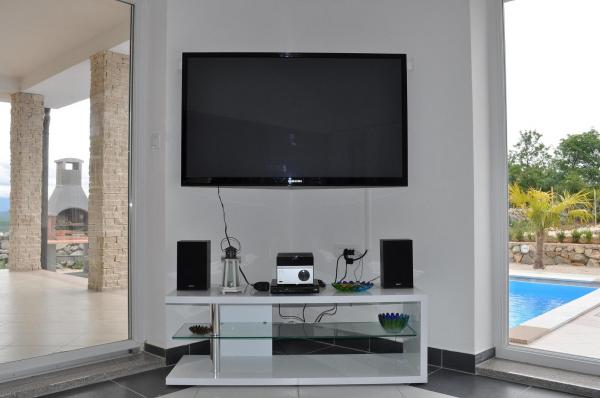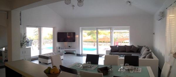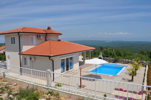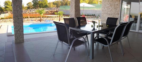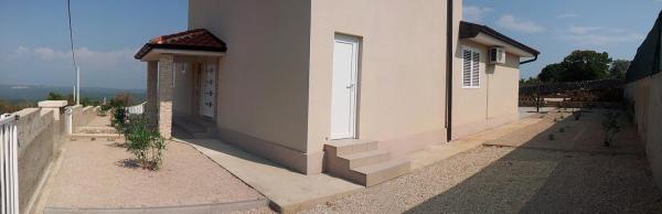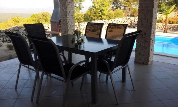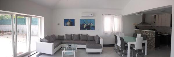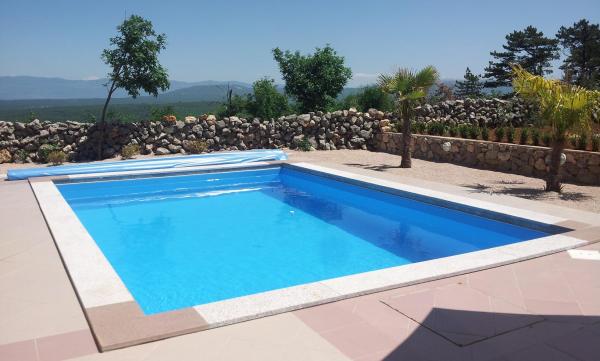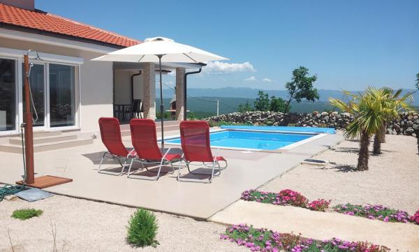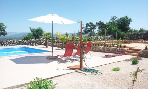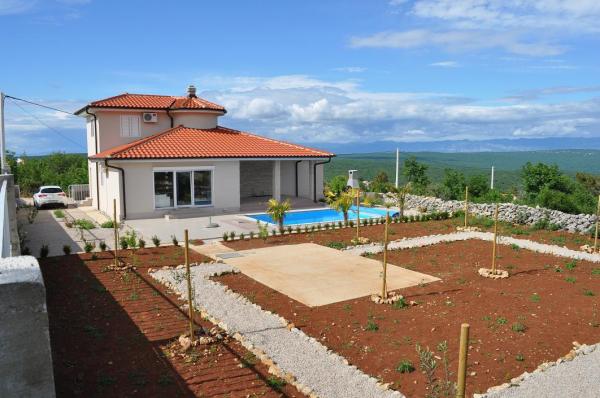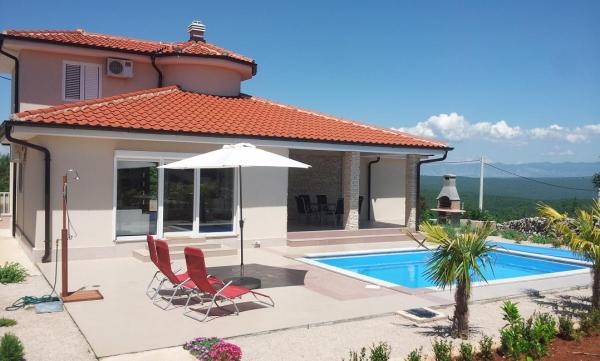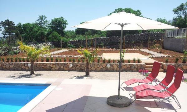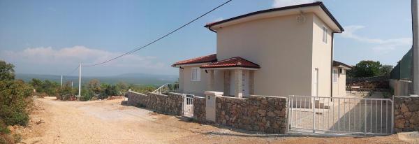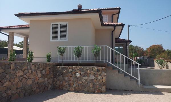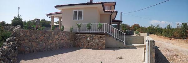 The new, fully furnished house with 6 +2 persons, with swimming pool and large garden near the town of Krk, Vrh. Distance of three beaches approx 5 min drive. Quiet and discreet location, greenery, overlooking the interior of the island and the sea to the south. House size is 130m2 and consists of 3 bedrooms (2 on the ground floor) and a large living room, dining room and kitchen, hallways and bathroom and toilet and a covered terrace on the ground floor and master bedroom with a bathroom on the first floor. Swimming pool 24m2, garden 780m2, decorated in a Mediterranean style. Great barbecue, sun terrace of 60m2 with swimming pool, parking for 3 cars. Internet, TV (2), TV, DVD, air conditioning, fully equipped kitchen available.