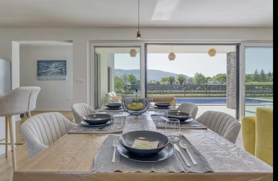 Villa Marina is located in the peaceful village of Blaškovići, located right next to the picturesque town of Kršan. This newly built modern single-storey house is an ideal place to escape the city bustle and relax in natural surroundings. Inside the house we find three spacious bedrooms, each with its own bathroom. Two bedrooms have direct access to the pool terrace. The spacious living room with dining area and kitchen is surrounded by a glass wall, providing plenty of daylight. The kitchen is equipped with all necessary appliances and utensils and is an ideal place to prepare delicious meals. The living room leads to a partially covered and uncovered pool terrace, and from the kitchen there is access to a second terrace, so that it is possible to use the space in the sun or in the shade, depending on the time of day and year. The terraces have comfortable furniture and deck chairs, as well as a barbecue, perfect for relaxing in the fresh air and preparing meals. Villa Marina has an excellent location, close to the towns of Pazin and Labin and the coast of Rabac.
