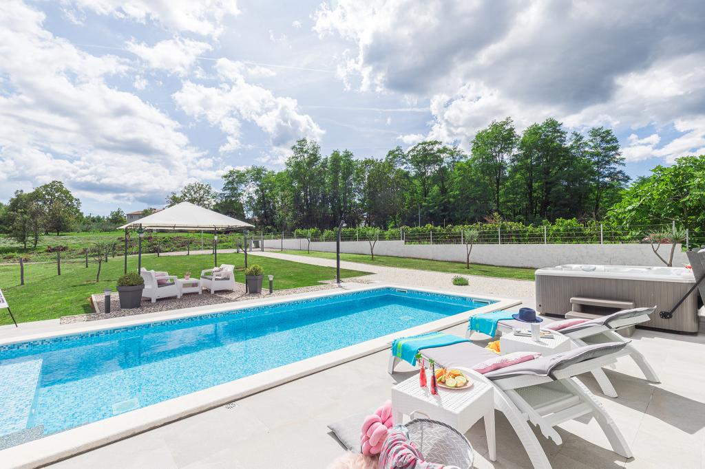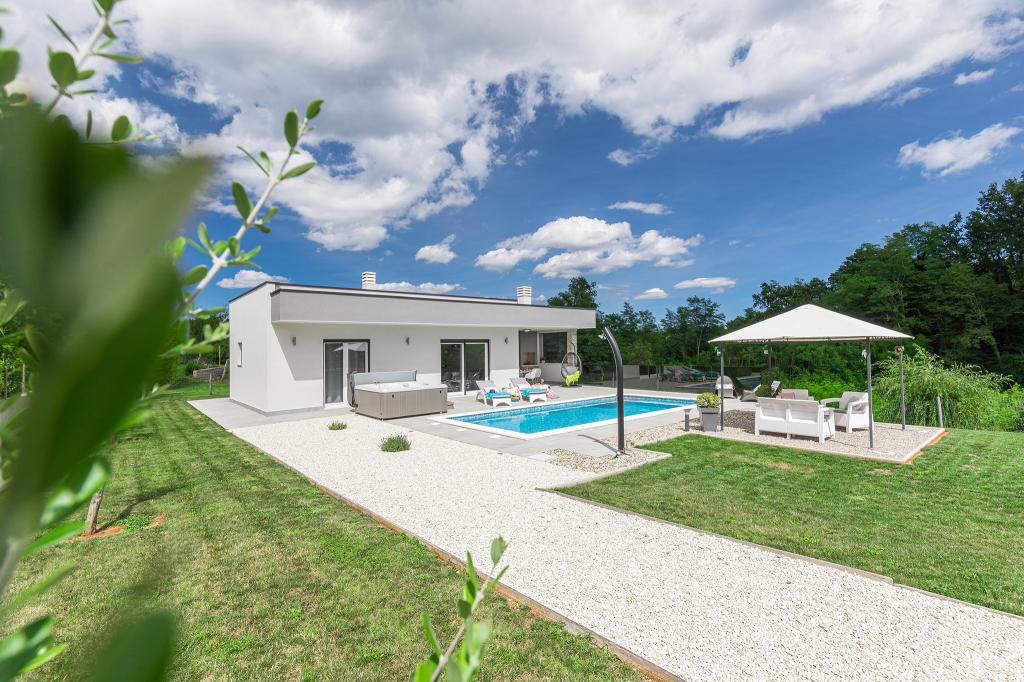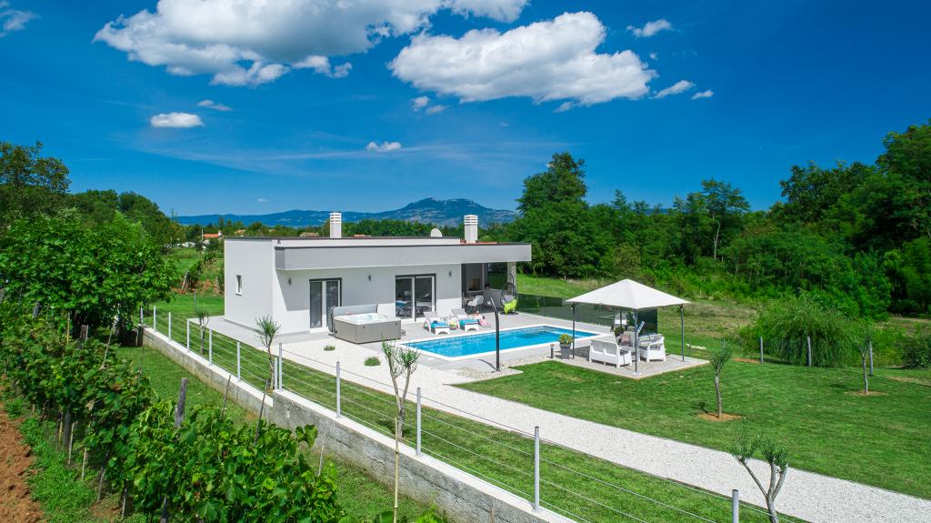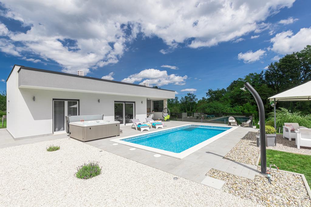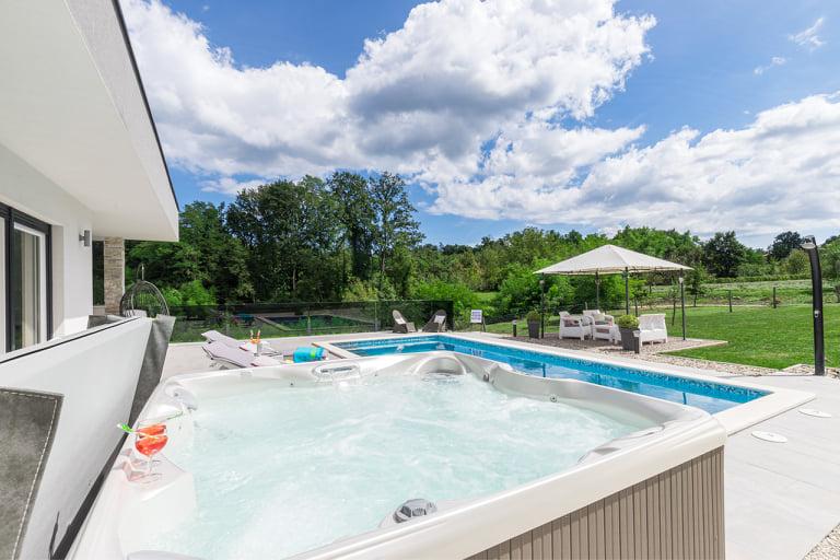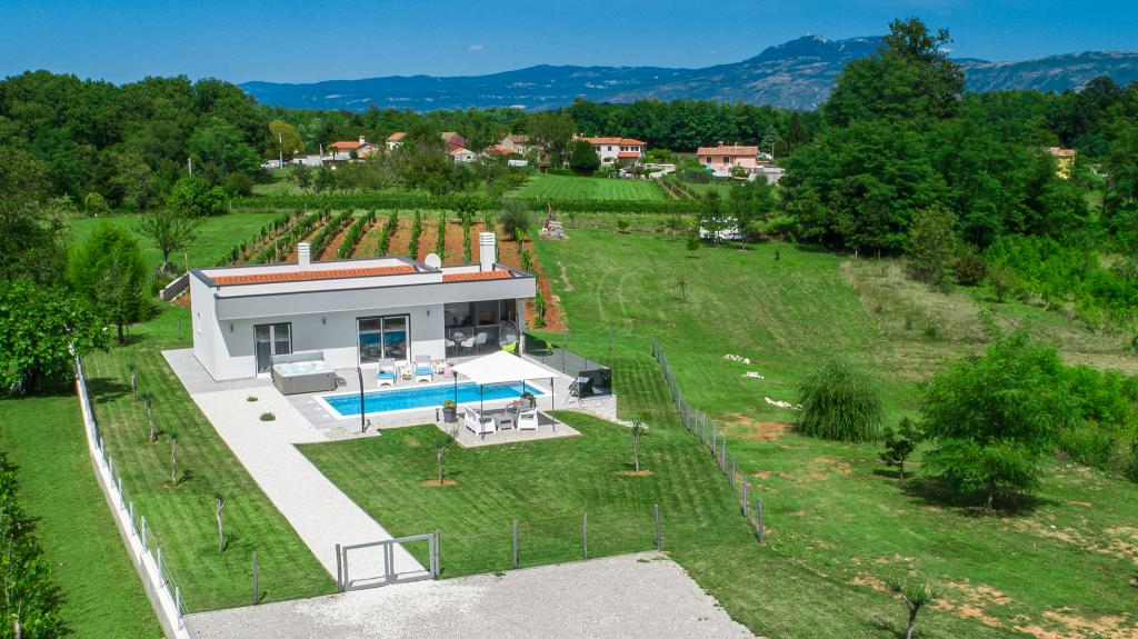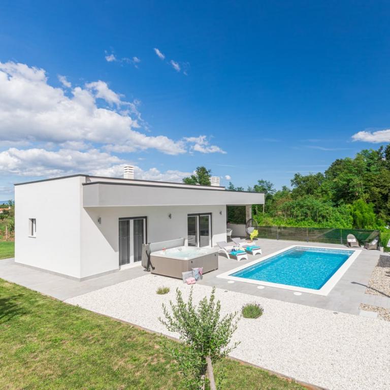 Villa Romantica is a newly built and modern house located in the small village of Zupanici, near Labin. It is surrounded by vineyards and greenery. It offers complete peace and quiet, far from the hustle and bustle. The nearest shops and restaurants are 2 km away, while other facilities are only 7km away in nearby Labin. Villa Romantica covers an area of 50m2 and consists of a living room with a sofa bed for two (140x200), satellite TV, free internet, a table and chairs for 4 people and a fully equipped kitchen, a dishwasher, a microwave, a coffee machine, washing machine, towels. . It has one bedroom with double bed, satellite TV, door to the outdoor pool and bathroom (shower / WC). Outside is a garden of 800m2, and an outdoor swimming pool of 32m2 with hydromassage. New for our guests We now offer an outdoor jacuzzi (210cm x 210cm). The Jacuzzi has 3 seats and 2 reclining seats. Villa Romantica is open year-round.