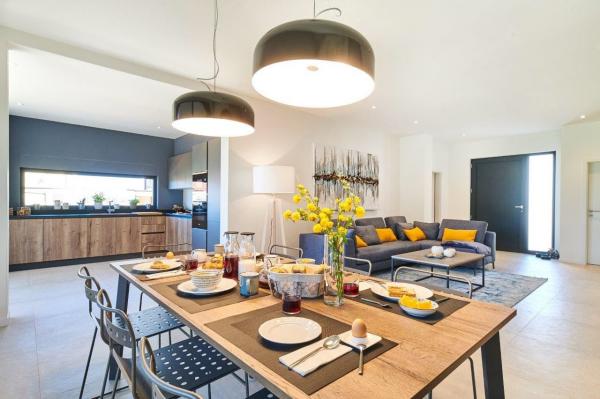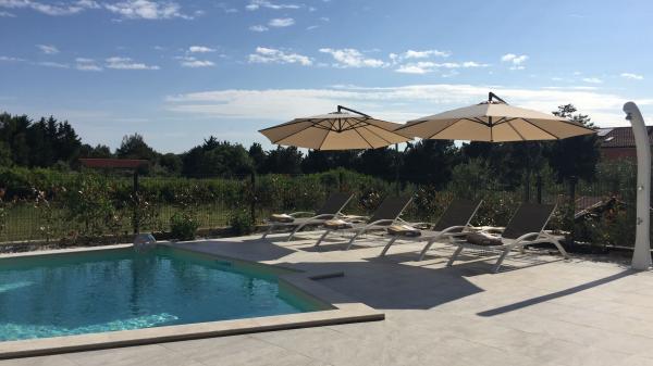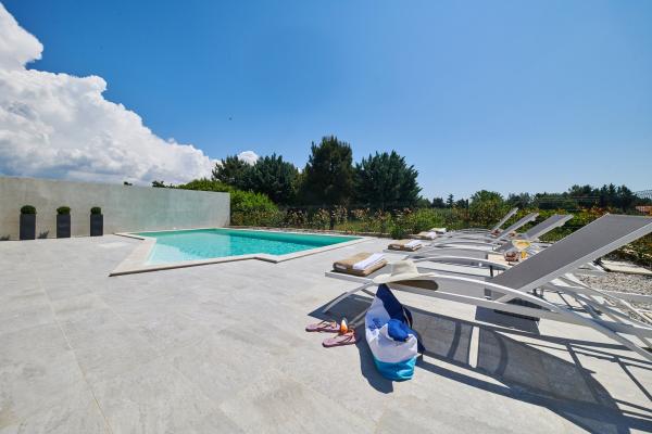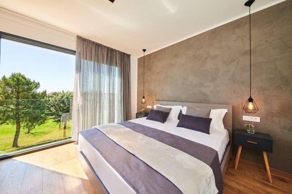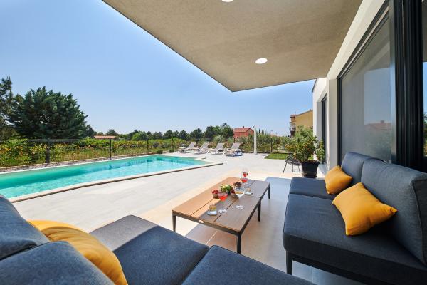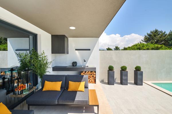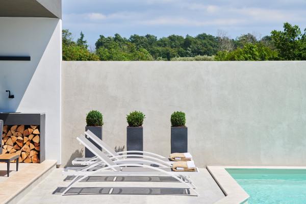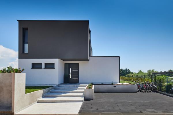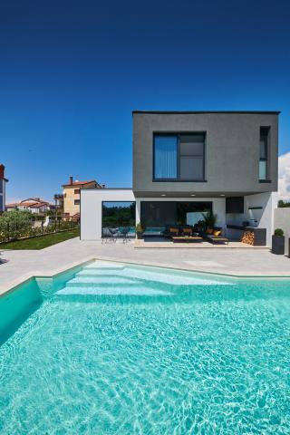 Modern and modernly equipped villa with swimming pool is located in the village of Stancijeta near Novigrad. Simple straight lines were chosen, a combination of modern and industrial design. Compressed is a pleasant combination of warm colors and materials blended with gray anthracite paint to create the perfect home for your vacation. The interior of the villa exudes elegance, comfort and superb detail. While preparing food in the kitchen from any angle, you can follow the kids who care about playing pool or lawn with lots of toys available. On the ground floor of the house is a bedroom with a bathroom, a bathroom for guests, a spacious living room and an eating table, and a kitchen with a dining area from which you can step on the covered patio beside the pool. On the floor are 3 air-conditioned bedrooms, each with a private bathroom for privacy in the garden. The outdoor part with a private pool was created to enjoy the long sunny and warm days of the Mediterranian climate and the superb location of the villa itself.