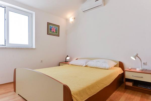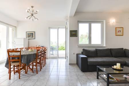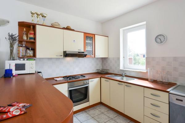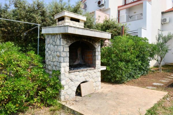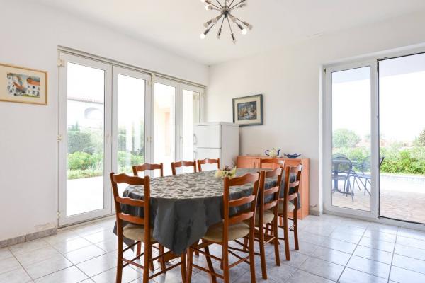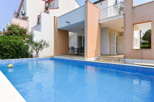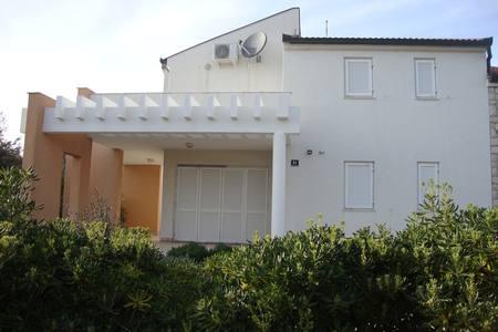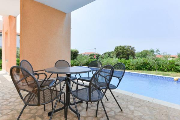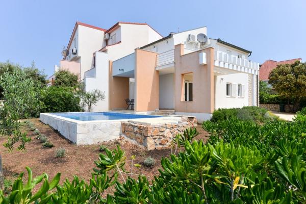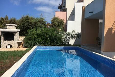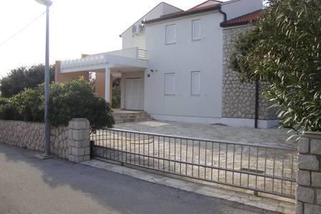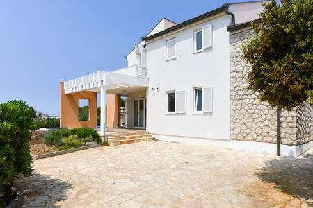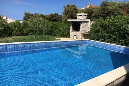 Beautiful house with swimming pool on the island of Pag (place Mandre), 200 meters from the sea. It is located in a quiet neighborhood, surrounded by other family homes. The property has a swimming pool of 8x4 m, beautifully landscaped courtyard, terrace, sunbathing area, barbecue and parking. On the ground floor of the building there is a spacious living room with kitchen, bathroom, garage and pantry. On the ground floor there are four rooms, of which three with double beds and one with two smaller beds. On the ground floor there is also a separate bathroom and a large terrace. The facility can accommodate up to 8 adults on the upper floor, and two more on the ground floor (upholstered couch). The house is ideal for a quiet family vacation, and is fully and modernly equipped for a pleasant stay.