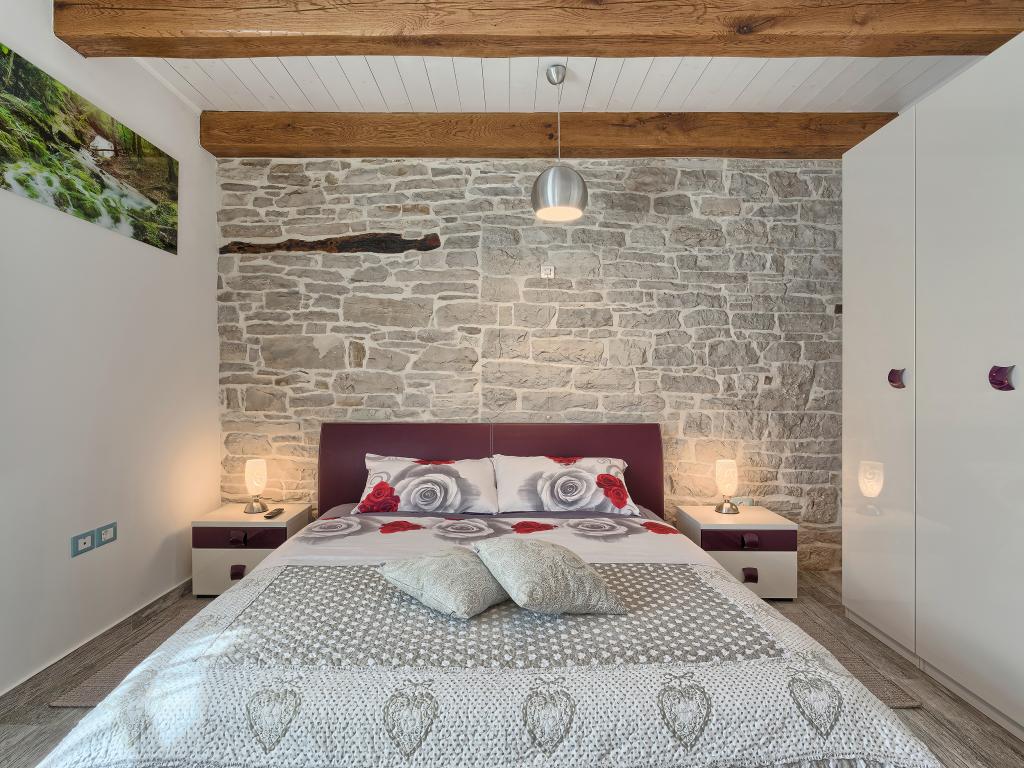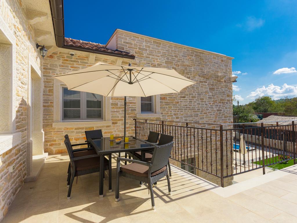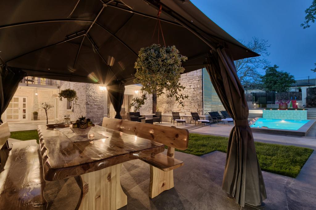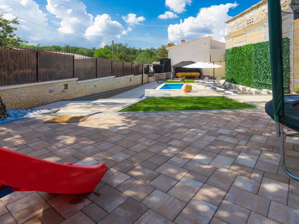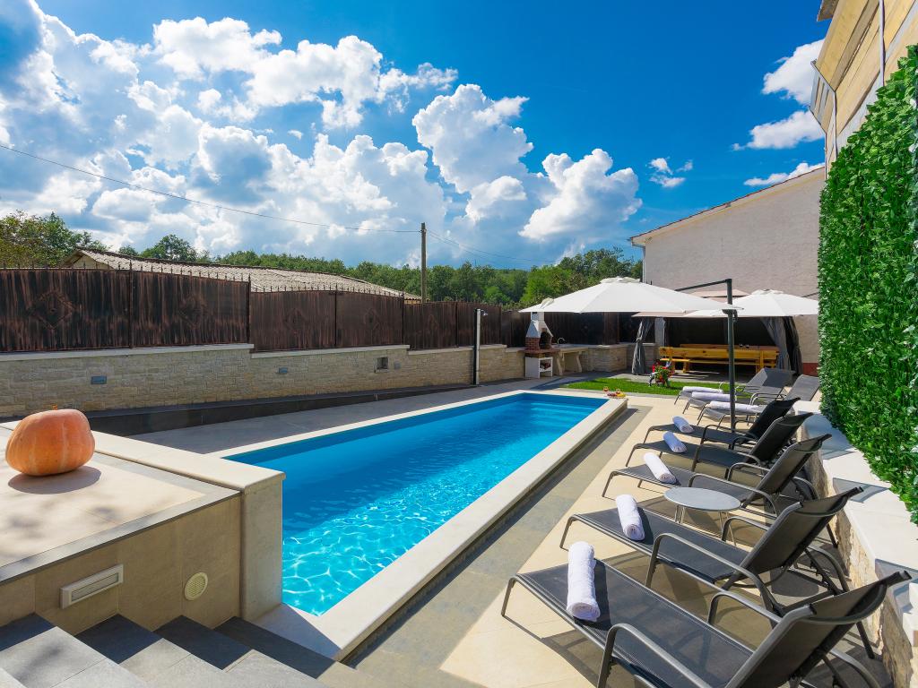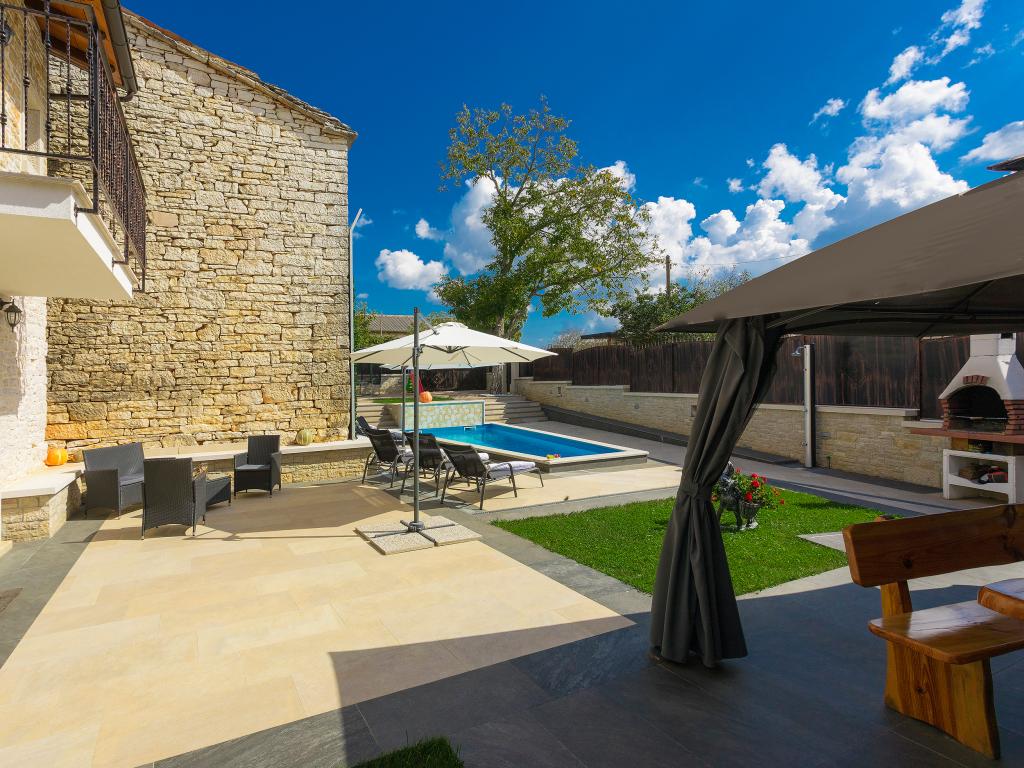 Whether you are looking for an escape from the hustle and bustle of everyday life or a base for your active vacation, Villa Patrick is the ideal place for you. An old stone house from 1880, completely renovated in 2017, is located in the small town of Pilati near Pazin in the heart of Istria. The house of 200 m2 contains everything necessary for a comfortable stay for up to 10 people (8+2), and the fenced garden of 500 m2 with a swimming pool provides peace and maximum privacy. The ideal position in the center of Istria allows you to plan additional activities, from cultural and artistic, sports, historical to gastronomic tourism, because all known locations are 2-40 km away. And if you want to expand your horizons, the place is ideal for planning one-day trips to somewhat more distant places like Pula, Rovinj or Umag. Villa Patrick can accommodate up to 10 people (optimal 8), and offers you maximum comfort. There are four comfortable bedrooms with double beds and private bathrooms - each room has its own air conditioner and television with satellite receiver; shared living room with fireplace and satellite TV, shared bathroom, large kitchen with all modern appliances and open dining room for 10 people. The outdoor space includes a terrace with a swimming pool, two seating areas,