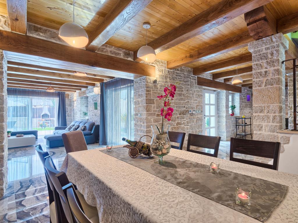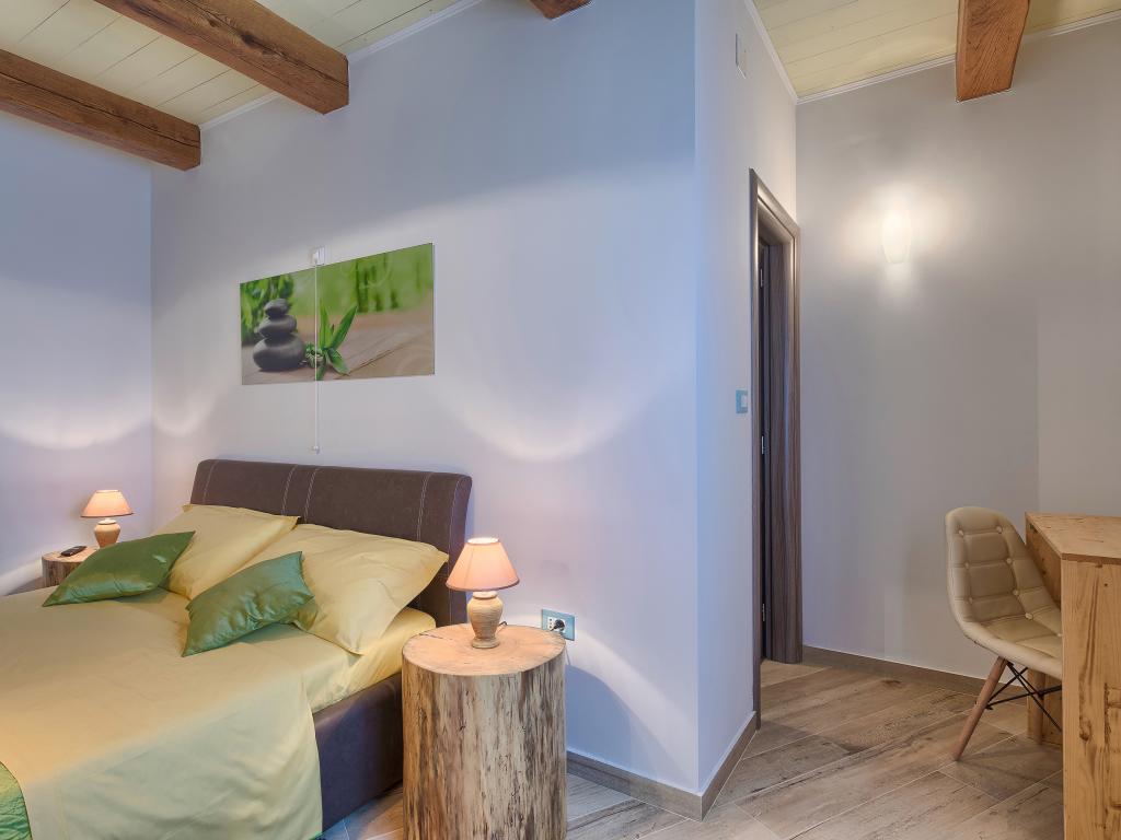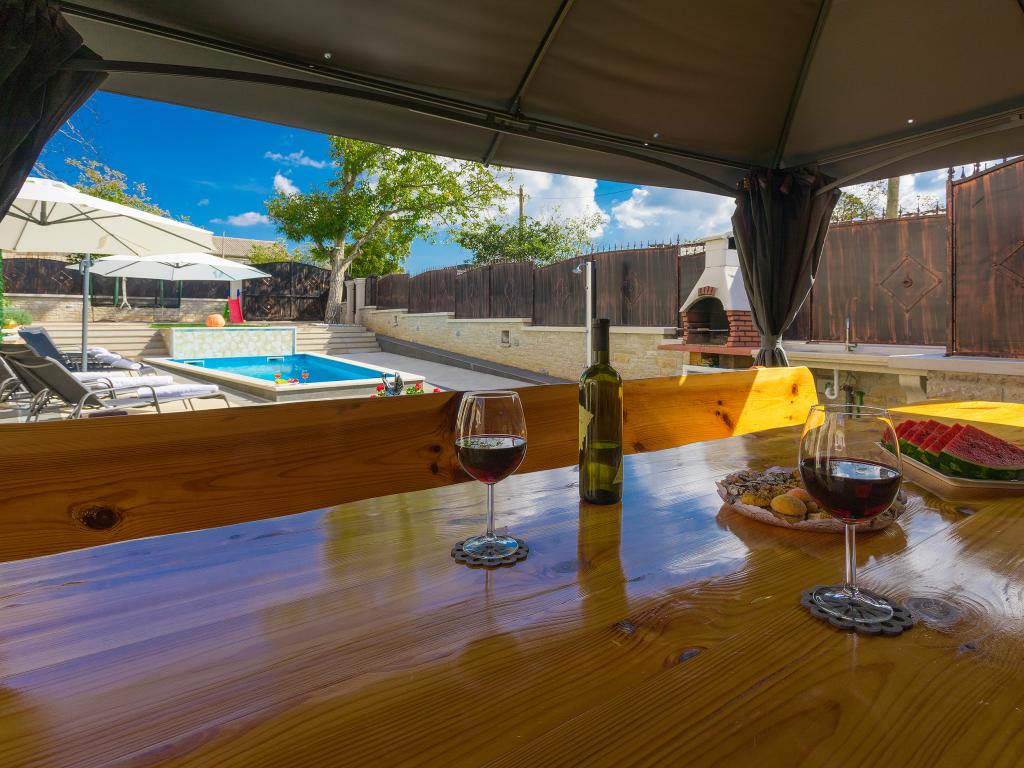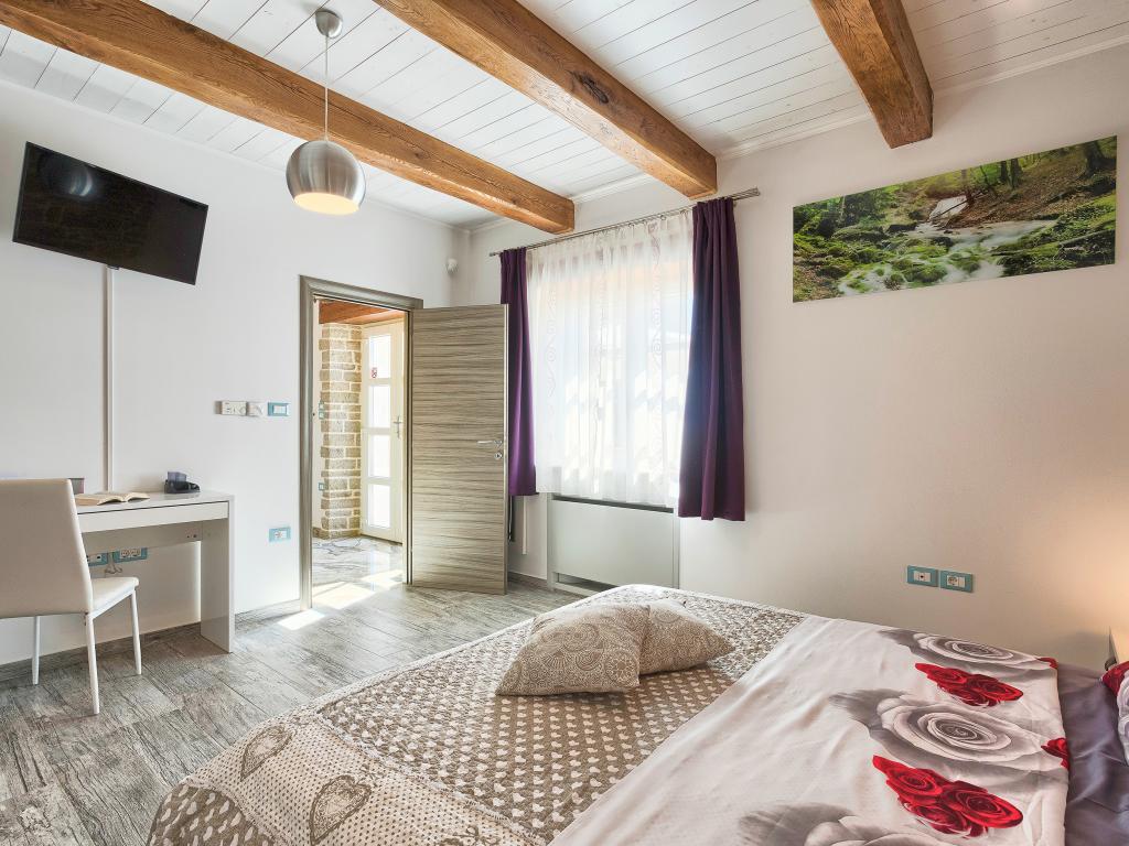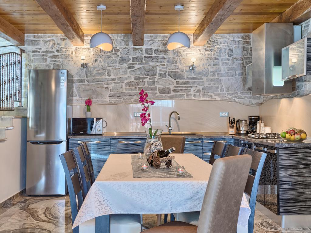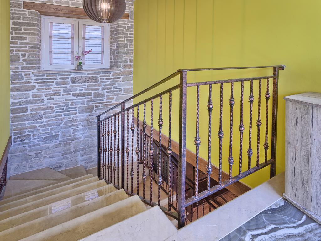 Whether you are looking for an escape from the hustle and bustle of everyday life or a base for your active vacation, Villa Patrick is the ideal place for you. An old stone house from 1880, completely renovated in 2017, is located in the small town of Pilati near Pazin in the heart of Istria. The house of 200 m2 contains everything necessary for a comfortable stay for up to 10 people (8+2), and the fenced garden of 500 m2 with a swimming pool provides peace and maximum privacy. The ideal position in the center of Istria allows you to plan additional activities, from cultural and artistic, sports, historical to gastronomic tourism, because all known locations are 2-40 km away. And if you want to expand your horizons, the place is ideal for planning one-day trips to somewhat more distant places like Pula, Rovinj or Umag. Villa Patrick can accommodate up to 10 people (optimal 8), and offers you maximum comfort. There are four comfortable bedrooms with double beds and private bathrooms - each room has its own air conditioner and television with satellite receiver; shared living room with fireplace and satellite TV, shared bathroom, large kitchen with all modern appliances and open dining room for 10 people. The outdoor space includes a terrace with a swimming pool, two seating areas,