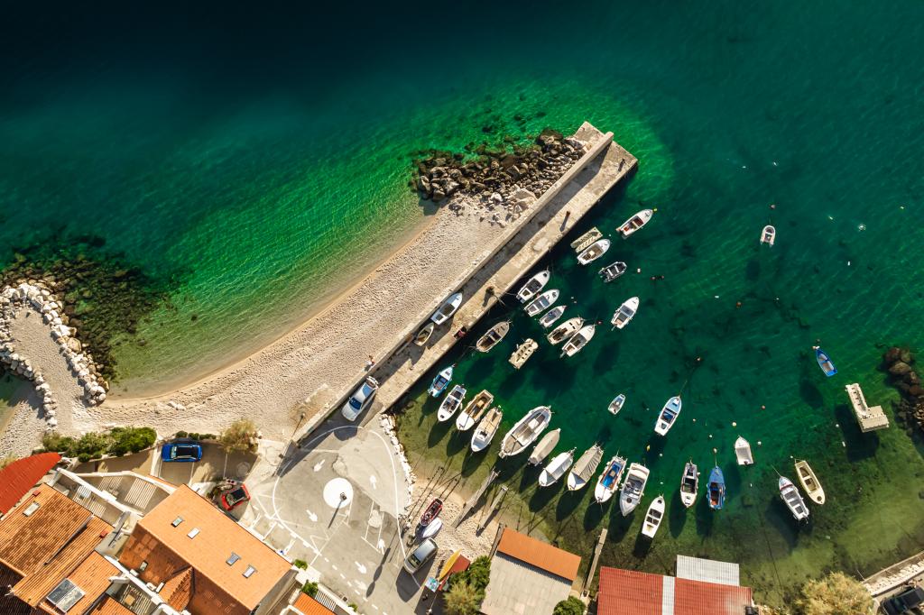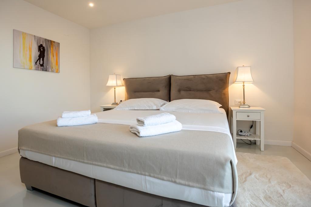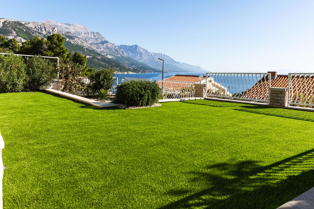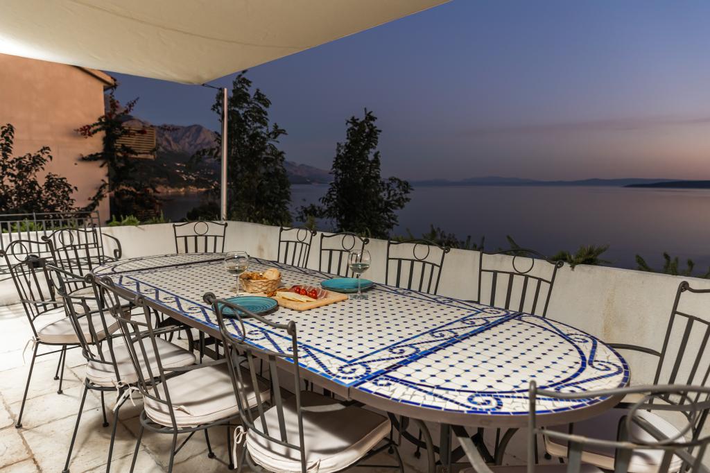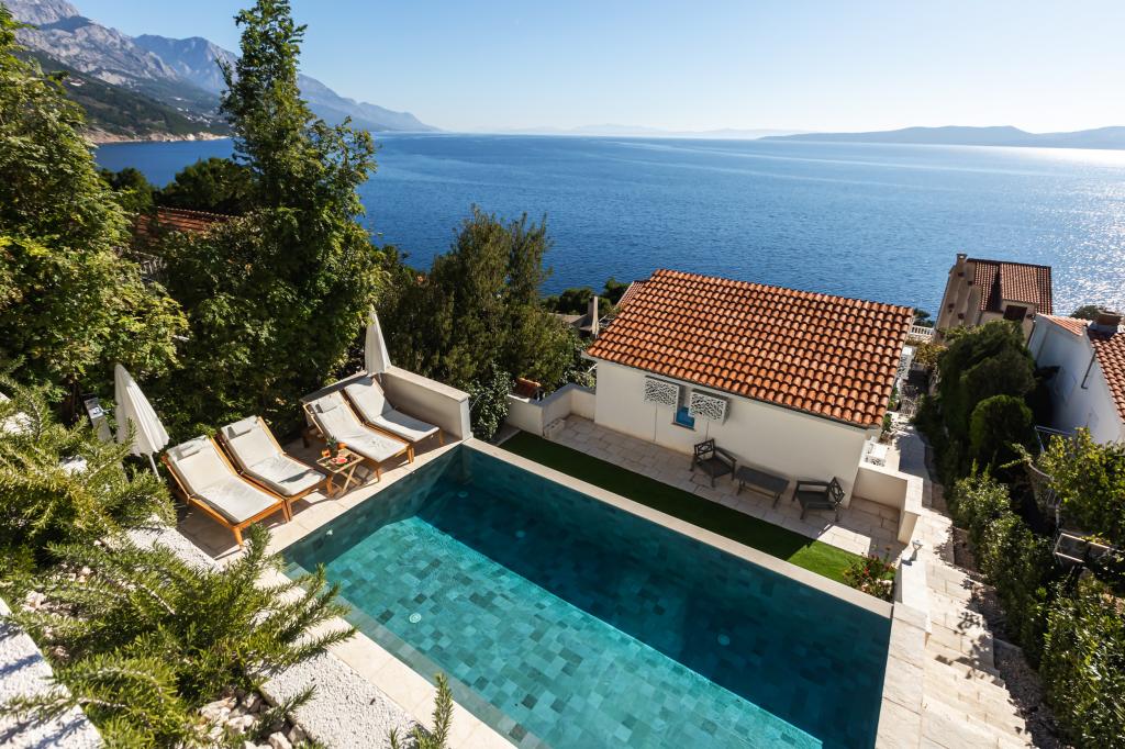 The idyllic Villa Leview, located in a quiet part of Pisak, will delight you with its spacious green courtyard and garden oases and a beautiful open view of the sea. As its name suggests, Villa Leview has an open view of the sea from every part of the house, whether you are in the kitchen, living room or bedroom. The heated pool and hot tub will make your stay enjoyable even outside the summer season. The house has five bedrooms and provides comfortable accommodation for 10 people. The rooms are equipped with spring box beds, of which three rooms have double box beds 180cm wide and two rooms have two separate beds 90cm wide. A fold-out children's bed is also available. Next to the pool is a spacious living room where you can also enjoy the sea view. The kitchen and dining room for 10 people are connected to a beautiful dining terrace with an unforgettable view of the sea and islands as well as Mount Biokovo in the background. The house has two garages for 4 cars.