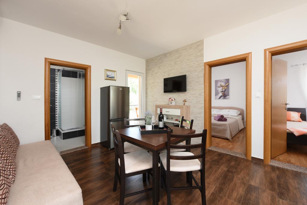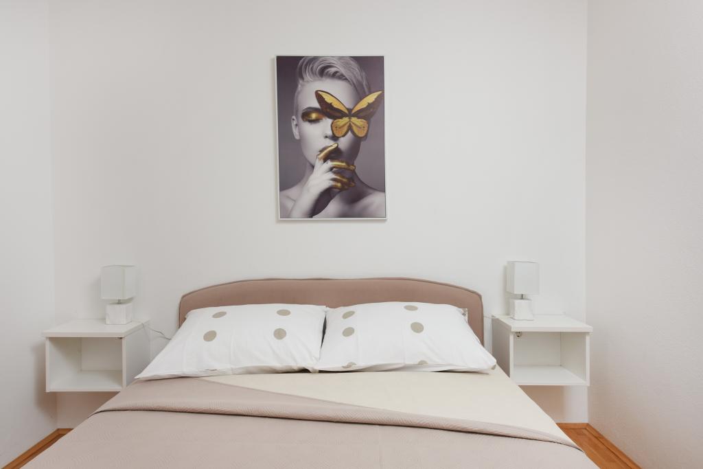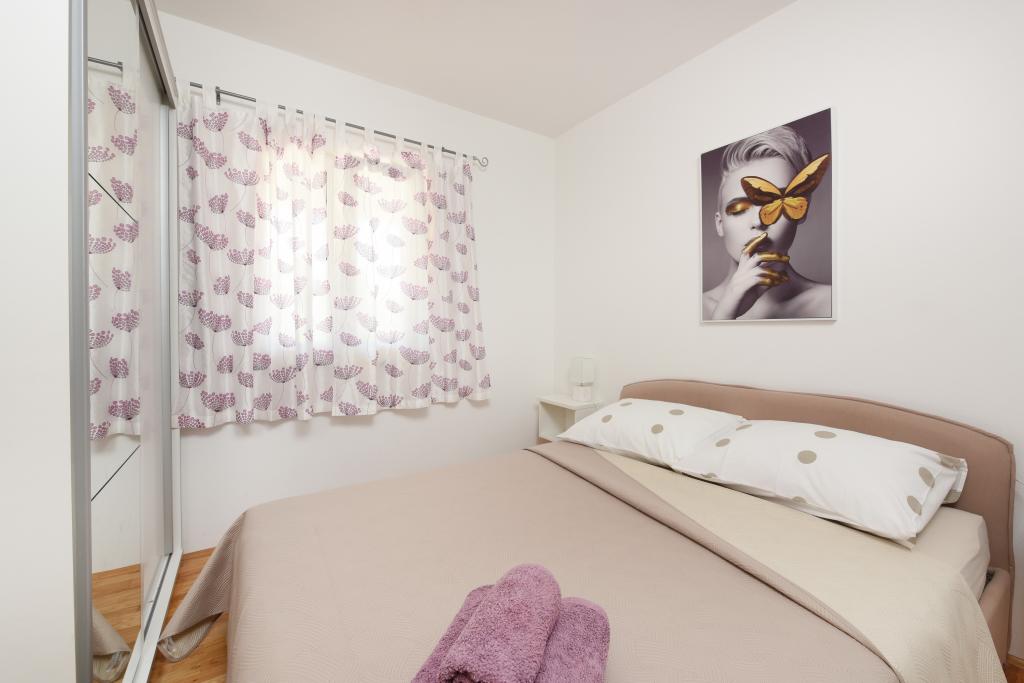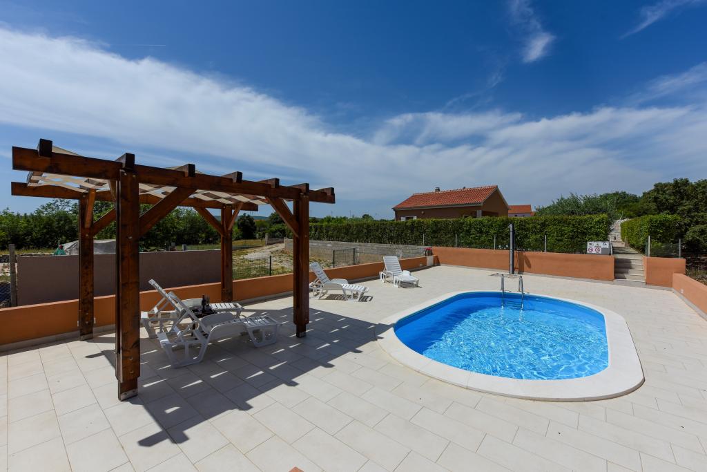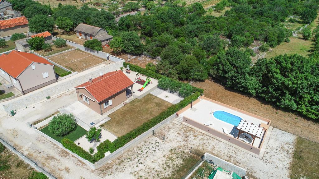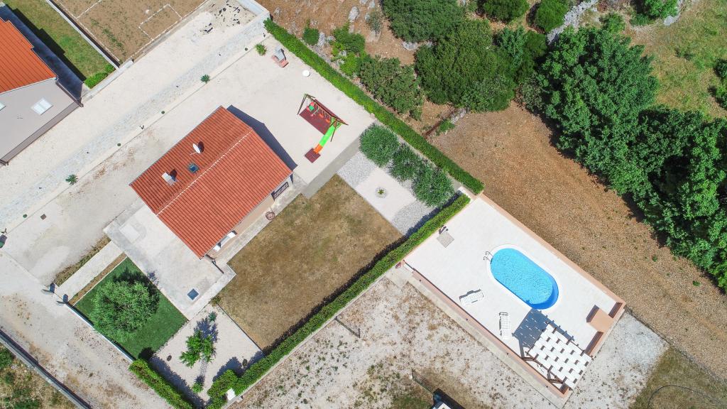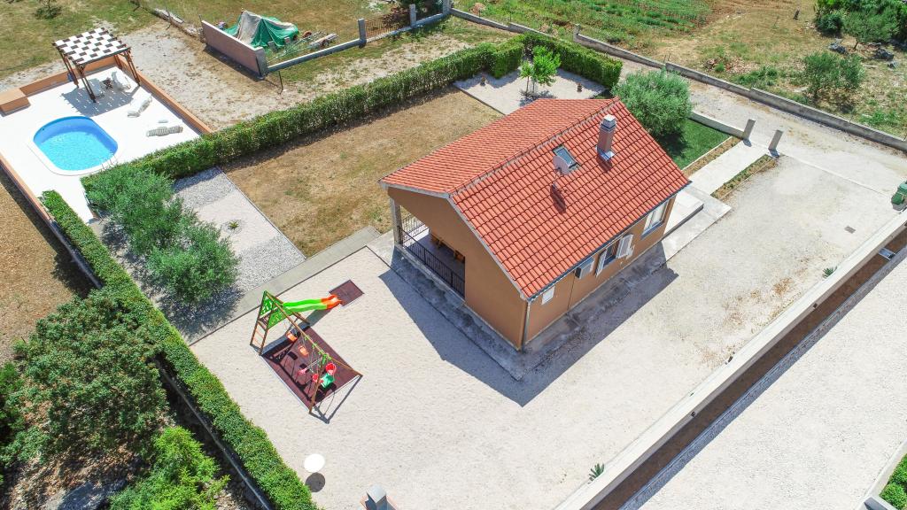 The vacation house is located in a quiet part of Pridraga, surrounded by greenery and chirping birds. There is a swimming pool and children's playground next to the house. You need to go to the beach by car.