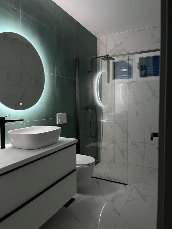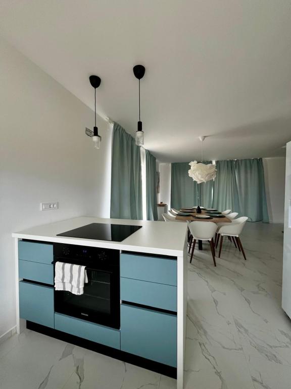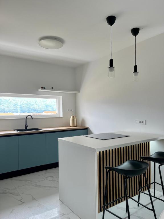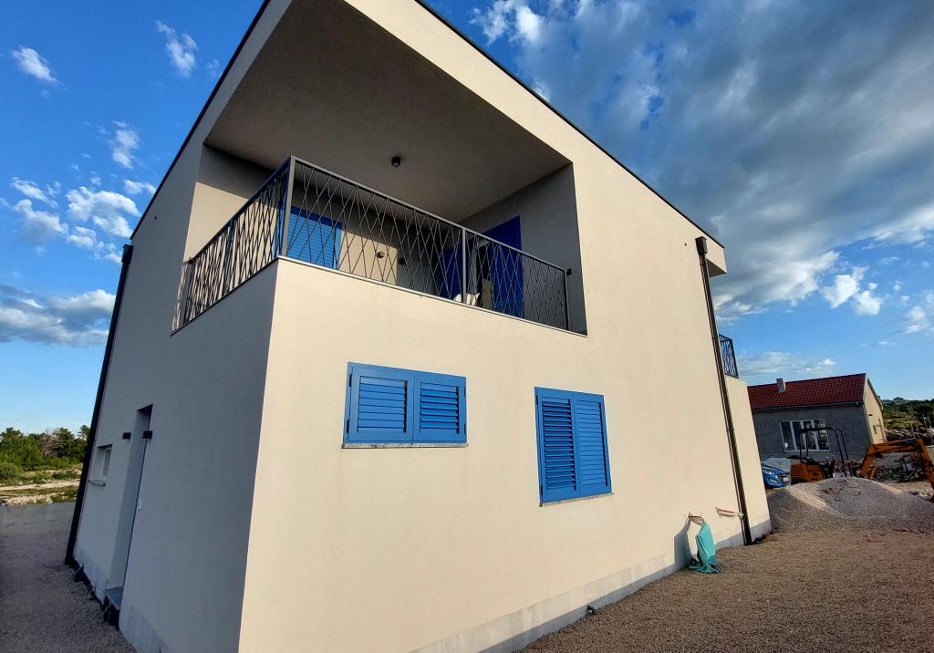 Comfortable accommodation in a holiday house created for enjoying with family and friends, a few minutes' walk from the beach. The house consists of a living room, dining room, kitchen, bedroom and bathroom on the ground floor and three bedrooms and two bathrooms on the first floor. The house is spacious and airy, and the ground floor opens onto a terrace with a dining table and an outdoor grill. There are also two terraces on the first floor, one of which has a view of the sea and Velebit.