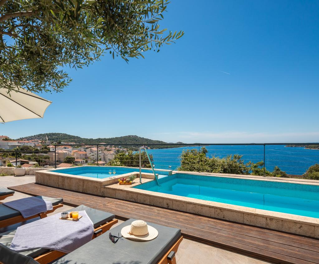 Charming villa with a beautiful sea view is located in Ražanj, a small town in the heart of Dalmatia. Villa Marija is an ideal choice for a vacation with family or friends in a peaceful, Mediterranean environment. Inside the villa there are 4 comfortable bedrooms, 3 modern bathrooms, a living room, a dining room and an equipped kitchen. In front of the villa is a spacious terrace with a swimming pool and sun loungers, which offers an open view of the sea. It is the perfect place for sunbathing and enjoying enchanting sunsets. The terrace also has an outdoor dining area and a barbecue. Guests have access to private parking in the fenced yard. The location of the villa offers numerous opportunities for enjoyment: swimming in the crystal clear sea, relaxing walks, cycling along well-maintained paths, boat trips, trips to national parks. Nearby are also popular tourist destinations Zadar, Šibenik, Primošten, Trogir and Split, which will enchant you with their beauty and rich cultural heritage.