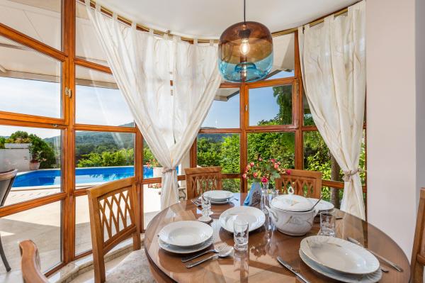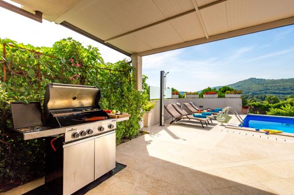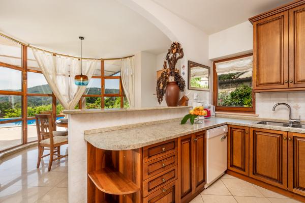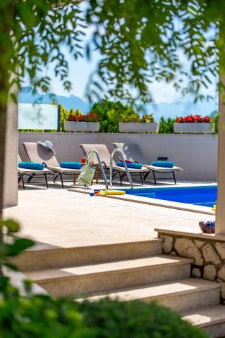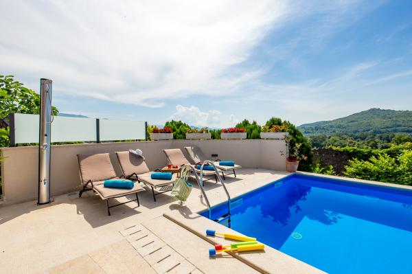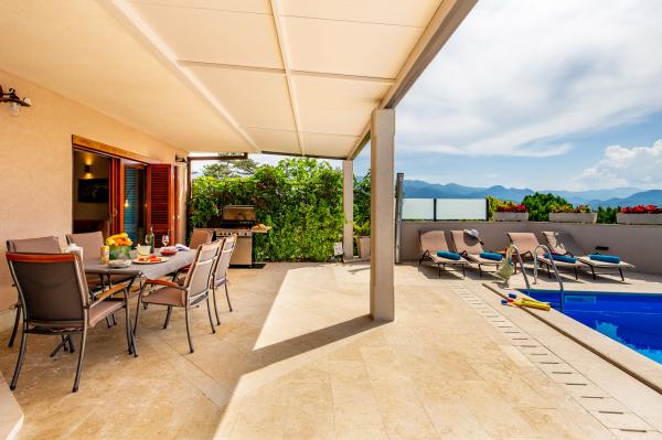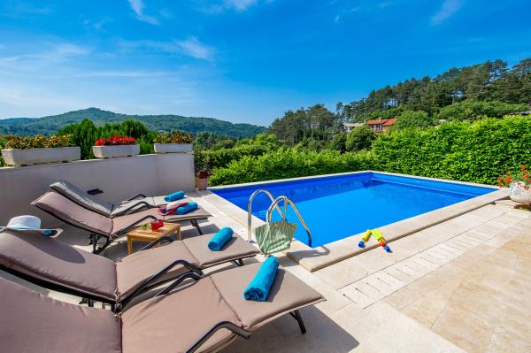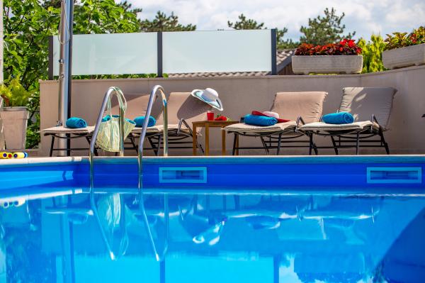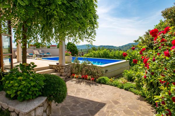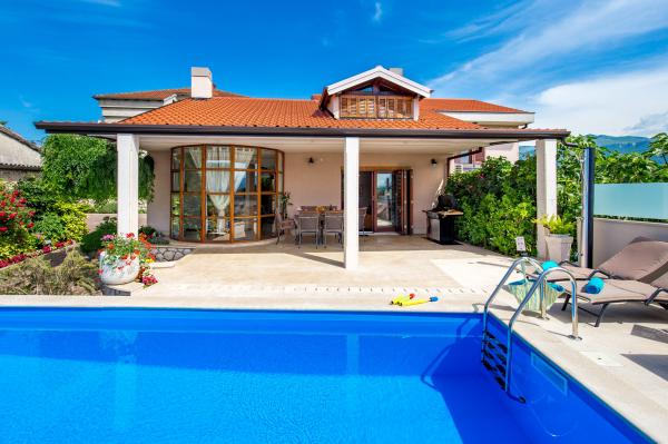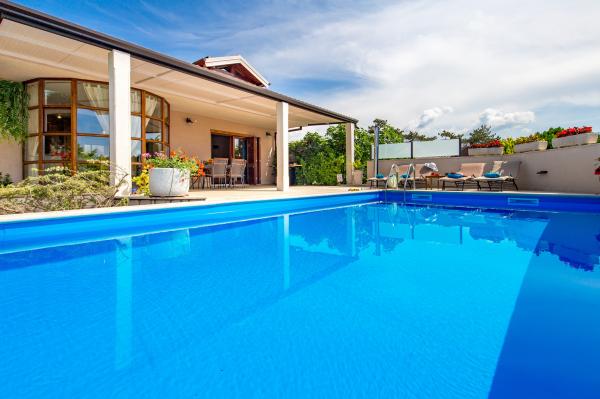 Villa Marijana is a beautiful ground floor holiday home located in the hinterland of Rijeka, in a quiet location near the beautiful tourist towns of Opatija and Crikvenica. Villa Marijana is a house with a spacious and warm pool of 30m2, comfortable, capacity for 7 persons and total living area of 220 m2. On the ground floor there is a bathroom, a kitchen, a dining room, a living room with a large covered terrace (with a grill), a beautiful view of the pool, and a beautiful flower garden and surrounding nature. The entire area on the terrace is very intimate and comfortable. In the semi-detached house there are three bedrooms (with balcony), bathroom and one additional room. The house also has a large garage as well as a covered outdoor parking space. In romantic summer evenings you can enjoy a rich gastronomic offer, various sights, rich events and concerts. Our guests are happy to go back and come back because they are confident that their vacation will be spent in comfort, the beauty of nature and peace.