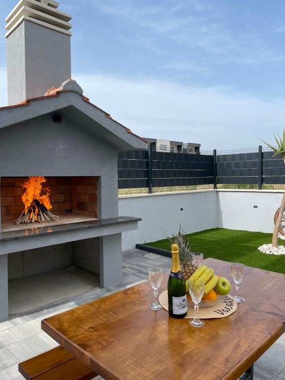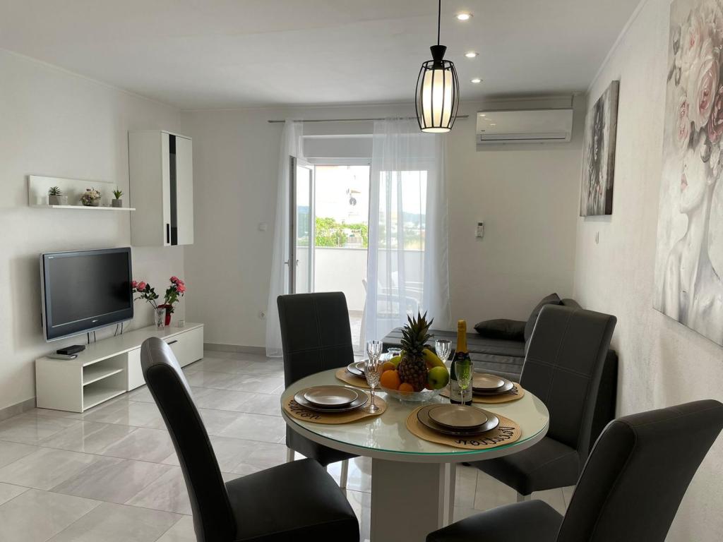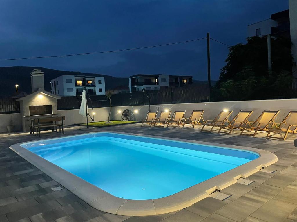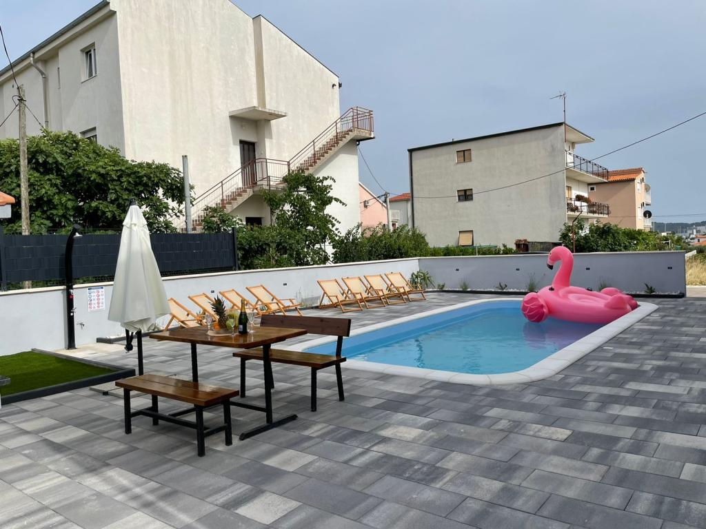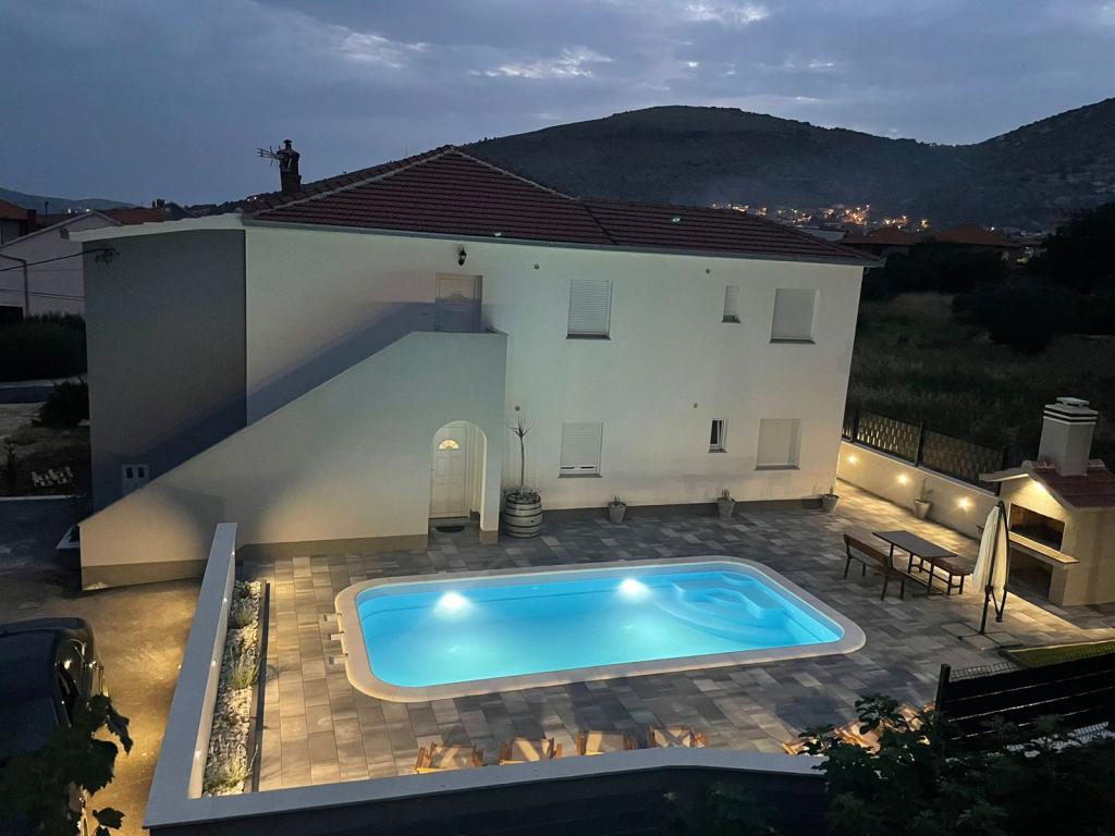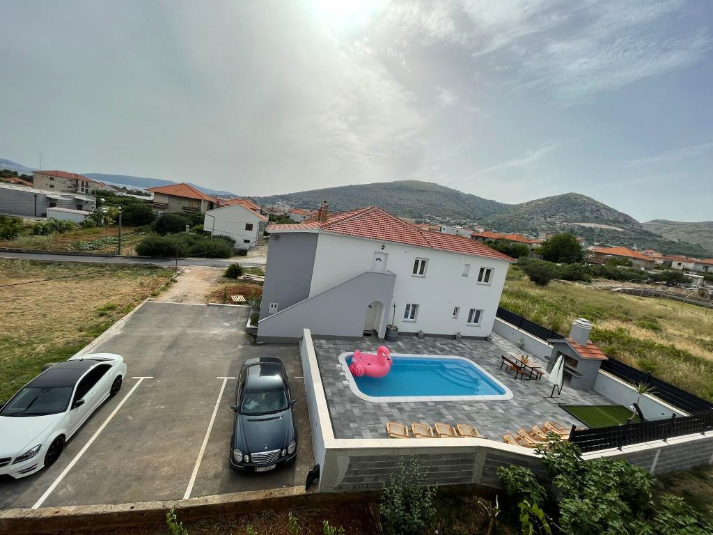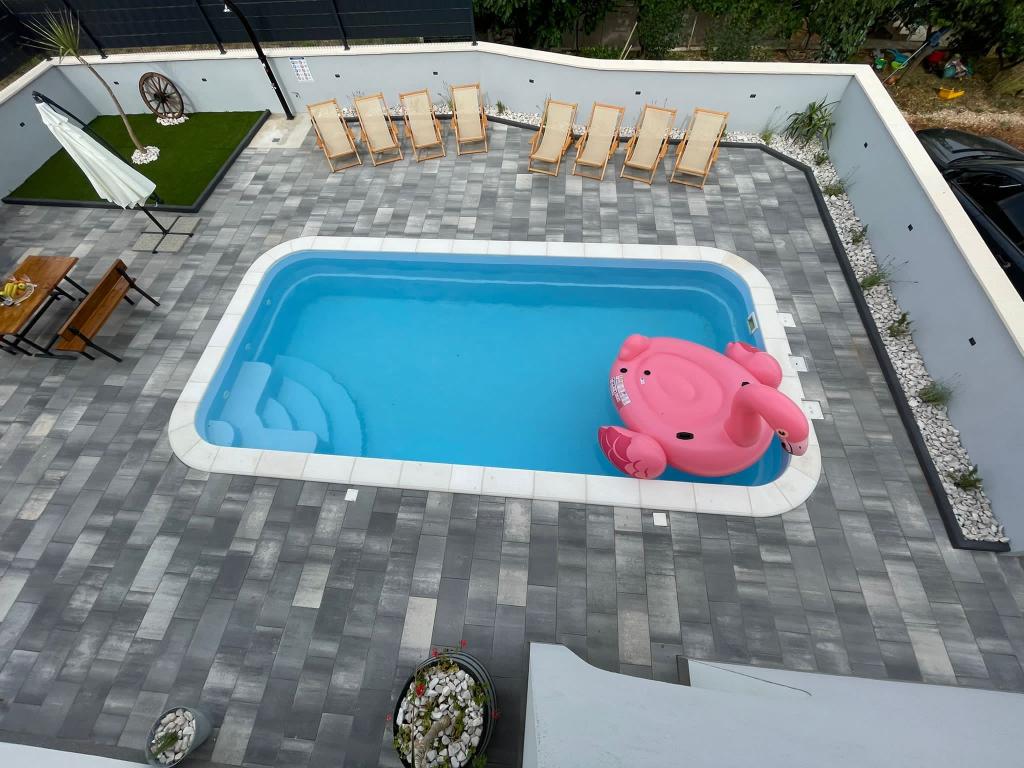 Newly furnished Villa in Seget Donji. 65 square meters and a large balcony of 15 square meters which is semi-closed. The building has one bathroom, two bedrooms with double beds. The villa has a garden of 168 square meters, a swimming pool of 30 square meters, an outdoor grill, deckchairs for resting, fire polo goals for the pool.