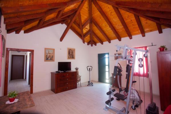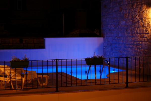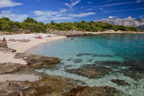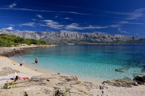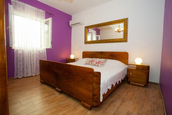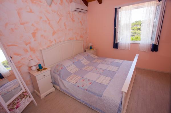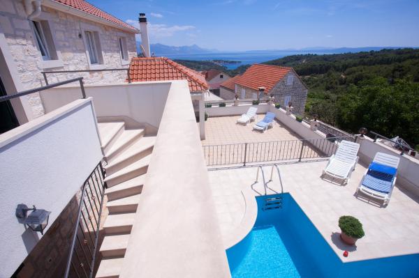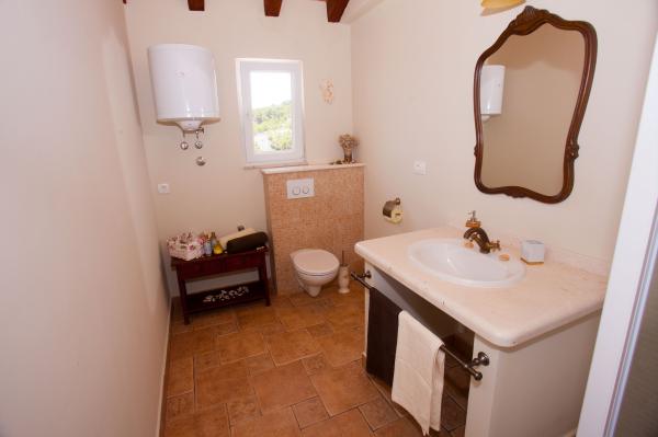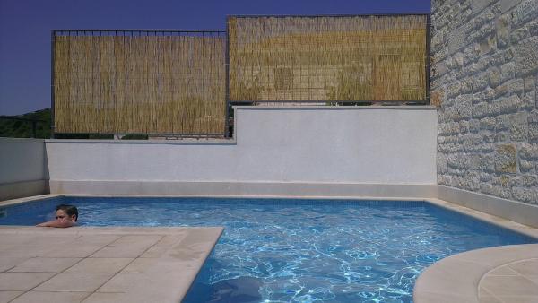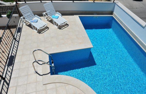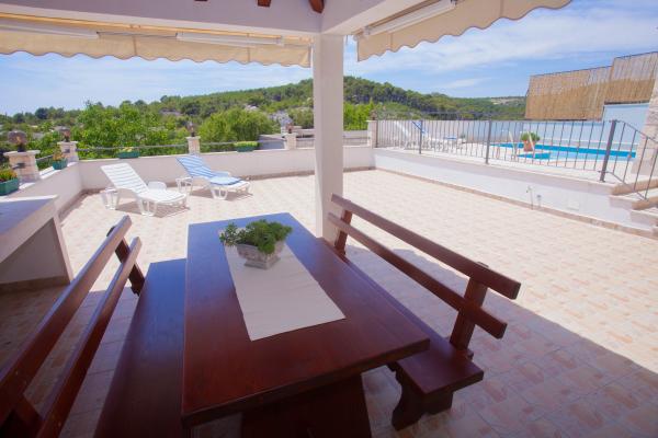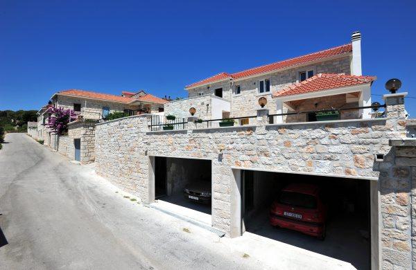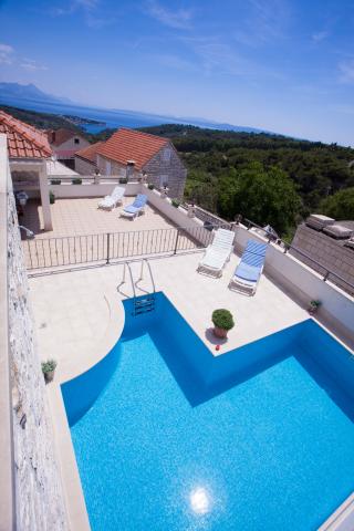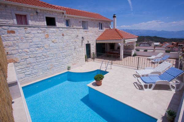 Comfortable and newly decorated holiday home (4) in Selca on the island Brač. The house has 2 floors, on the first floor there are 2 bedrooms, 2 complete bathrooms, kitchen with dining area and living room. On the ground floor there are 2 bedrooms with double bed, 2 bathrooms, and a rest room (lcd tv, dvd, well-being, exercise equipment) The house has a spacious terrace of 100m2, GRANULAR FLOOR 18m2 equipped with computer technology measuring water pH and chlorine dosing, covered part with grill and garden furniture. The house also has 2 parking places, ie a closed garage and a covered garage space