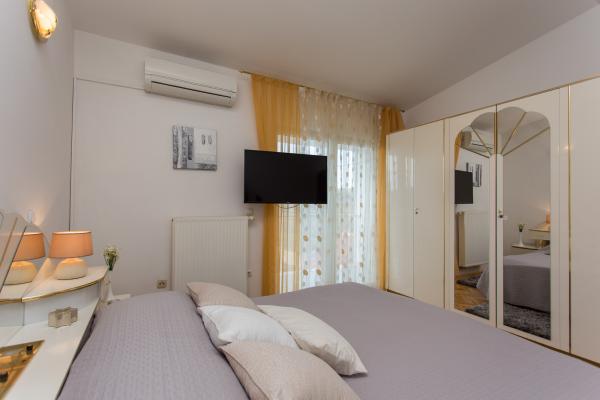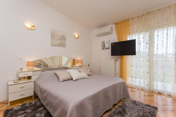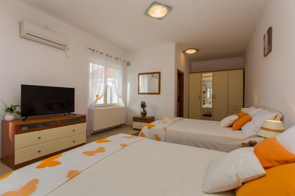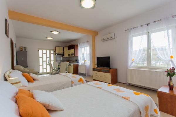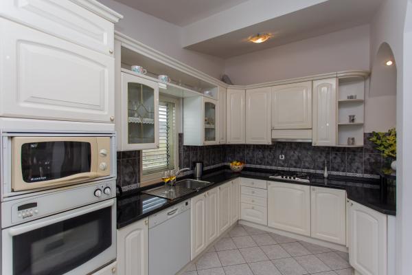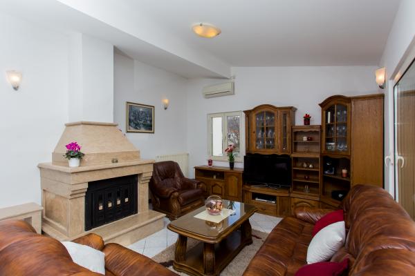 Residential tax is included in price.Rooms First floor Villa has 4 bedrooms on the 1st floor (3 bedrooms with 1 double bed and 1 bedroom with 2 single beds). Three double bedrooms have an Air conditioning, and one double bedroom has an en-suite bathroom. Main bathroom has a Jacuzzi tub, bidet, lavender and toilet and hair dryer. Fully equipped large kitchen with fridge and freezer, washing machine and everything you need for cooking and dinning is here for you to use. Living room with a large sofa with a fireplace, LCD TV with Satellite, air conditioning and a closed terrace in the front of the house Ground floor Of the ground floor there is a studio apartment with two large double bed, sofa bed for extra two people, fully equipped kitchen and bathroom.