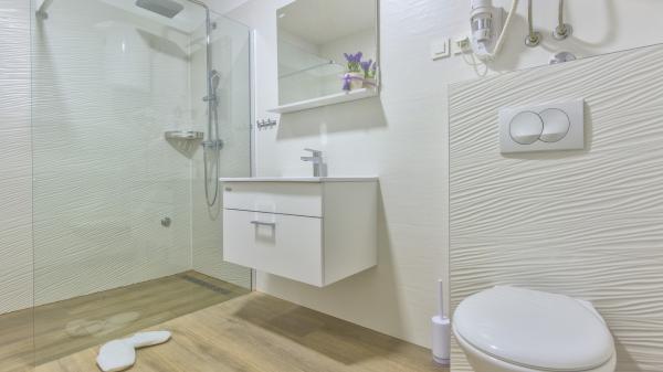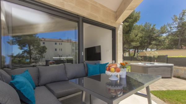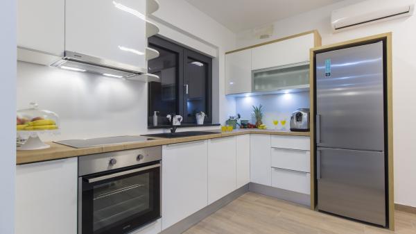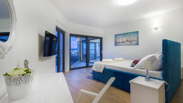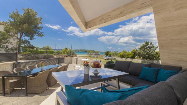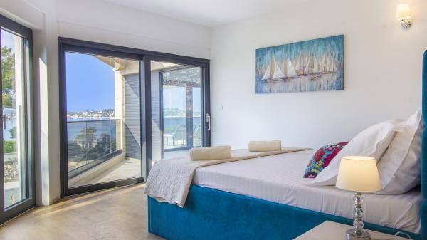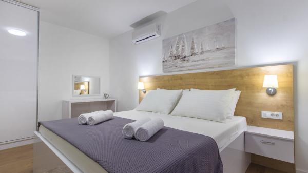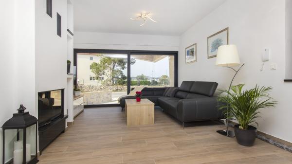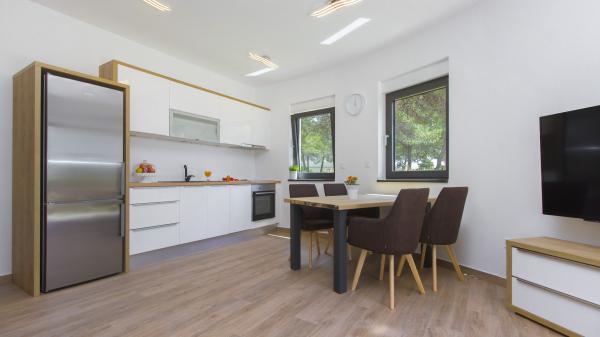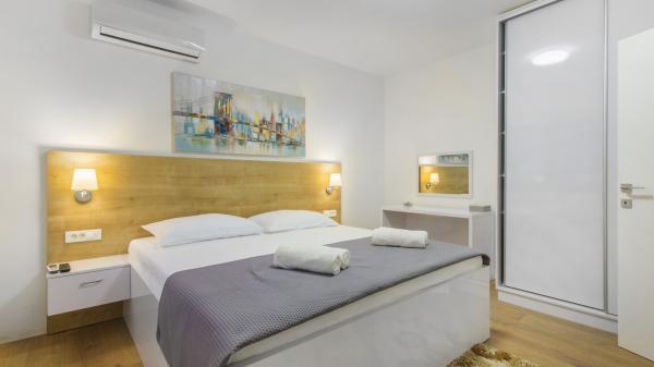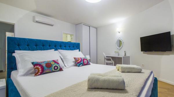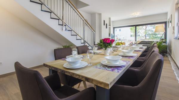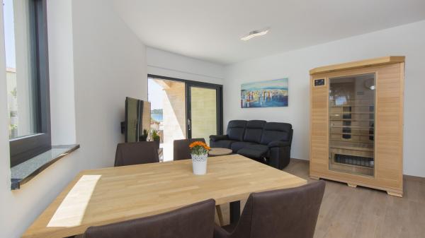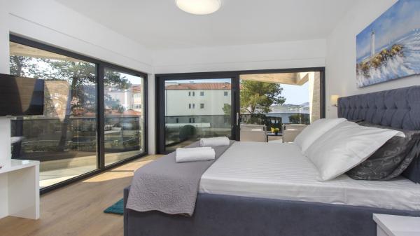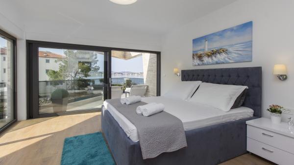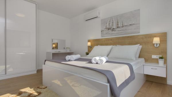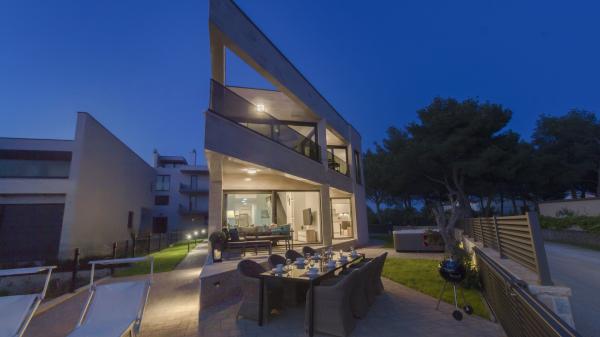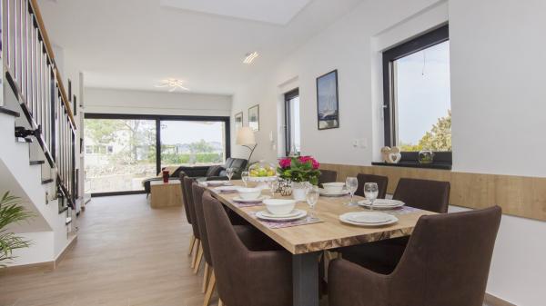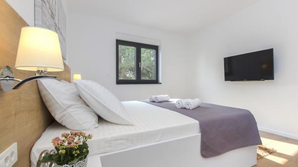 Villa Okit is a newly built and modern villa located only 50m from the sandy beach in Srima, 3km from Vodice, 13km from Šibenik. On the ground floor there is a kitchen, living room and living room that make up one unit and a separate bathroom, from the living room there is a terrace and a landscaped courtyard with garden furniture and a sunbathing area. The kitchen is fully equipped with necessary utensils and kitchenettes for preparing meals and drinks. On the ground floor there is also a separate apartment with one bedroom, bathroom, kitchen and dining room where you can exit the yard. On the 1st floor of the house there are 4 bedrooms and 3 bathrooms. Bedroom 1, 20m2 with private bathroom and exit to balcony, 180X200 bed, TV. Bedroom 2, 25m2, with private bathroom and exit to balcony, 180X200 bed, TV. Bedroom 3 and Spoke 4 have a shared bathroom, each 15m2 each, each has a 180x200 bed, a dresser and a TV. Fenced yard with sunbathing area and garden furniture, parking space.