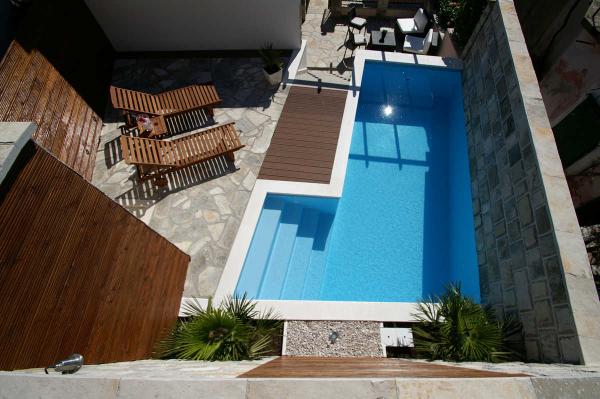 Fully equipped villa. A combination of traditional construction, stone and modern interior design. The villa is located on a hill at the foot of the Biokovo mountain. It has a beautiful view of the sea (700m as the crow flies from the sea). A paved road leads to the villa. The villa has a modern kitchen (with a dishwasher), a modern bathroom, 2 bedrooms and a living room with a fireplace (possible room for 2 people). With a large terrace, next to the villa is a 5 x 4 swimming pool and landscaped surroundings (loungers, outdoor shower).