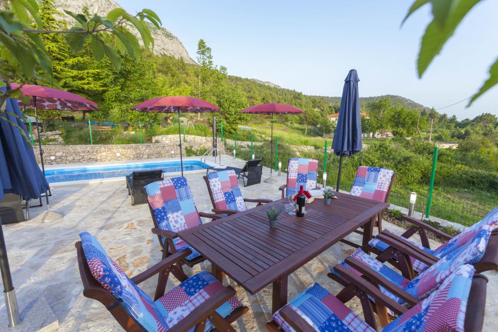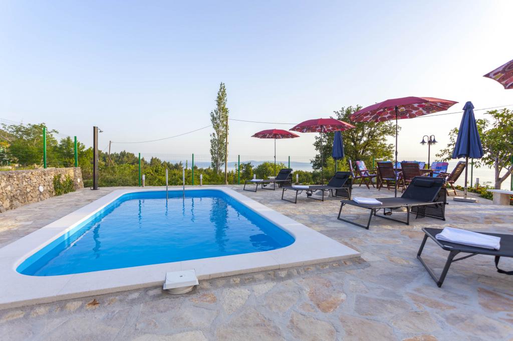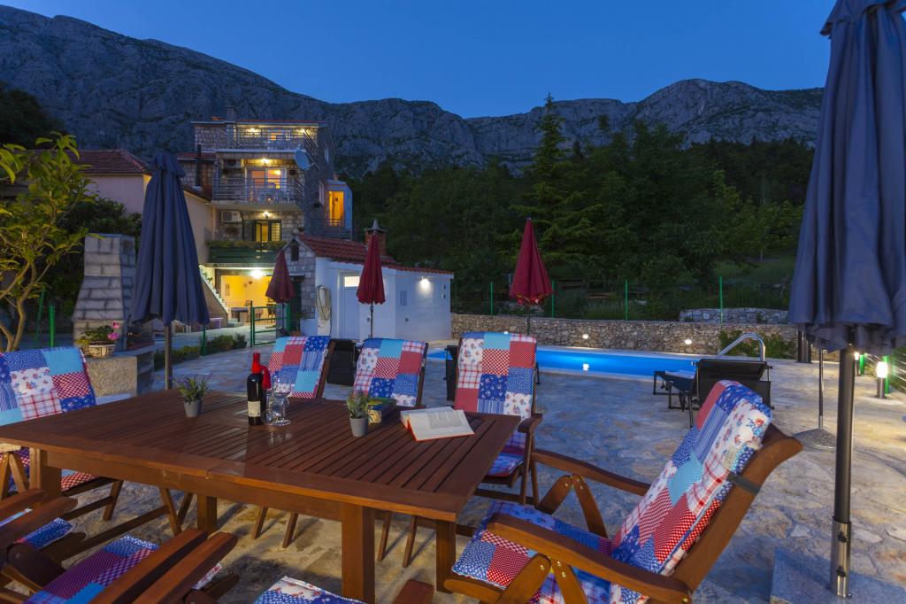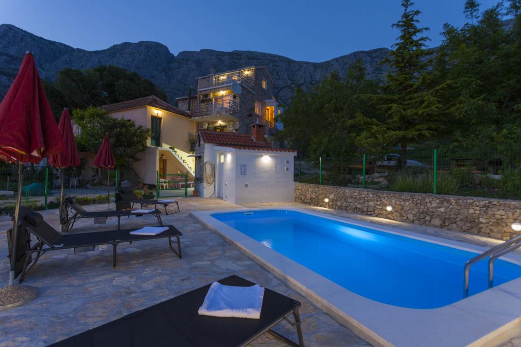 Dear guests, Our house is located in Tucepa gornja in the center of the village at the foot of the mountain Biokovo from where there is a beautiful view of the coast and islands. The house is surrounded by greenery, gardens and trees with benches and tables. The house has a ground floor where the hosts live, and the first and second floor with an attic are rented to tourists. It is possible to accommodate 8 plus 2 on an extra bed in the house. The first floor has 2 rooms with double bed (2 plus 2) and has the possibility of using and staying 2 more people on an extra bed (70 m 2). The second floor has a large living room and a room for 2 people, and in the attic is a second room for 2 people (all together 130 m2). There is also a pool 6 x 3 m on a large spacious stone terrace, with an outdoor fireplace for barbecue, indoor fireplace, table, chairs, deck chairs, umbrellas, and all other equipment. We raise chickens, geese and we also own a German Shepherd. Nearby are 3 beautiful restaurants 200 m away. We look forward to your arrival and welcome you