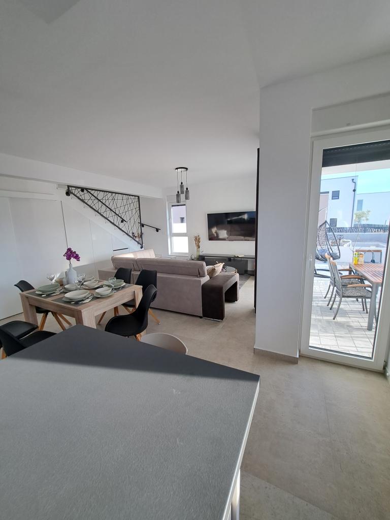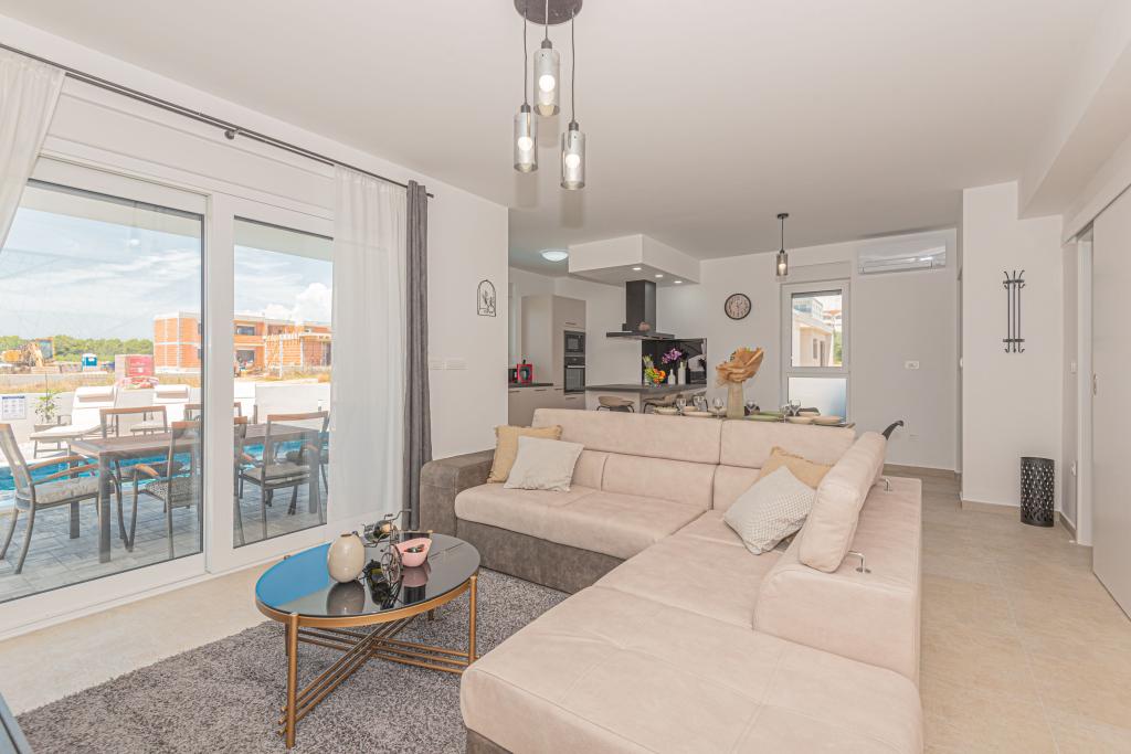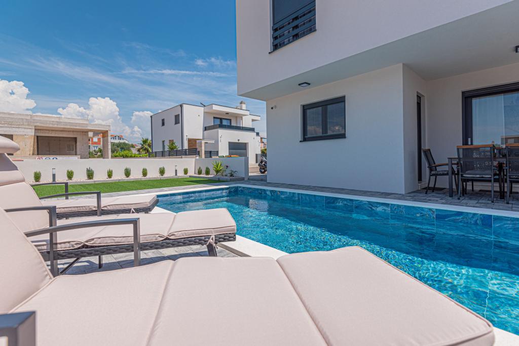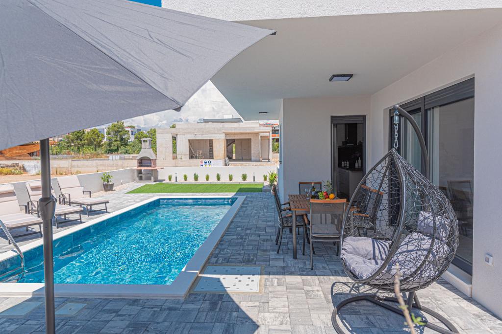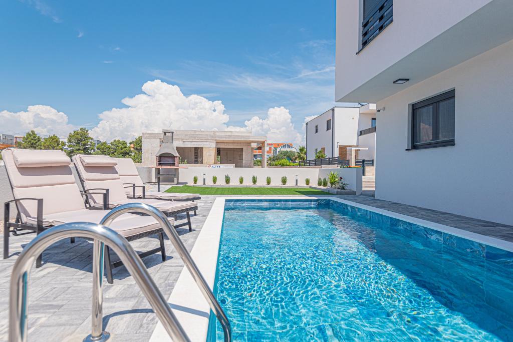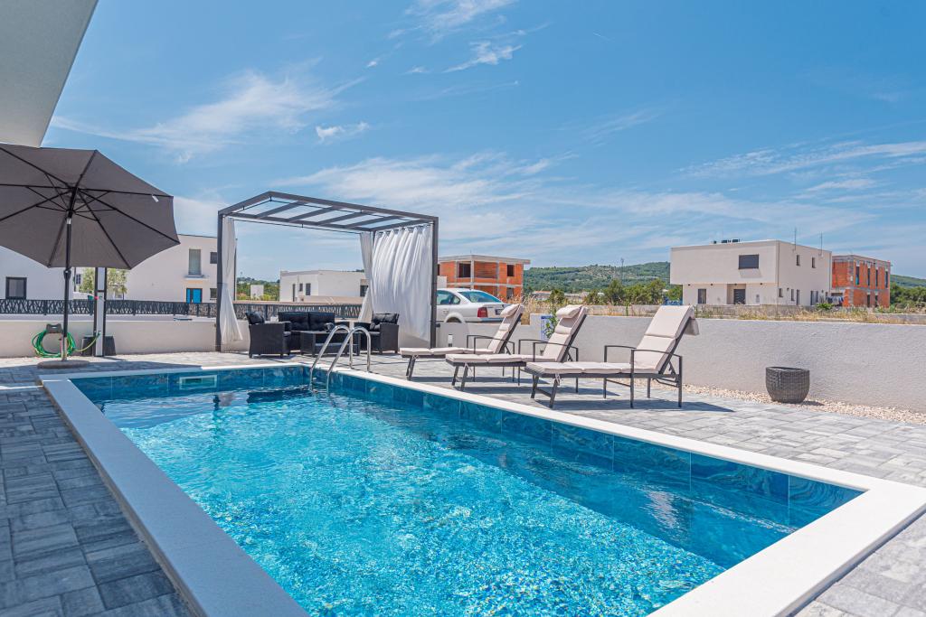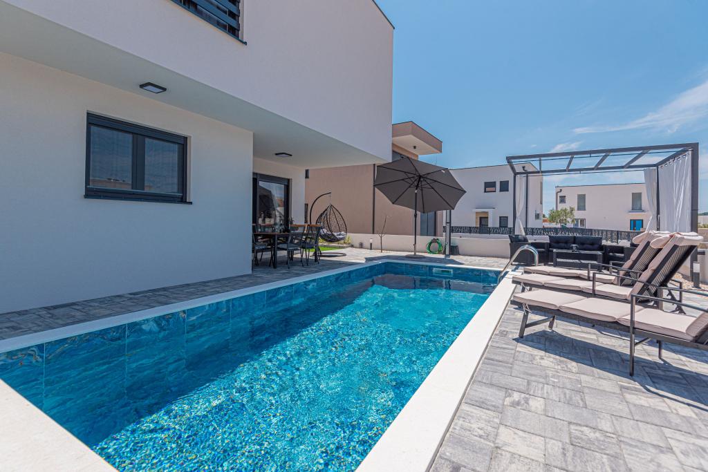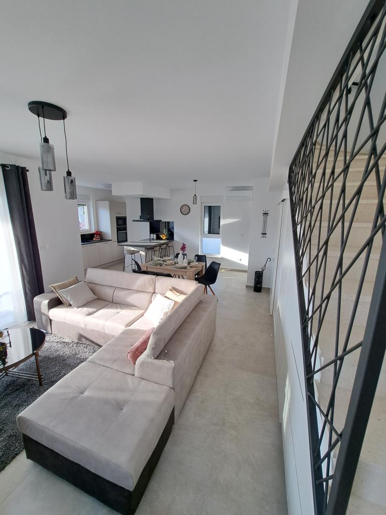 A new, fully furnished villa with a swimming pool in a quiet corner of the town of Vodice, about 1 km or a 15-minute walk from the center, the beach and other facilities. The villa has a swimming pool 7x3 m, 1.5 m deep, heated, next to the pool there are deckchairs, a garden swing and furniture for resting in the gazebo. The backyard has an outdoor grill and a dining table. The house has three rooms on the first floor, a master bedroom with a bathroom and two rooms with a bathroom in the common corridor. The beds in two rooms have dimensions of 180x200 cm, and the third room has separate beds, 90x200 and 120x200. All rooms are equipped with TV and air conditioning. Bed linen and towels are available to guests. On the ground floor, the kitchen is fully equipped with dishes, a toaster, a stick mixer and an electric juicer for citrus fruits, as well as a filter coffee machine. The kitchen has a dishwasher, fridge and freezer, oven and microwave. The living room has a corner sofa and a TV with internet and satellite channels.