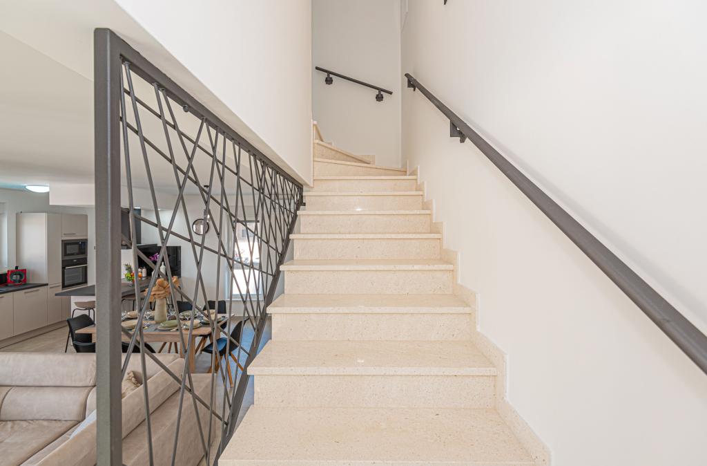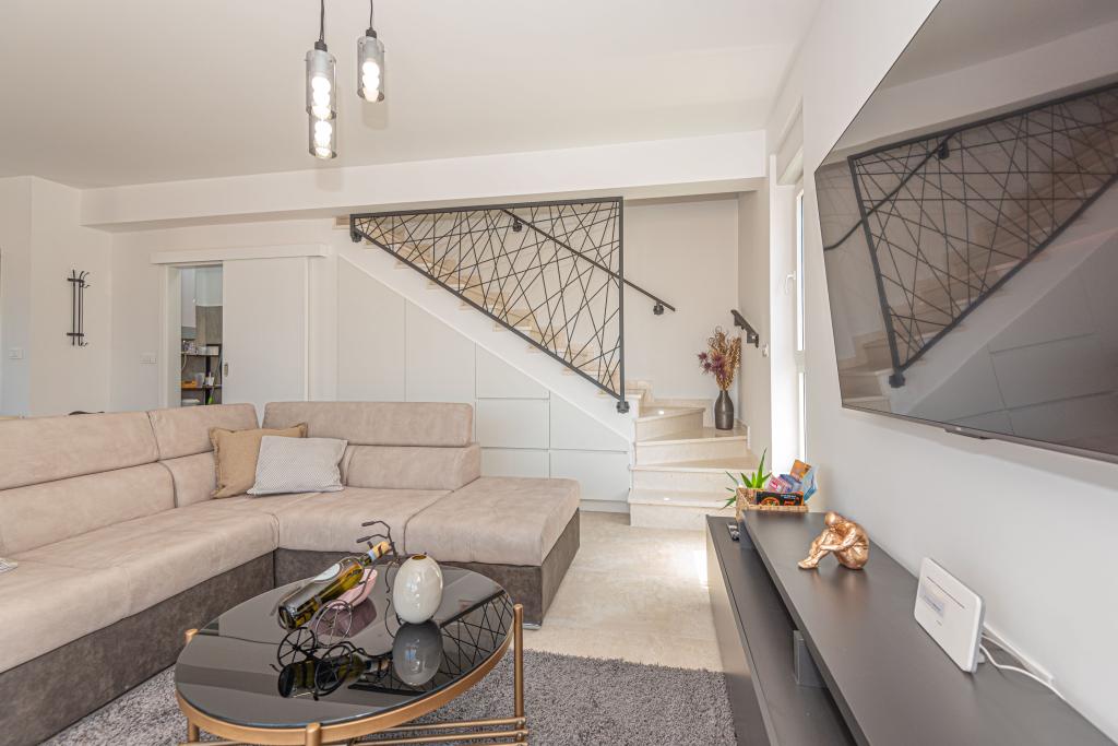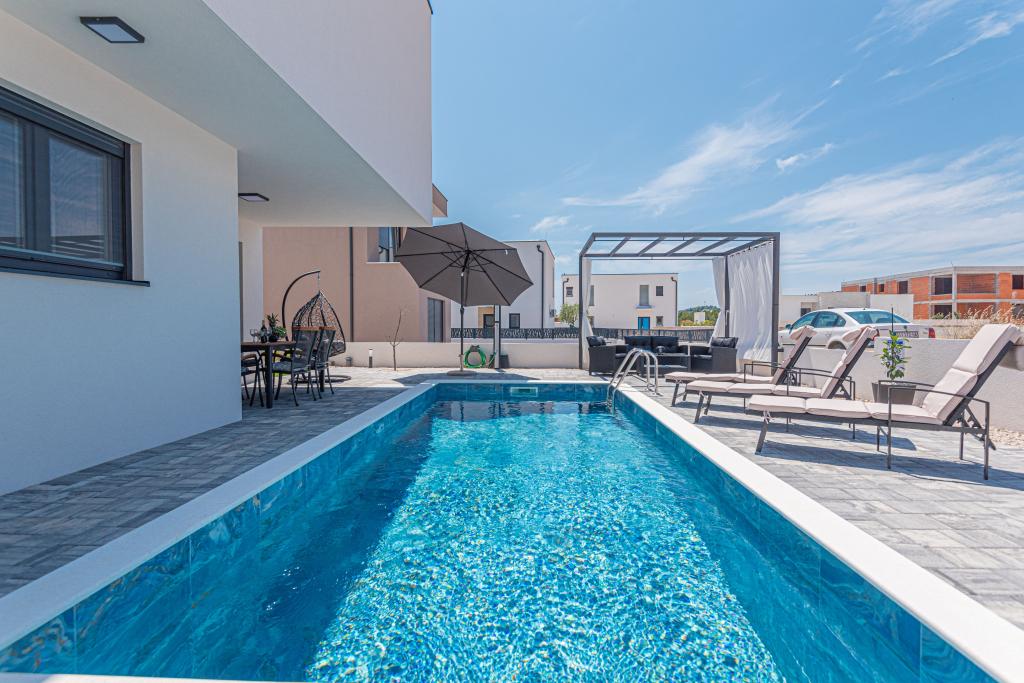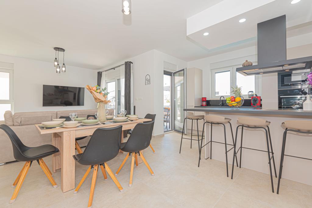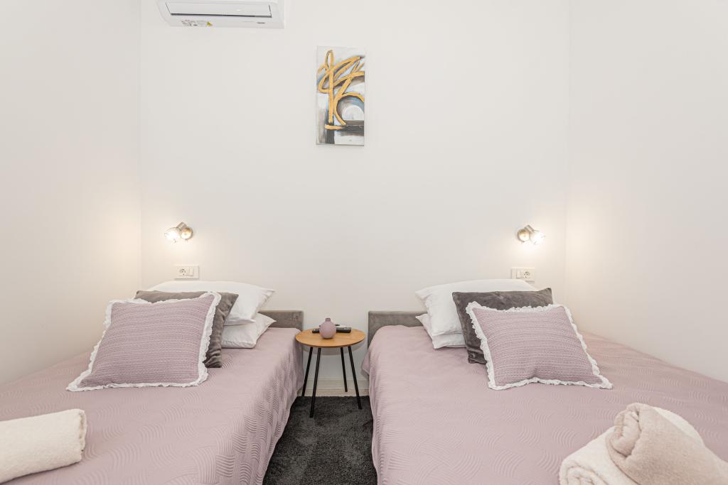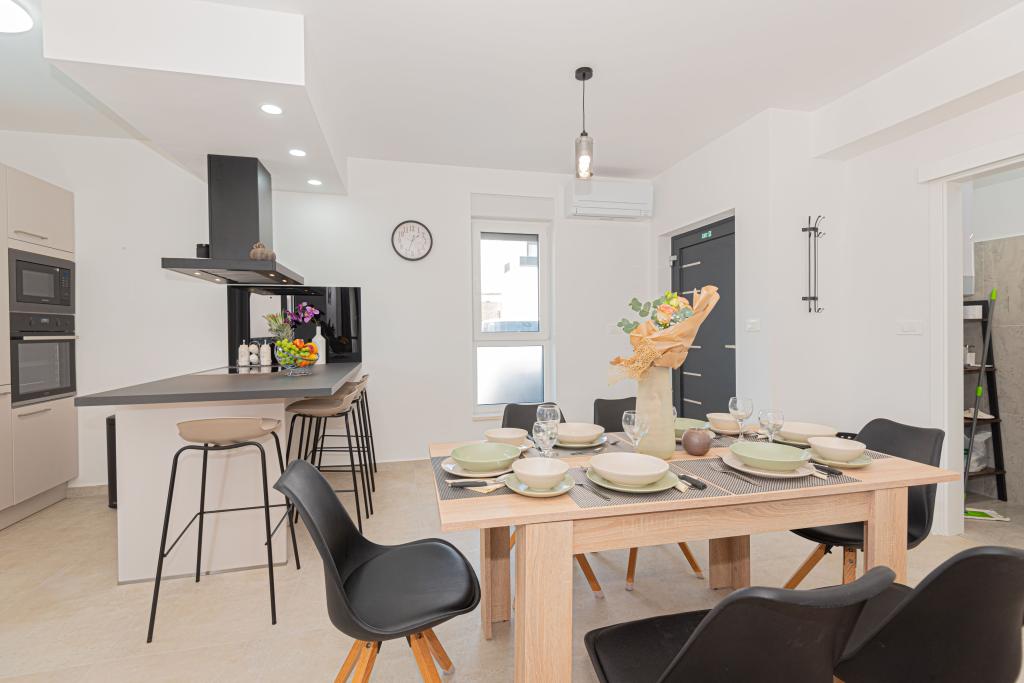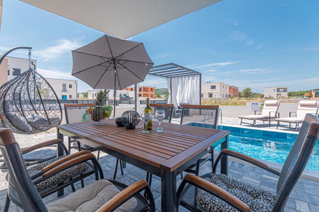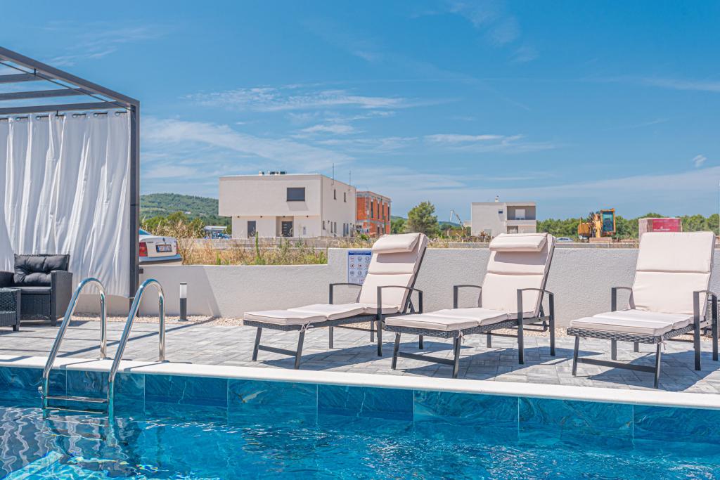 A new, fully furnished villa with a swimming pool in a quiet corner of the town of Vodice, about 1 km or a 15-minute walk from the center, the beach and other facilities. The villa has a swimming pool 7x3 m, 1.5 m deep, heated, next to the pool there are deckchairs, a garden swing and furniture for resting in the gazebo. The backyard has an outdoor grill and a dining table. The house has three rooms on the first floor, a master bedroom with a bathroom and two rooms with a bathroom in the common corridor. The beds in two rooms have dimensions of 180x200 cm, and the third room has separate beds, 90x200 and 120x200. All rooms are equipped with TV and air conditioning. Bed linen and towels are available to guests. On the ground floor, the kitchen is fully equipped with dishes, a toaster, a stick mixer and an electric juicer for citrus fruits, as well as a filter coffee machine. The kitchen has a dishwasher, fridge and freezer, oven and microwave. The living room has a corner sofa and a TV with internet and satellite channels.
