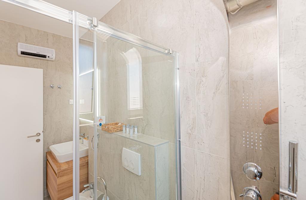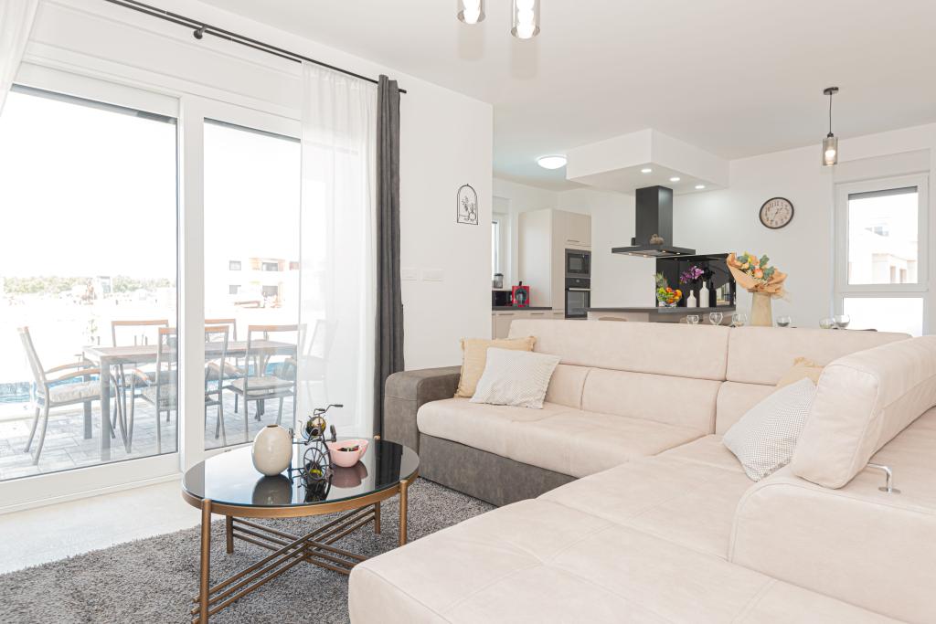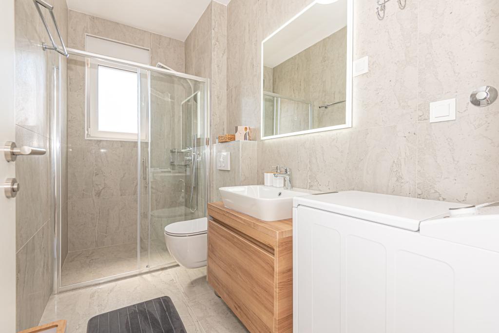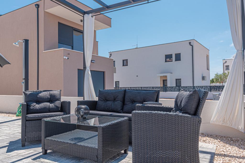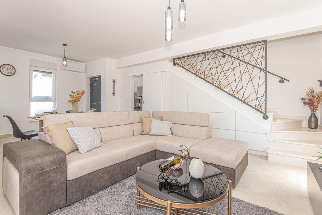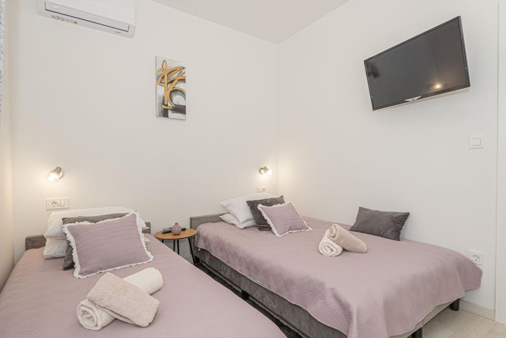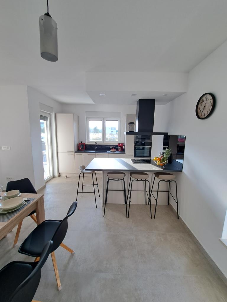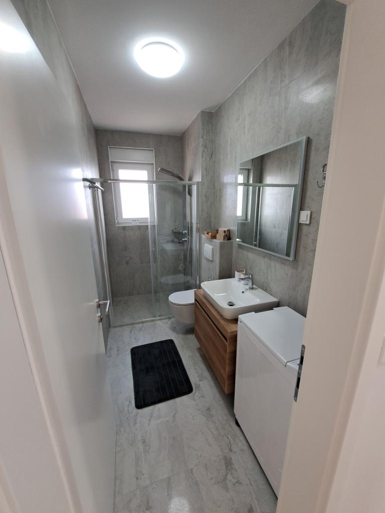 A new, fully furnished villa with a swimming pool in a quiet corner of the town of Vodice, about 1 km or a 15-minute walk from the center, the beach and other facilities. The villa has a swimming pool 7x3 m, 1.5 m deep, heated, next to the pool there are deckchairs, a garden swing and furniture for resting in the gazebo. The backyard has an outdoor grill and a dining table. The house has three rooms on the first floor, a master bedroom with a bathroom and two rooms with a bathroom in the common corridor. The beds in two rooms have dimensions of 180x200 cm, and the third room has separate beds, 90x200 and 120x200. All rooms are equipped with TV and air conditioning. Bed linen and towels are available to guests. On the ground floor, the kitchen is fully equipped with dishes, a toaster, a stick mixer and an electric juicer for citrus fruits, as well as a filter coffee machine. The kitchen has a dishwasher, fridge and freezer, oven and microwave. The living room has a corner sofa and a TV with internet and satellite channels.