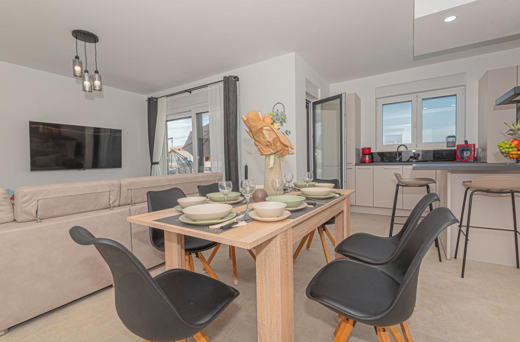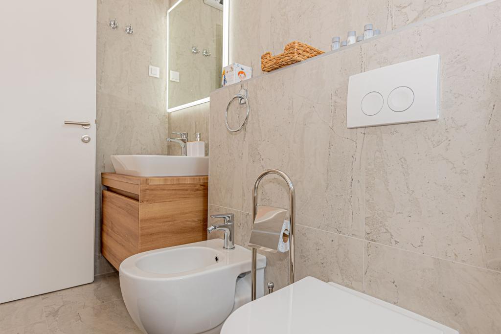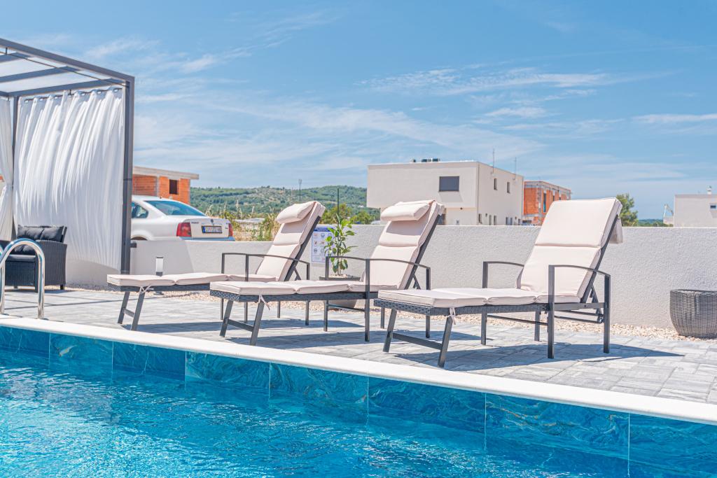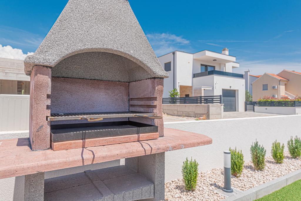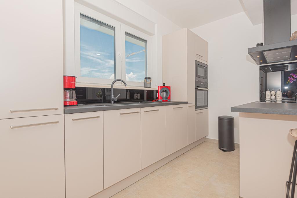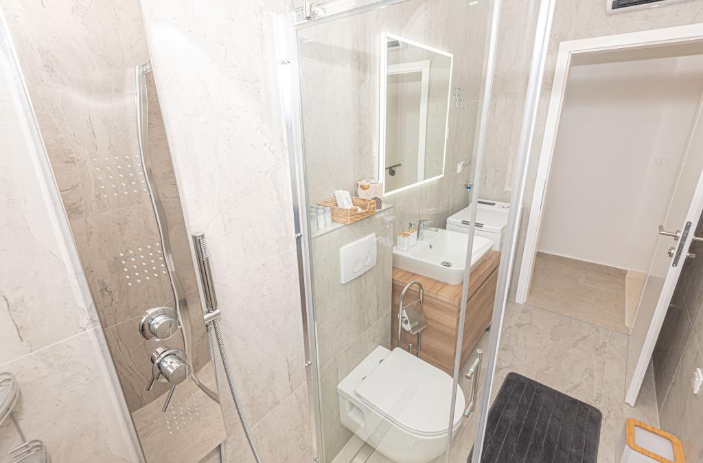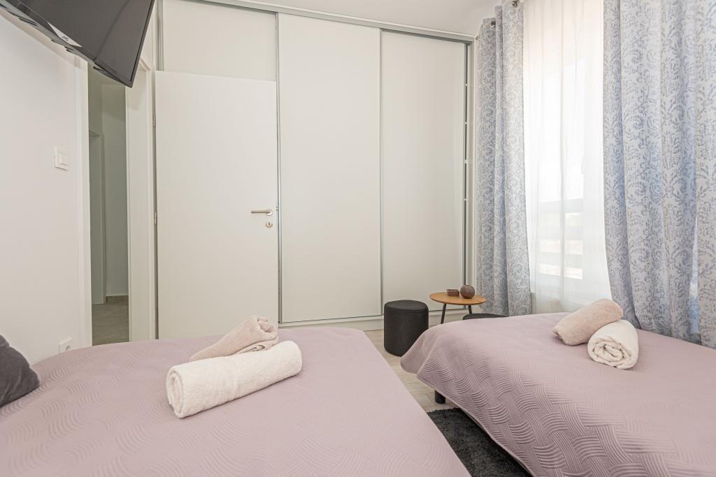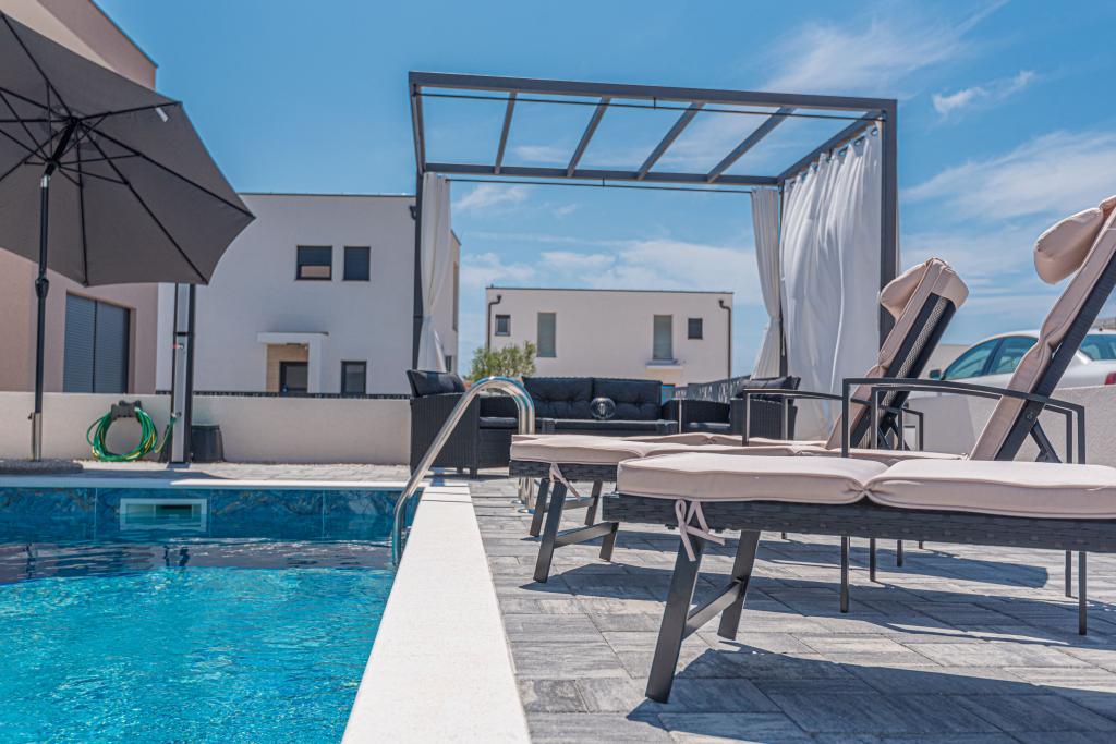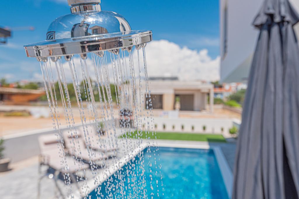 A new, fully furnished villa with a swimming pool in a quiet corner of the town of Vodice, about 1 km or a 15-minute walk from the center, the beach and other facilities. The villa has a swimming pool 7x3 m, 1.5 m deep, heated, next to the pool there are deckchairs, a garden swing and furniture for resting in the gazebo. The backyard has an outdoor grill and a dining table. The house has three rooms on the first floor, a master bedroom with a bathroom and two rooms with a bathroom in the common corridor. The beds in two rooms have dimensions of 180x200 cm, and the third room has separate beds, 90x200 and 120x200. All rooms are equipped with TV and air conditioning. Bed linen and towels are available to guests. On the ground floor, the kitchen is fully equipped with dishes, a toaster, a stick mixer and an electric juicer for citrus fruits, as well as a filter coffee machine. The kitchen has a dishwasher, fridge and freezer, oven and microwave. The living room has a corner sofa and a TV with internet and satellite channels.