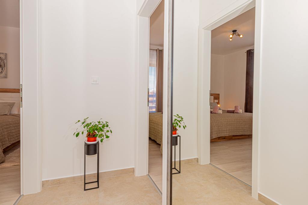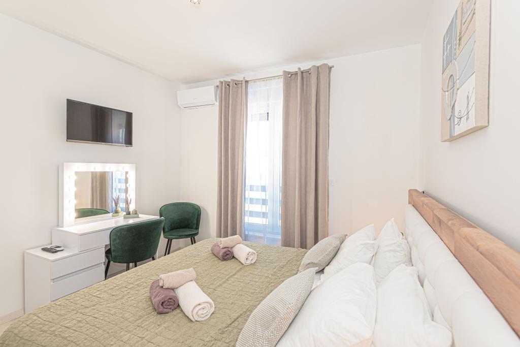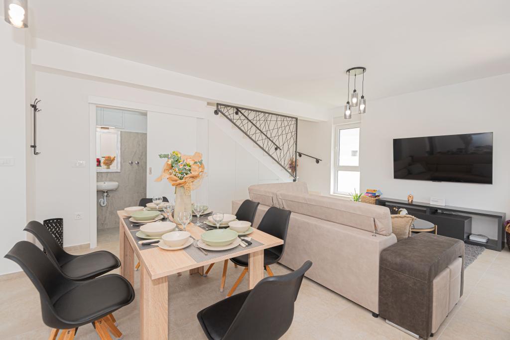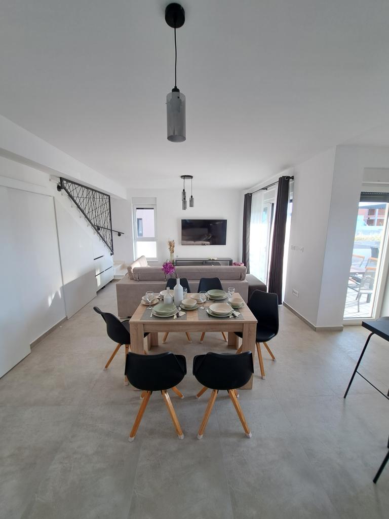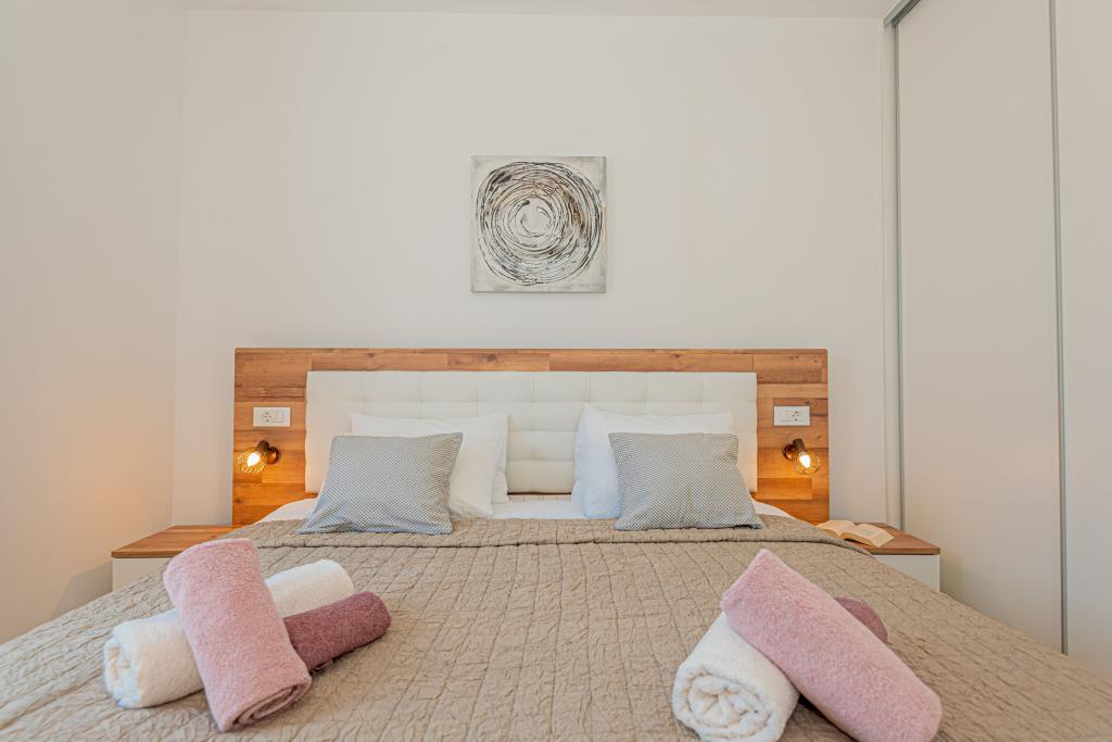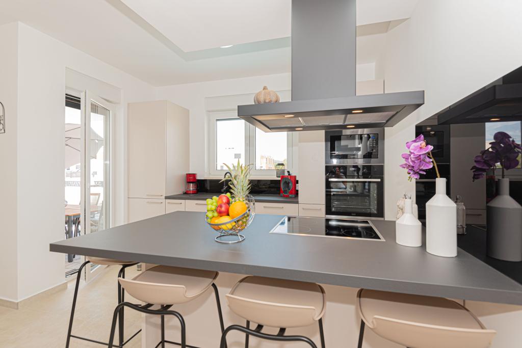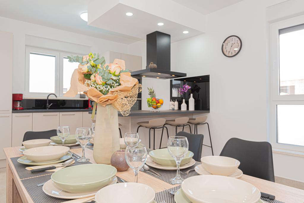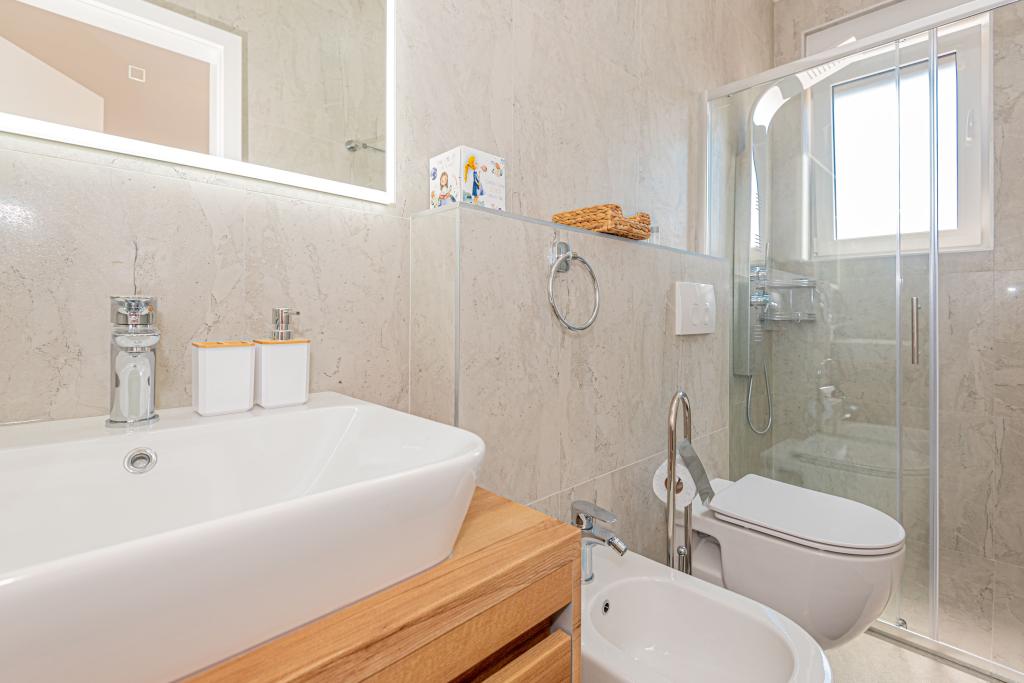 A new, fully furnished villa with a swimming pool in a quiet corner of the town of Vodice, about 1 km or a 15-minute walk from the center, the beach and other facilities. The villa has a swimming pool 7x3 m, 1.5 m deep, heated, next to the pool there are deckchairs, a garden swing and furniture for resting in the gazebo. The backyard has an outdoor grill and a dining table. The house has three rooms on the first floor, a master bedroom with a bathroom and two rooms with a bathroom in the common corridor. The beds in two rooms have dimensions of 180x200 cm, and the third room has separate beds, 90x200 and 120x200. All rooms are equipped with TV and air conditioning. Bed linen and towels are available to guests. On the ground floor, the kitchen is fully equipped with dishes, a toaster, a stick mixer and an electric juicer for citrus fruits, as well as a filter coffee machine. The kitchen has a dishwasher, fridge and freezer, oven and microwave. The living room has a corner sofa and a TV with internet and satellite channels.