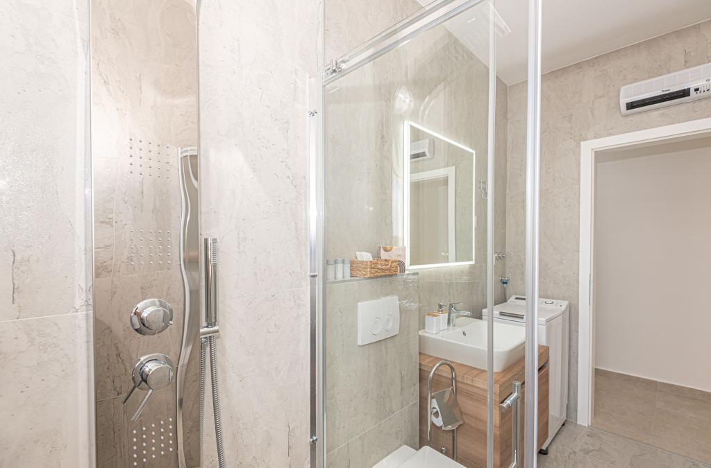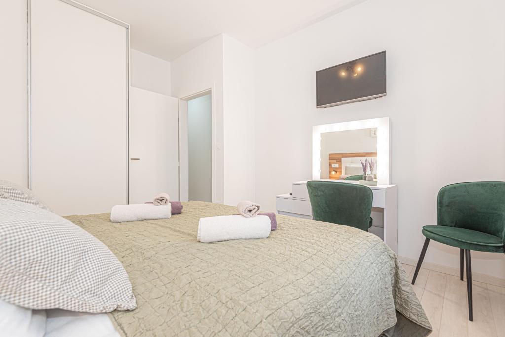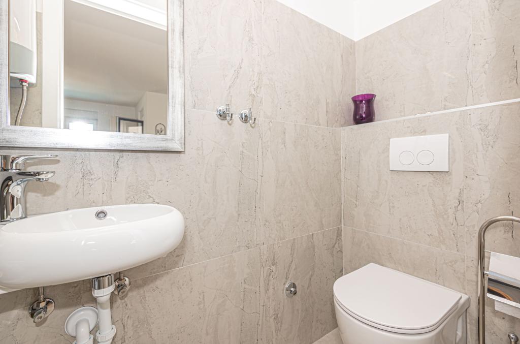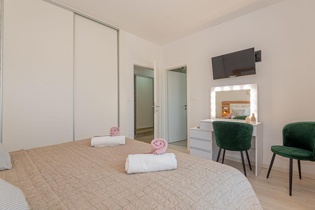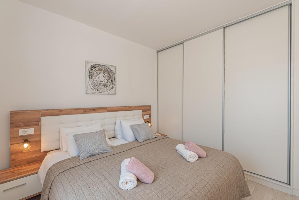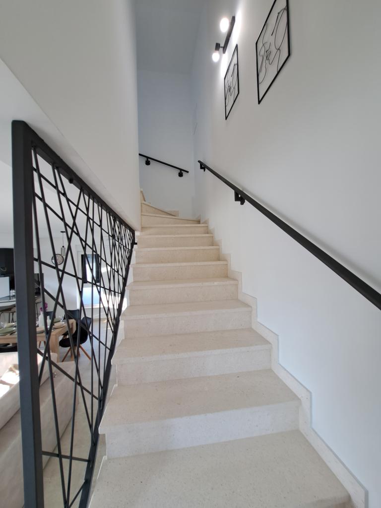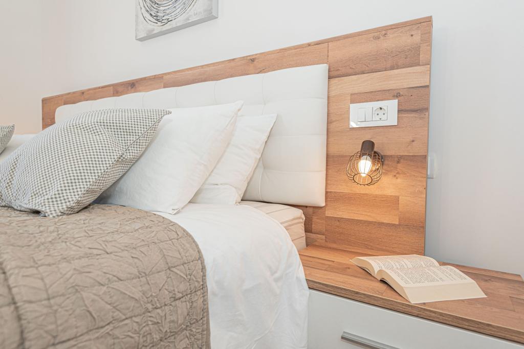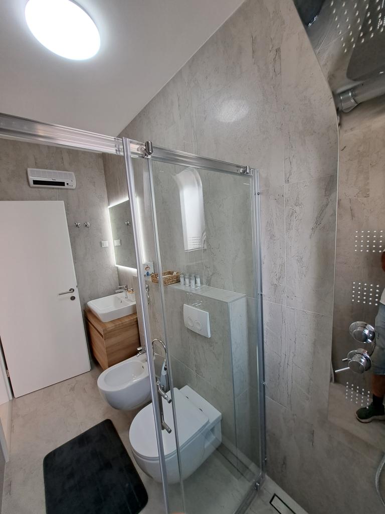 A new, fully furnished villa with a swimming pool in a quiet corner of the town of Vodice, about 1 km or a 15-minute walk from the center, the beach and other facilities. The villa has a swimming pool 7x3 m, 1.5 m deep, heated, next to the pool there are deckchairs, a garden swing and furniture for resting in the gazebo. The backyard has an outdoor grill and a dining table. The house has three rooms on the first floor, a master bedroom with a bathroom and two rooms with a bathroom in the common corridor. The beds in two rooms have dimensions of 180x200 cm, and the third room has separate beds, 90x200 and 120x200. All rooms are equipped with TV and air conditioning. Bed linen and towels are available to guests. On the ground floor, the kitchen is fully equipped with dishes, a toaster, a stick mixer and an electric juicer for citrus fruits, as well as a filter coffee machine. The kitchen has a dishwasher, fridge and freezer, oven and microwave. The living room has a corner sofa and a TV with internet and satellite channels.