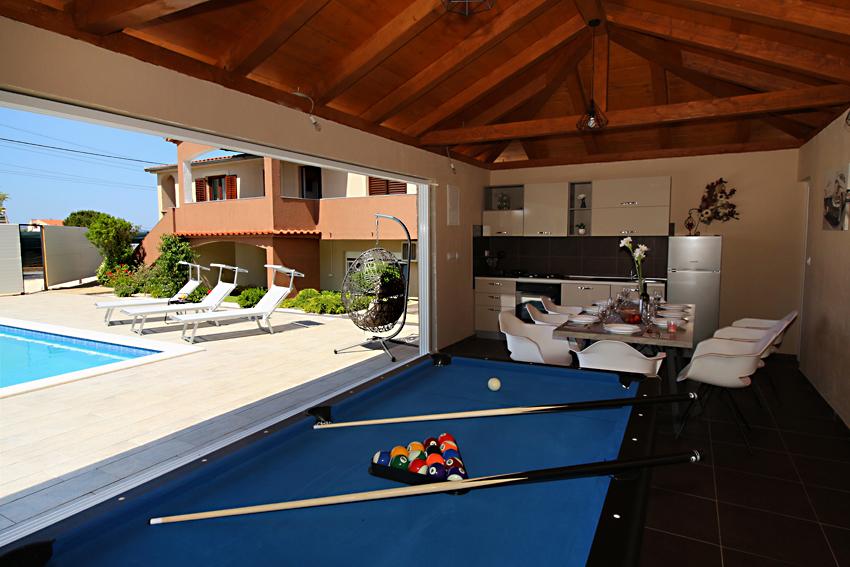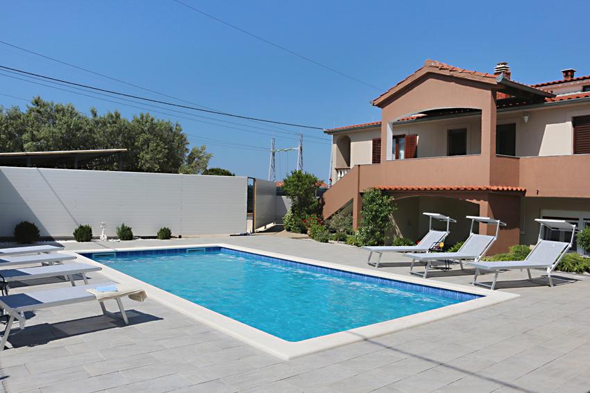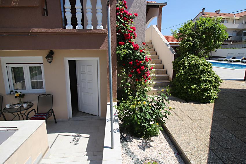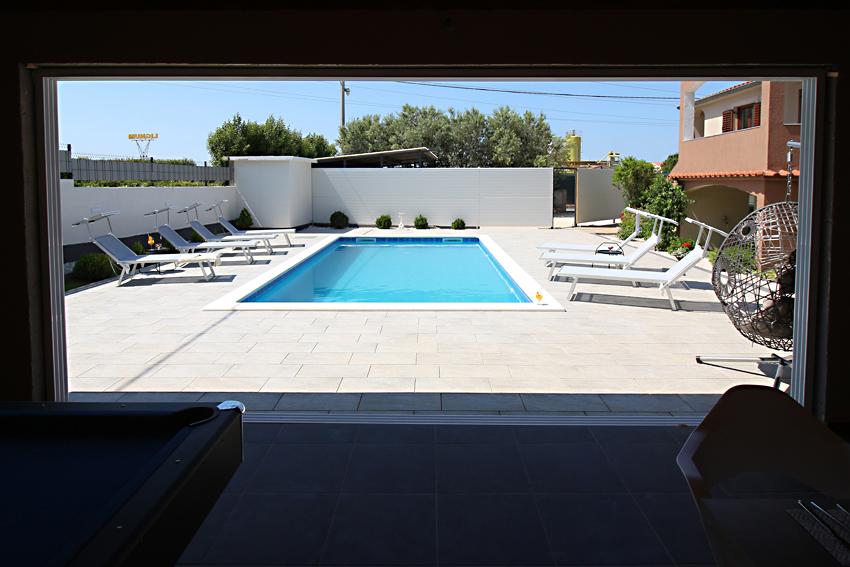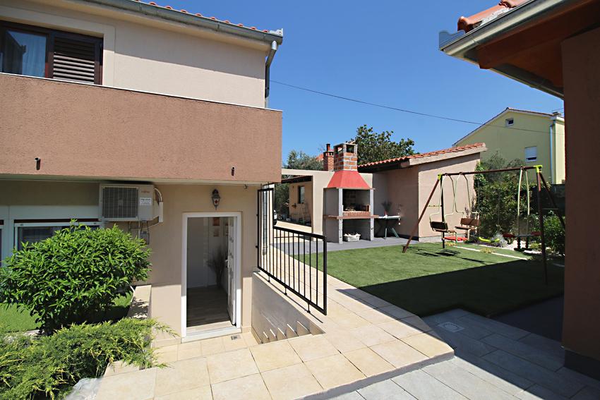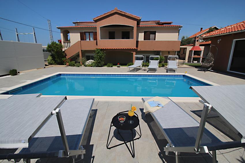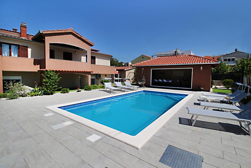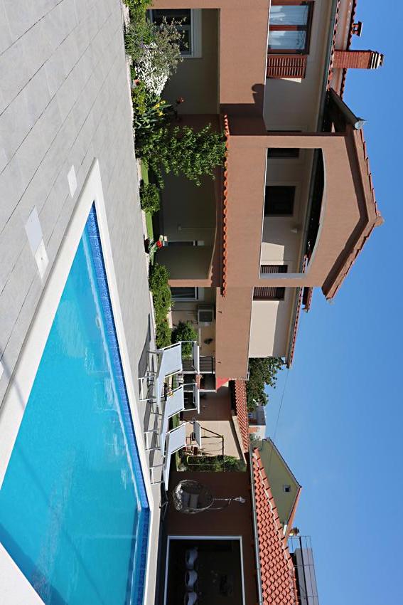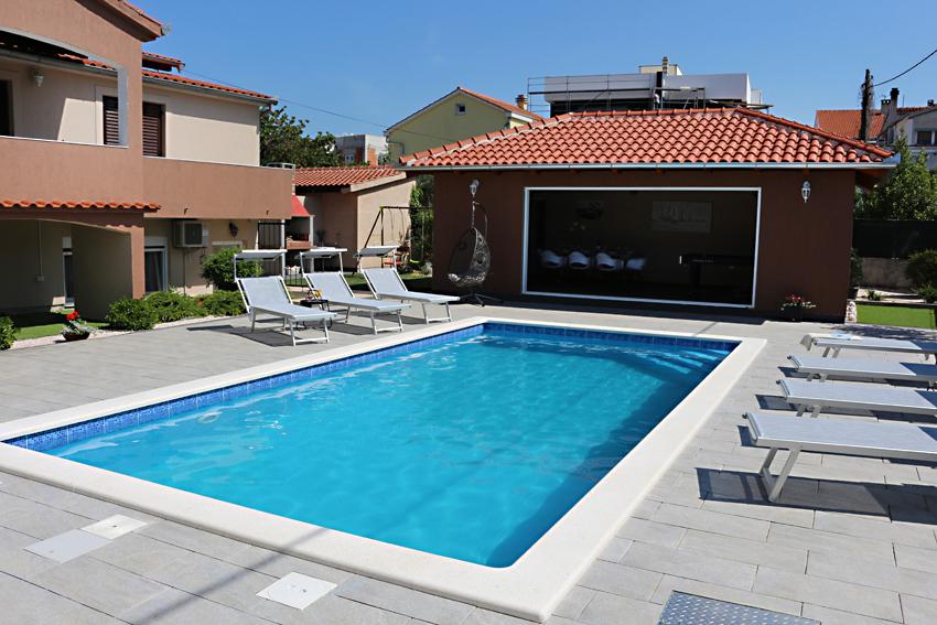 Villa Anda is located in Zadar, 3 kilometers from the city center. It consists of 3 apartments that are designed for the same group of guests, which means that there will be no other guests in the building except you. Upstairs apartment consists of 2 bedrooms, one with a double bed and the other with a single bed. The apartment also has a TV, air conditioning, bathroom and kitchen with all necessary cutlery. On the ground floor there are 2 studio apartments of equal size and each has a TV, air conditioning, double bed for 2 people, private bathroom and kitchen with all necessary utensils. In the yard there is a swimming pool 8x4 meters and in front of it is a room with a fully equipped summer kitchen and toilet where there is a shared washing machine. Next to the barbecue and swings for children. Guests have 3 covered parking spaces.