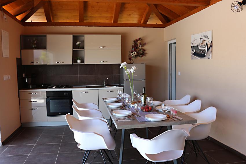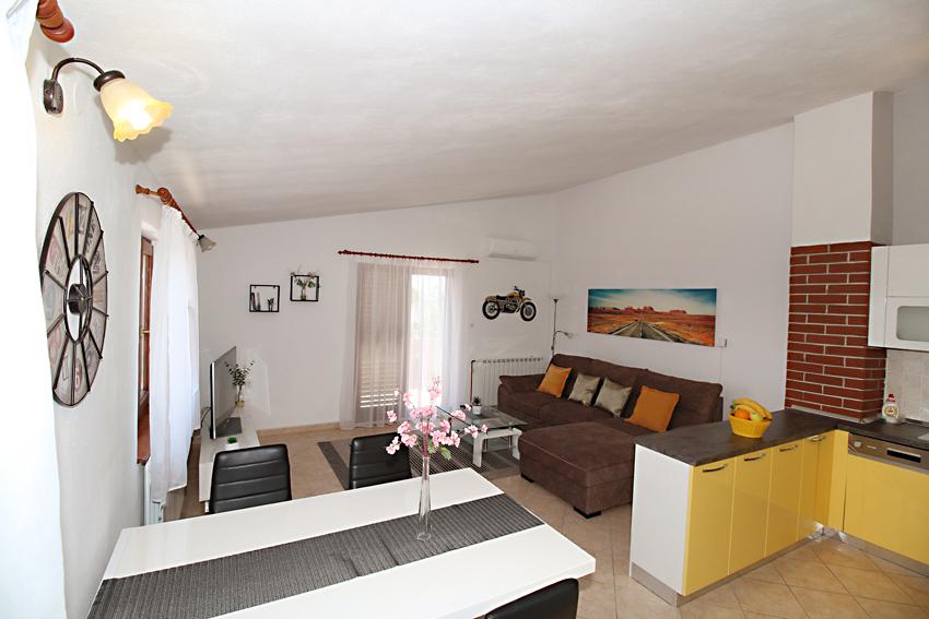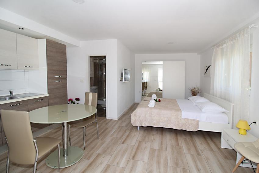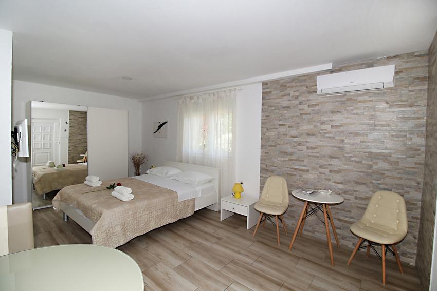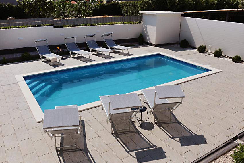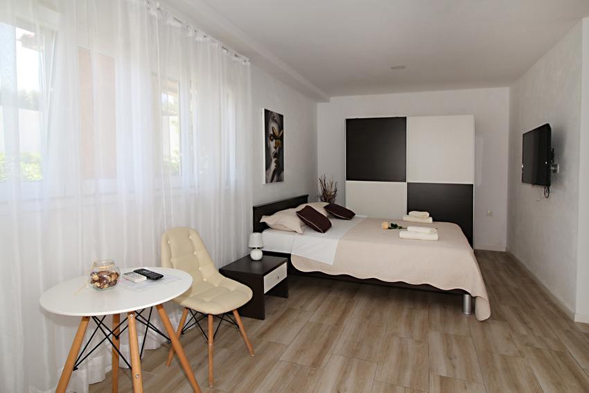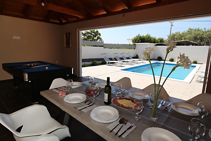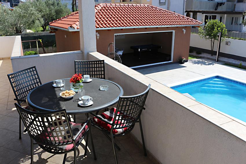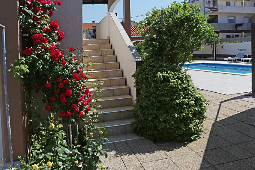 Villa Anda is located in Zadar, 3 kilometers from the city center. It consists of 3 apartments that are designed for the same group of guests, which means that there will be no other guests in the building except you. Upstairs apartment consists of 2 bedrooms, one with a double bed and the other with a single bed. The apartment also has a TV, air conditioning, bathroom and kitchen with all necessary cutlery. On the ground floor there are 2 studio apartments of equal size and each has a TV, air conditioning, double bed for 2 people, private bathroom and kitchen with all necessary utensils. In the yard there is a swimming pool 8x4 meters and in front of it is a room with a fully equipped summer kitchen and toilet where there is a shared washing machine. Next to the barbecue and swings for children. Guests have 3 covered parking spaces.