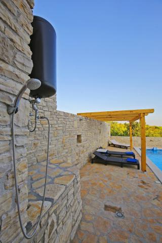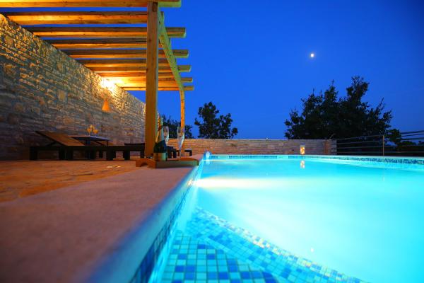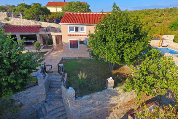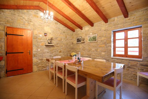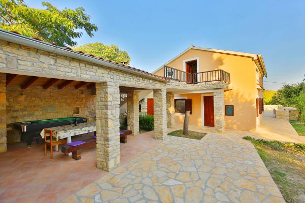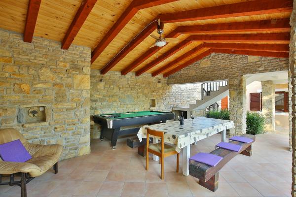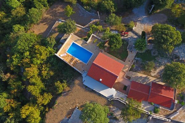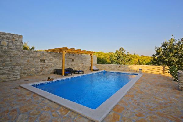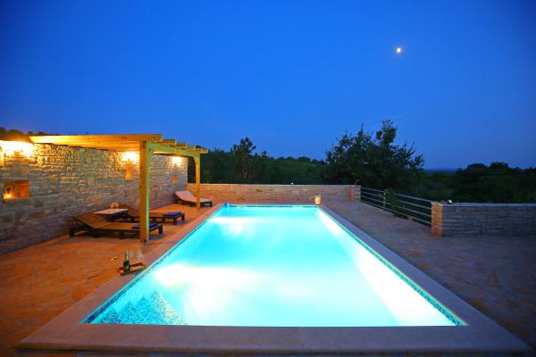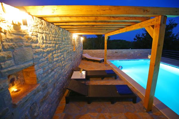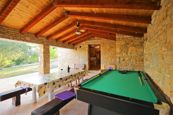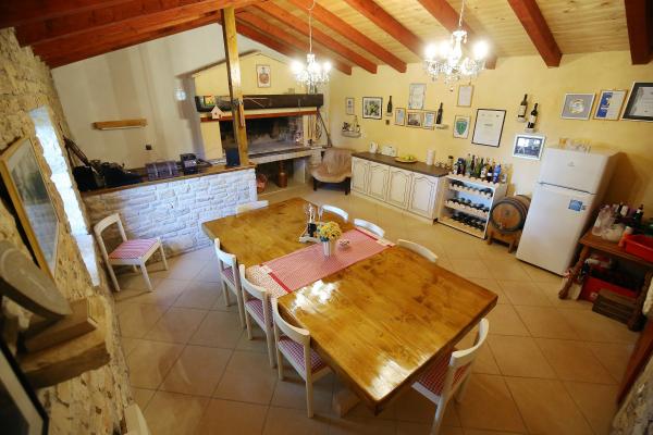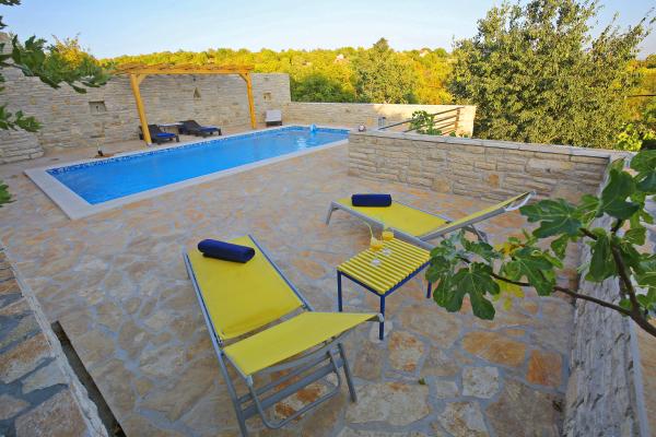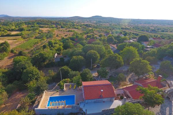 Fully furnished villa with pool in the hinterland of Zadar, Ravni districts, known for its baptismal country, a strong stone and extraordinary wine. Villa extends to possession of 3000 m2, which is completely fenced with traditional in stone. Also, as part of the villa is a traditional tavern, also built in stone, the size of 35 m2, with its fireplace, fully equipped kitchen and a massive wooden table for 12 people. Besides the indoor fireplace, there is also available and outdoor fireplace in the courtyard of the villa. The villa itself is on two floors, equipped with standard modern furniture, with two living rooms and bathrooms, and four bedrooms in which there are massive beds made of oak trees. Land provides a range of options, but the guests can use the outdoor swimming pool of 8 x 5 meters with a sunny terrace, two large (stone and wood) out of the table with a natural shade of ancient trees, small mobile gym, pool table, as well as bicycles which are free to use.