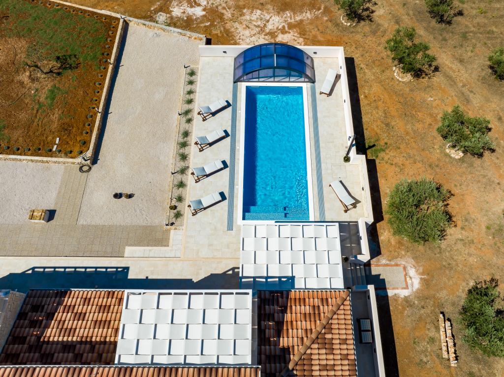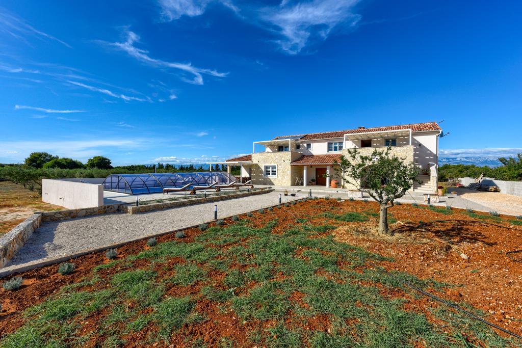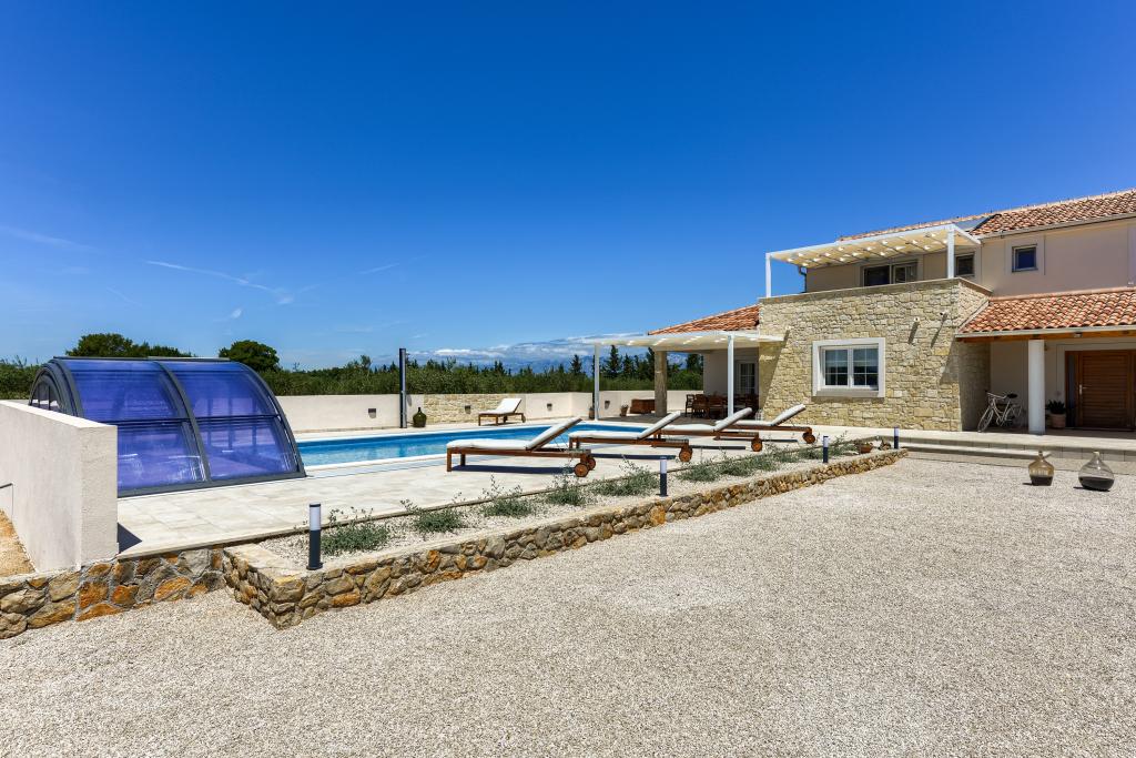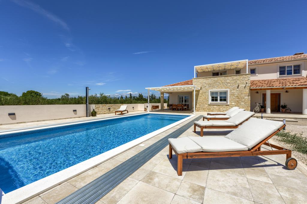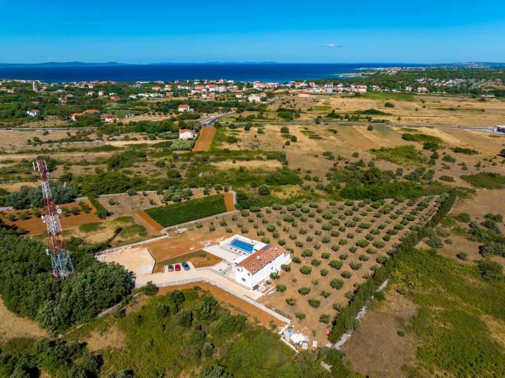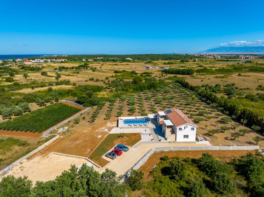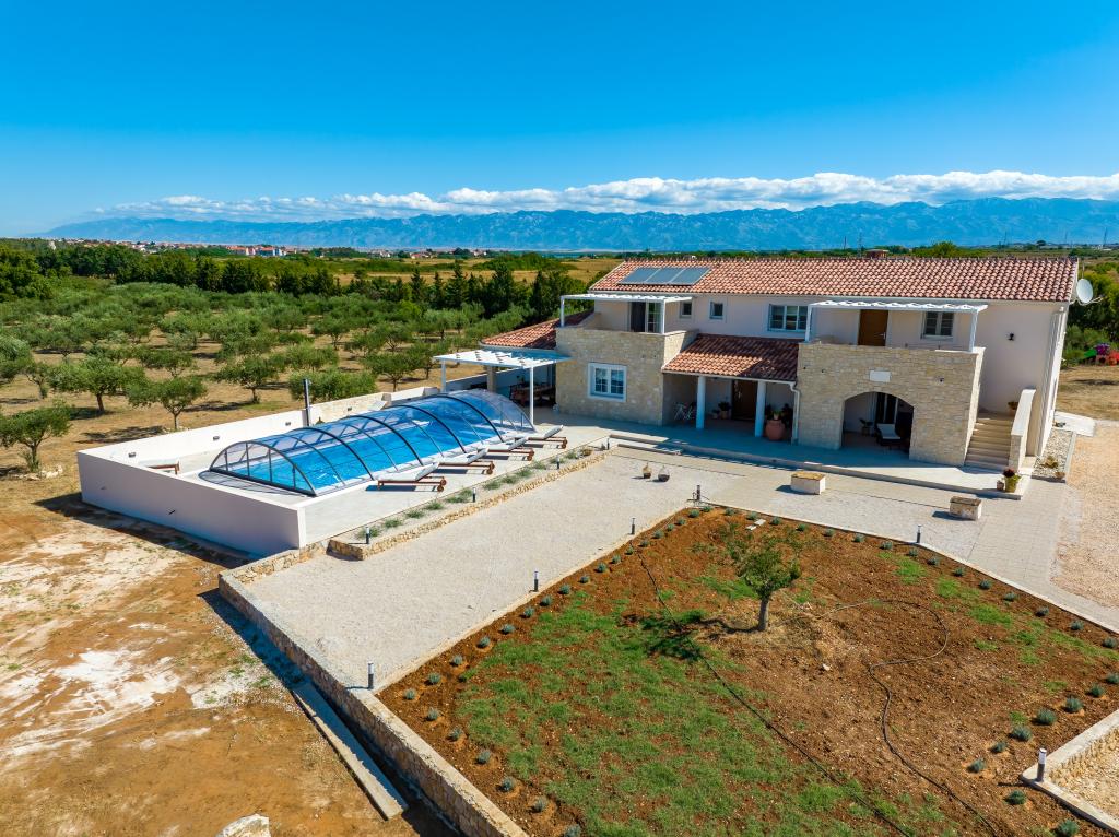 Villa Perosa is a holiday house built in a rustic style in 2022, with a heated and covered swimming pool, located in the tourist resort of Zaton, Nin, on a fenced plot of 9000 m2, surrounded by 150 olive trees and nature. Our vacation home is designed to consist of two apartments, the main apartment consisting of an entrance hall, bathroom, living room and dining room with kitchen. The internal stairs lead to the first floor where there are: a master bedroom with a bathroom and access to the terrace, two bedrooms and a bathroom. The second smaller apartment, which is accessed via external stairs and a veranda, consists of a living room, a kitchen, a corridor leading to the bedroom and a bathroom. All spaces are heated and air-conditioned. Living rooms and bedrooms have televisions with satellite programs and Internet. The entire holiday home is covered by wireless 5G internet. The house is rented as a single unit. Our swimming pool with heating and mobile cover enables use throughout the year as well as safety for children. Villa Perosa is an oasis that can serve as a base for visiting the sandy beaches in Zaton and Nin as well as exploring historical sights and modern attractions, the "Sea Organ", "Greetings to the Sun", the cities of Zadar and Nin. The Zadar archipelago is full