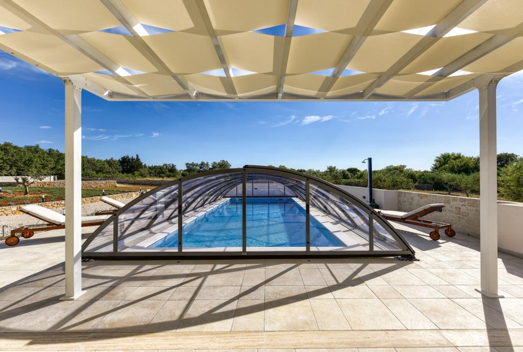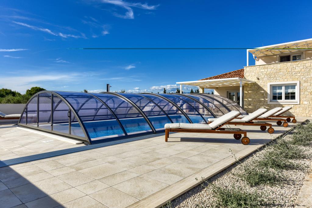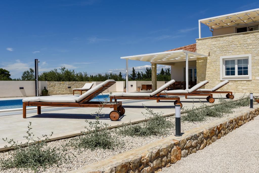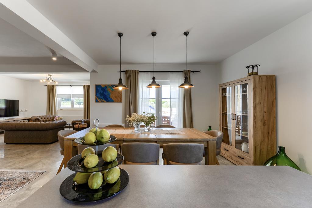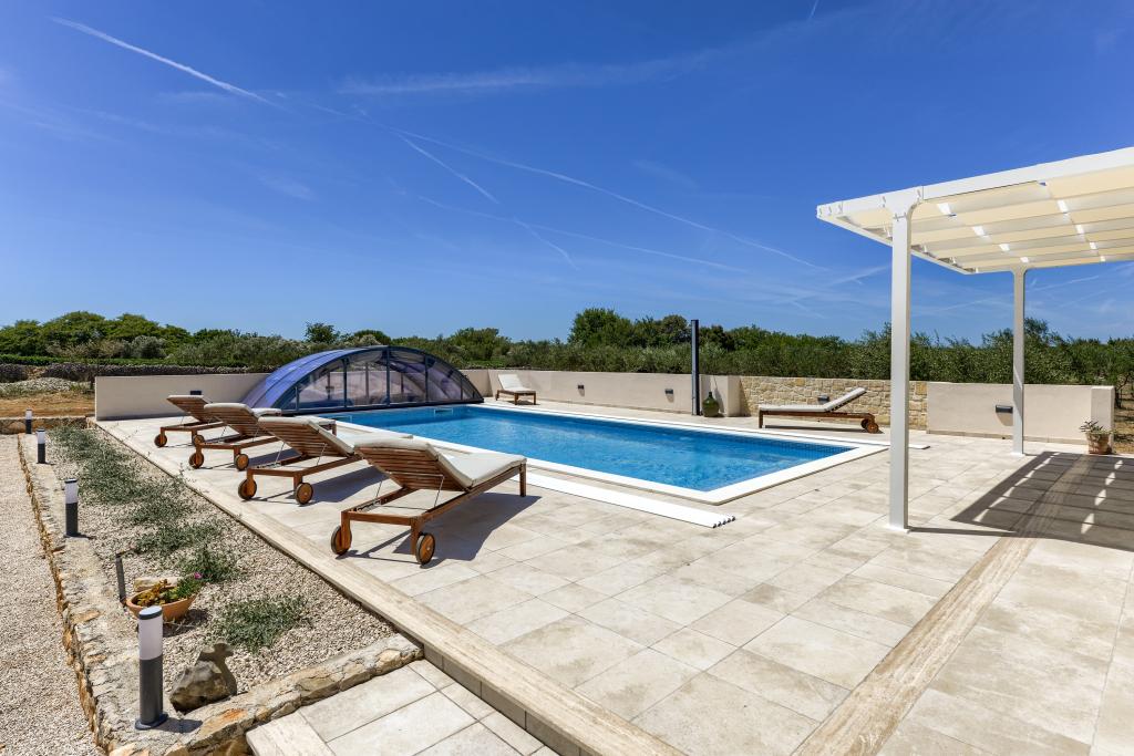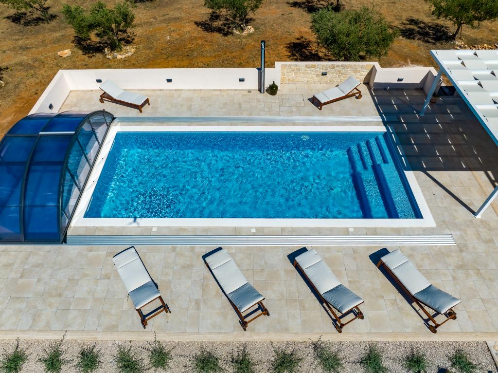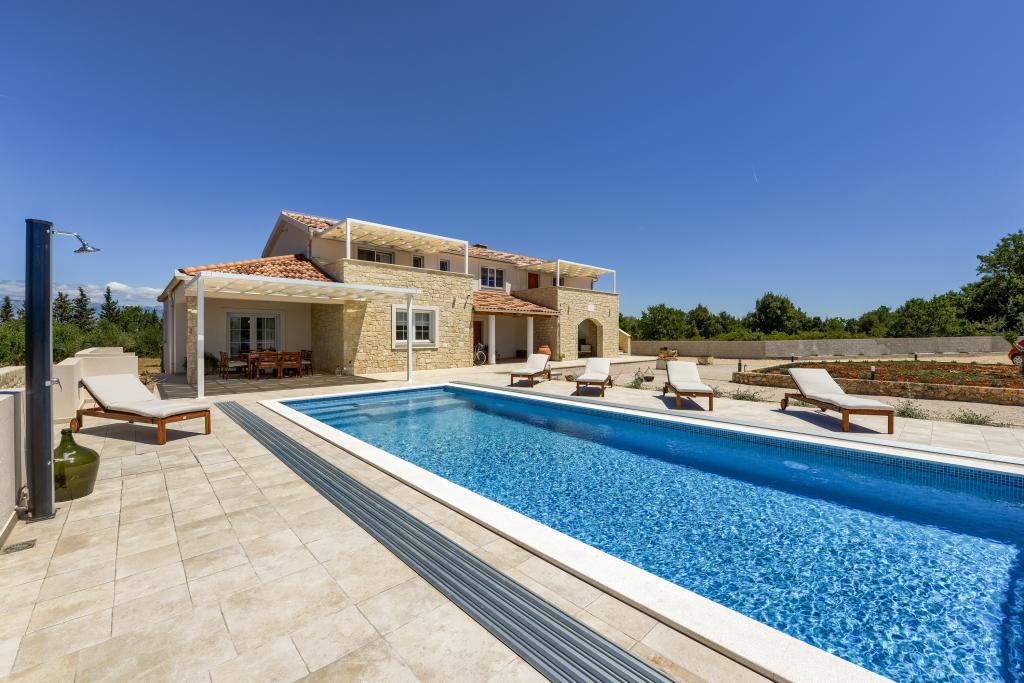 Villa Perosa is a holiday house built in a rustic style in 2022, with a heated and covered swimming pool, located in the tourist resort of Zaton, Nin, on a fenced plot of 9000 m2, surrounded by 150 olive trees and nature. Our vacation home is designed to consist of two apartments, the main apartment consisting of an entrance hall, bathroom, living room and dining room with kitchen. The internal stairs lead to the first floor where there are: a master bedroom with a bathroom and access to the terrace, two bedrooms and a bathroom. The second smaller apartment, which is accessed via external stairs and a veranda, consists of a living room, a kitchen, a corridor leading to the bedroom and a bathroom. All spaces are heated and air-conditioned. Living rooms and bedrooms have televisions with satellite programs and Internet. The entire holiday home is covered by wireless 5G internet. The house is rented as a single unit. Our swimming pool with heating and mobile cover enables use throughout the year as well as safety for children. Villa Perosa is an oasis that can serve as a base for visiting the sandy beaches in Zaton and Nin as well as exploring historical sights and modern attractions, the "Sea Organ", "Greetings to the Sun", the cities of Zadar and Nin. The Zadar archipelago is full