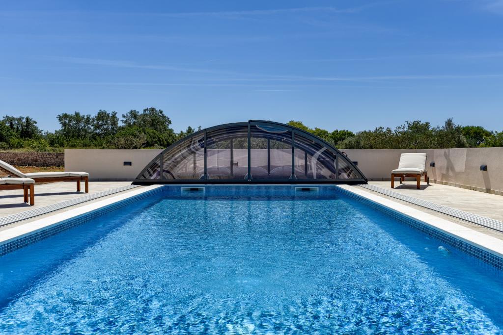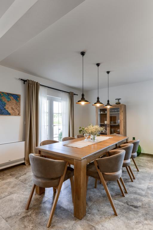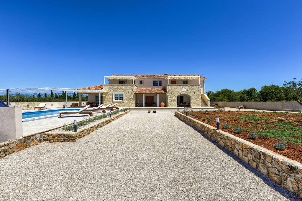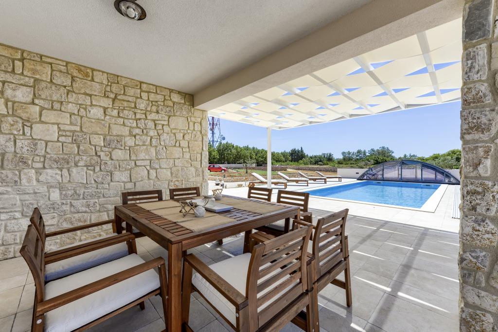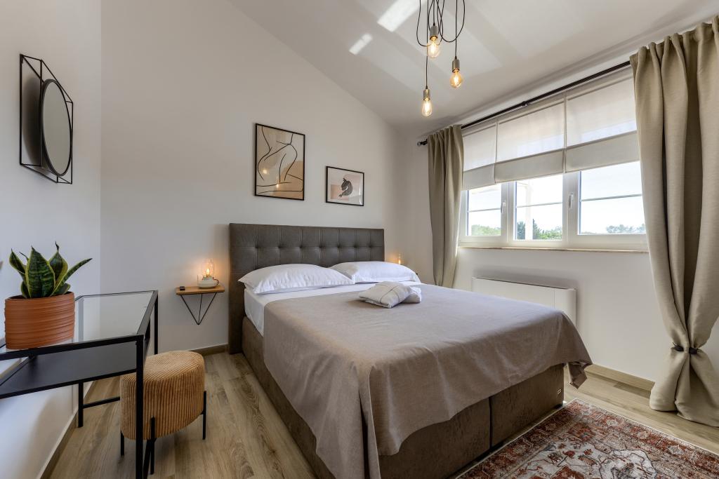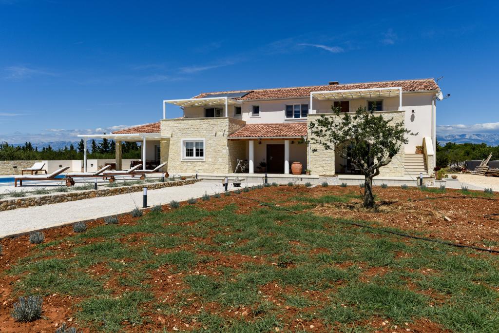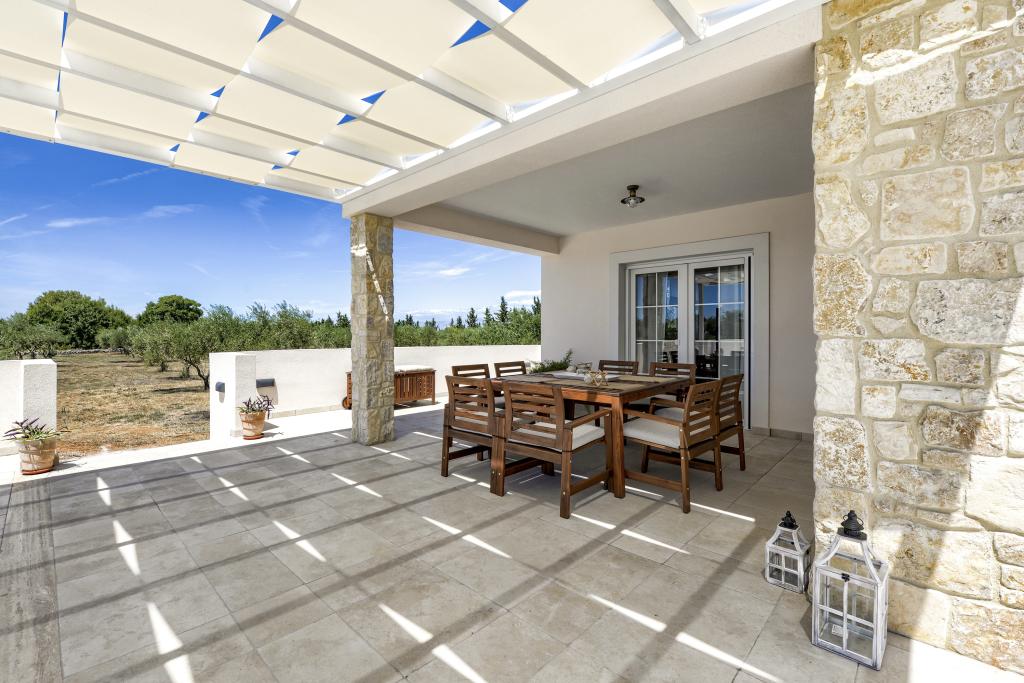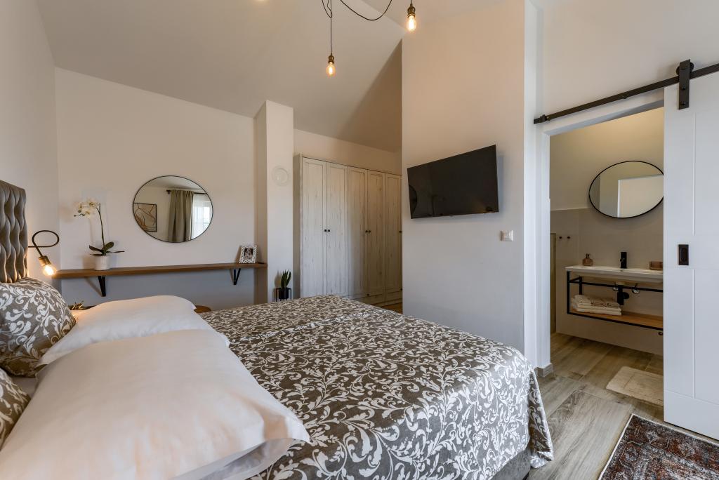 Villa Perosa is a holiday house built in a rustic style in 2022, with a heated and covered swimming pool, located in the tourist resort of Zaton, Nin, on a fenced plot of 9000 m2, surrounded by 150 olive trees and nature. Our vacation home is designed to consist of two apartments, the main apartment consisting of an entrance hall, bathroom, living room and dining room with kitchen. The internal stairs lead to the first floor where there are: a master bedroom with a bathroom and access to the terrace, two bedrooms and a bathroom. The second smaller apartment, which is accessed via external stairs and a veranda, consists of a living room, a kitchen, a corridor leading to the bedroom and a bathroom. All spaces are heated and air-conditioned. Living rooms and bedrooms have televisions with satellite programs and Internet. The entire holiday home is covered by wireless 5G internet. The house is rented as a single unit. Our swimming pool with heating and mobile cover enables use throughout the year as well as safety for children. Villa Perosa is an oasis that can serve as a base for visiting the sandy beaches in Zaton and Nin as well as exploring historical sights and modern attractions, the "Sea Organ", "Greetings to the Sun", the cities of Zadar and Nin. The Zadar archipelago is full