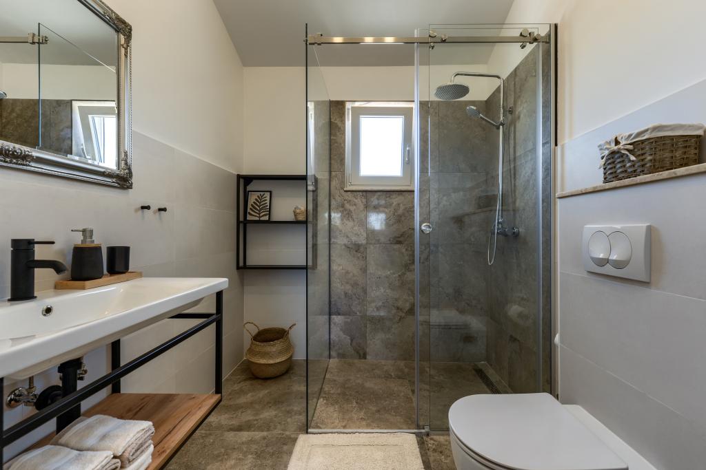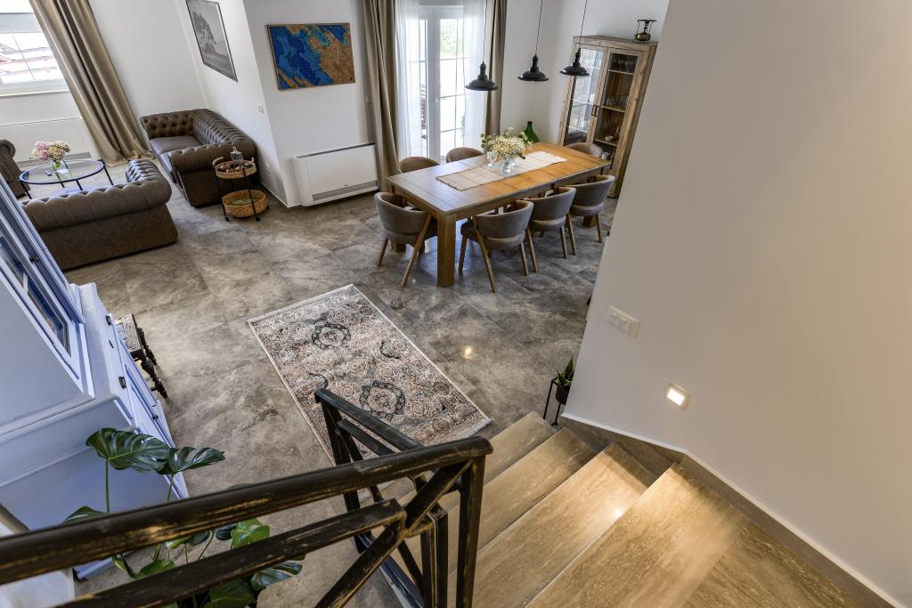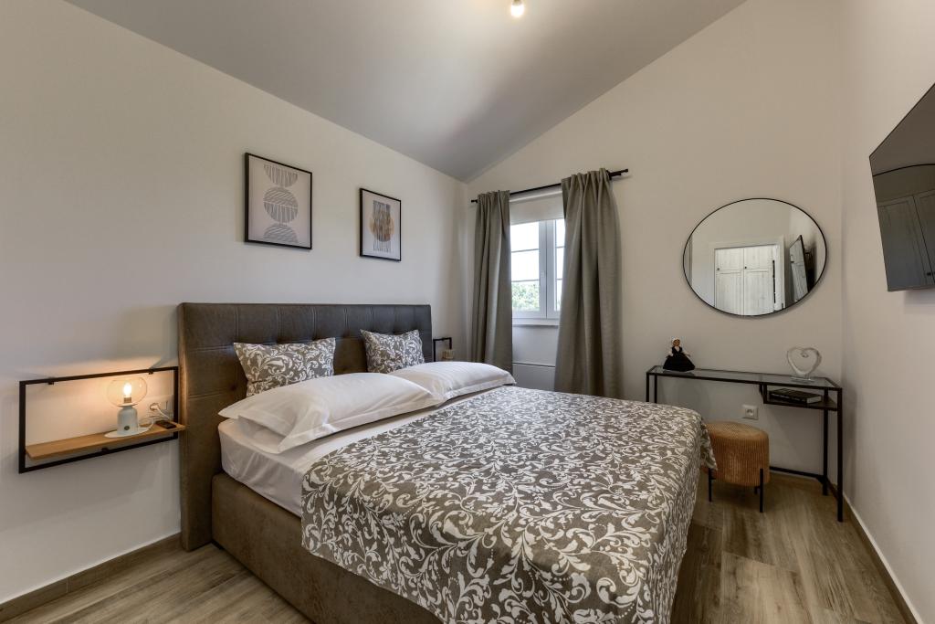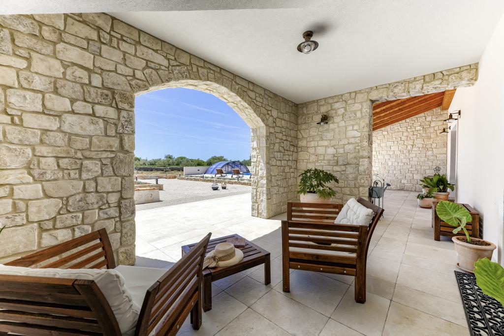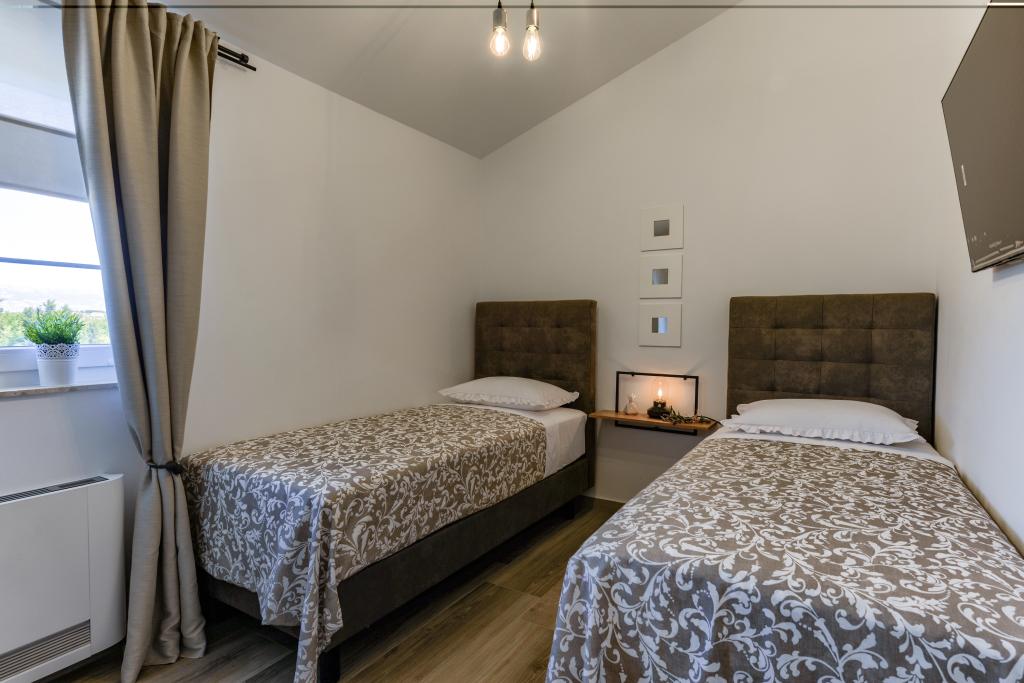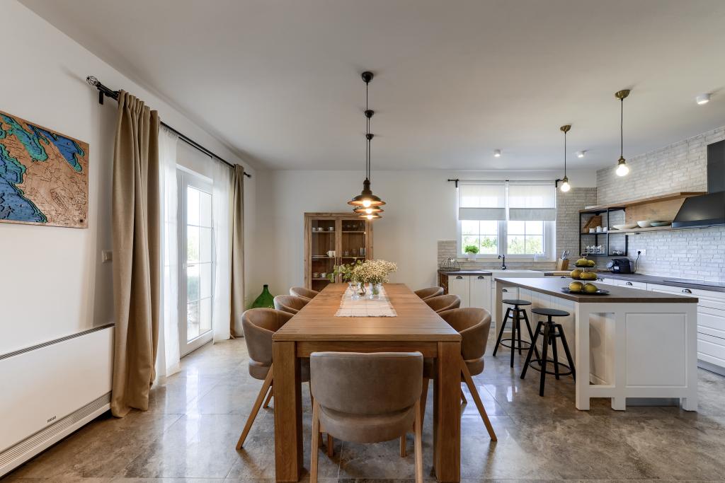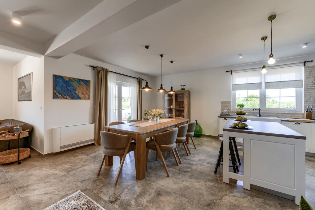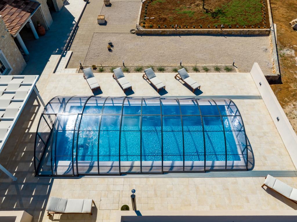 Villa Perosa is a holiday house built in a rustic style in 2022, with a heated and covered swimming pool, located in the tourist resort of Zaton, Nin, on a fenced plot of 9000 m2, surrounded by 150 olive trees and nature. Our vacation home is designed to consist of two apartments, the main apartment consisting of an entrance hall, bathroom, living room and dining room with kitchen. The internal stairs lead to the first floor where there are: a master bedroom with a bathroom and access to the terrace, two bedrooms and a bathroom. The second smaller apartment, which is accessed via external stairs and a veranda, consists of a living room, a kitchen, a corridor leading to the bedroom and a bathroom. All spaces are heated and air-conditioned. Living rooms and bedrooms have televisions with satellite programs and Internet. The entire holiday home is covered by wireless 5G internet. The house is rented as a single unit. Our swimming pool with heating and mobile cover enables use throughout the year as well as safety for children. Villa Perosa is an oasis that can serve as a base for visiting the sandy beaches in Zaton and Nin as well as exploring historical sights and modern attractions, the "Sea Organ", "Greetings to the Sun", the cities of Zadar and Nin. The Zadar archipelago is full